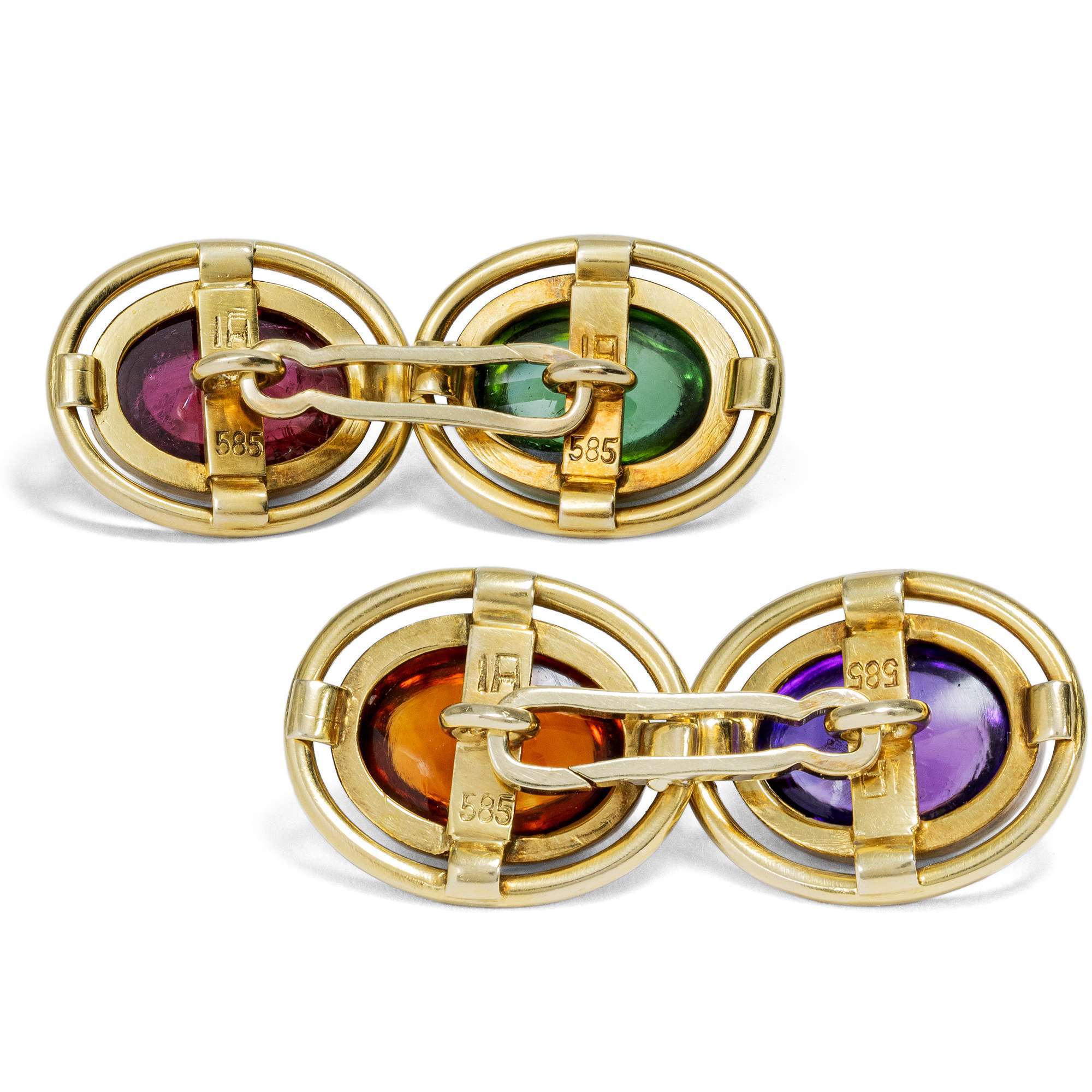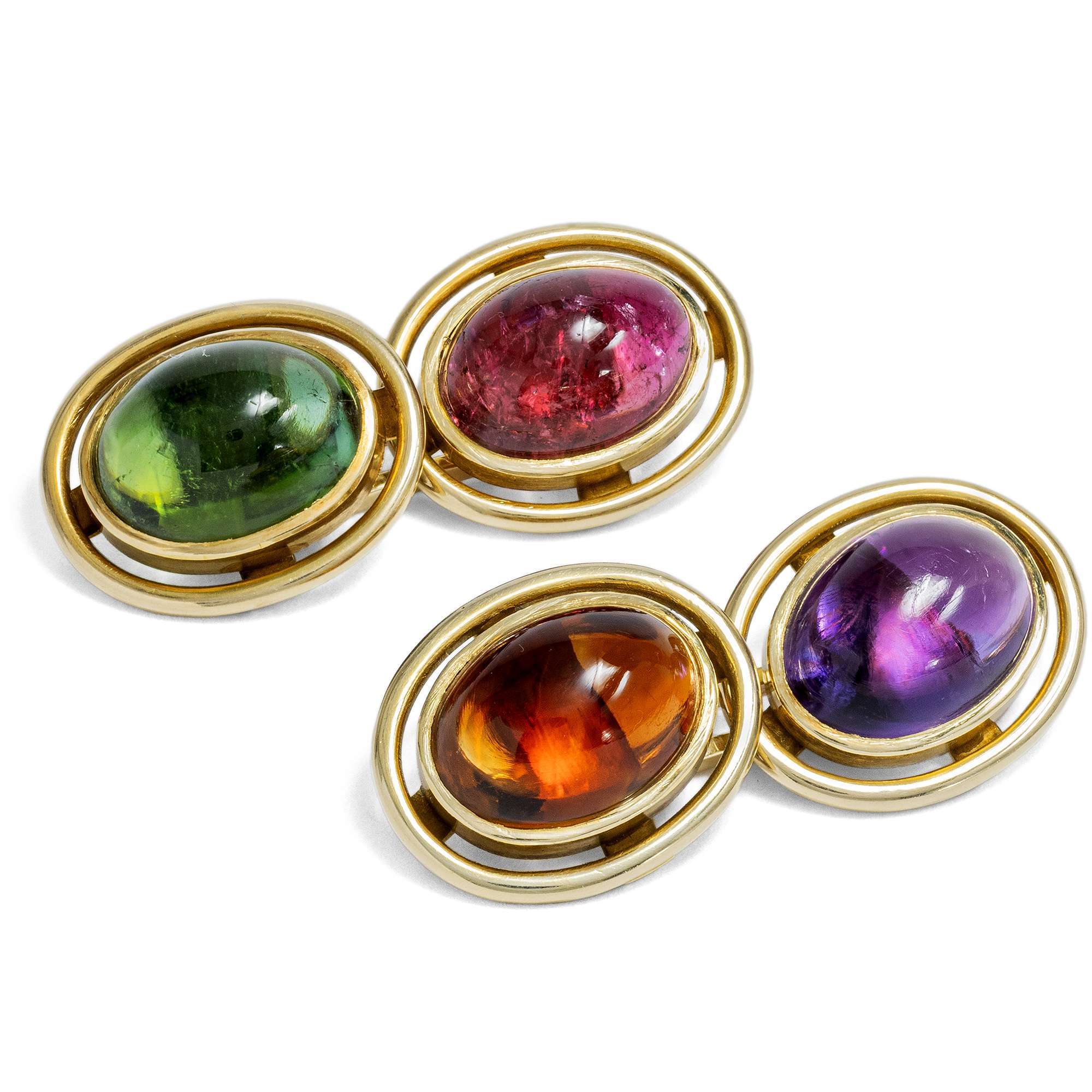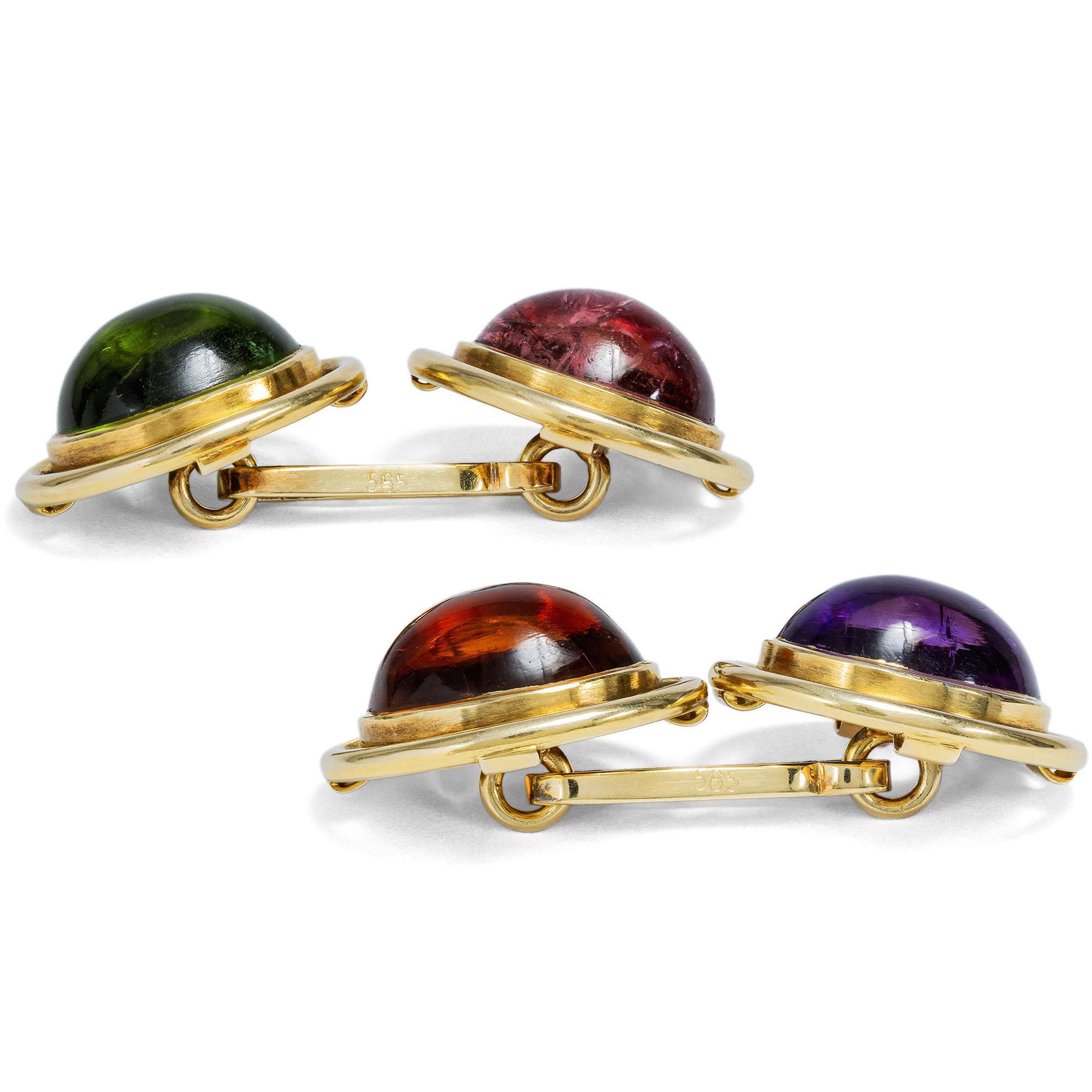 Einen besonders farbenfrohen Anblick bietet das vorliegende Paar Manschettenknöpfe aus den Jahren des deutschen Wirtschaftswunders. Die um 1955 gefertigten Knöpfe präsentieren je einen natürlichen Farbstein, gefasst in Gelbgold: Ein Amethyst, ein Citrin, ein grüner und ein roséfarbener Turmalin sind zu ovalen Cabochons geschliffen worden.