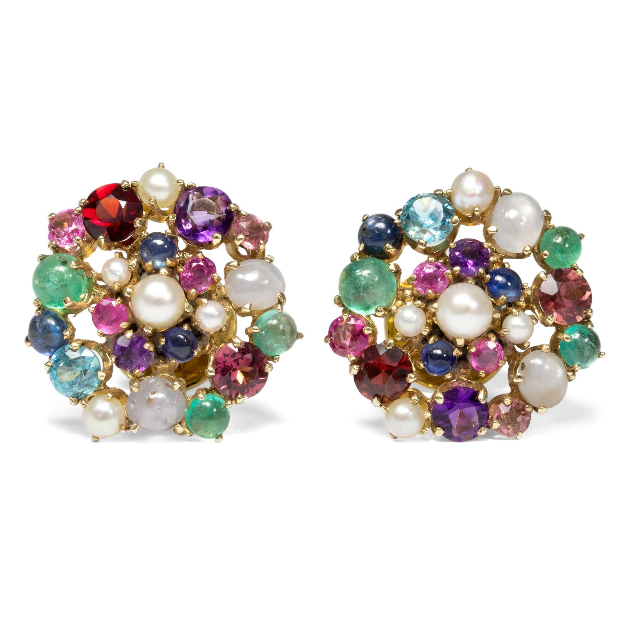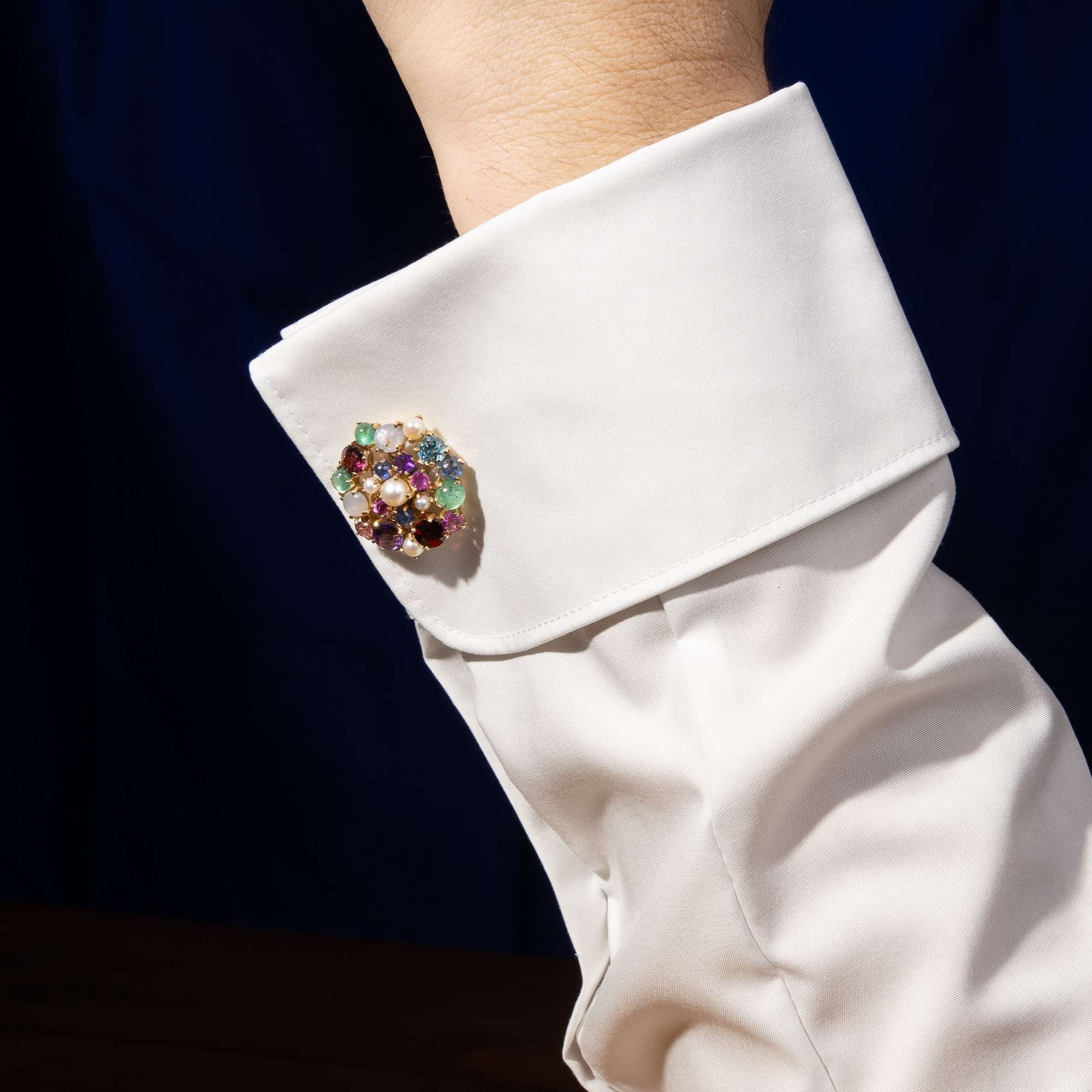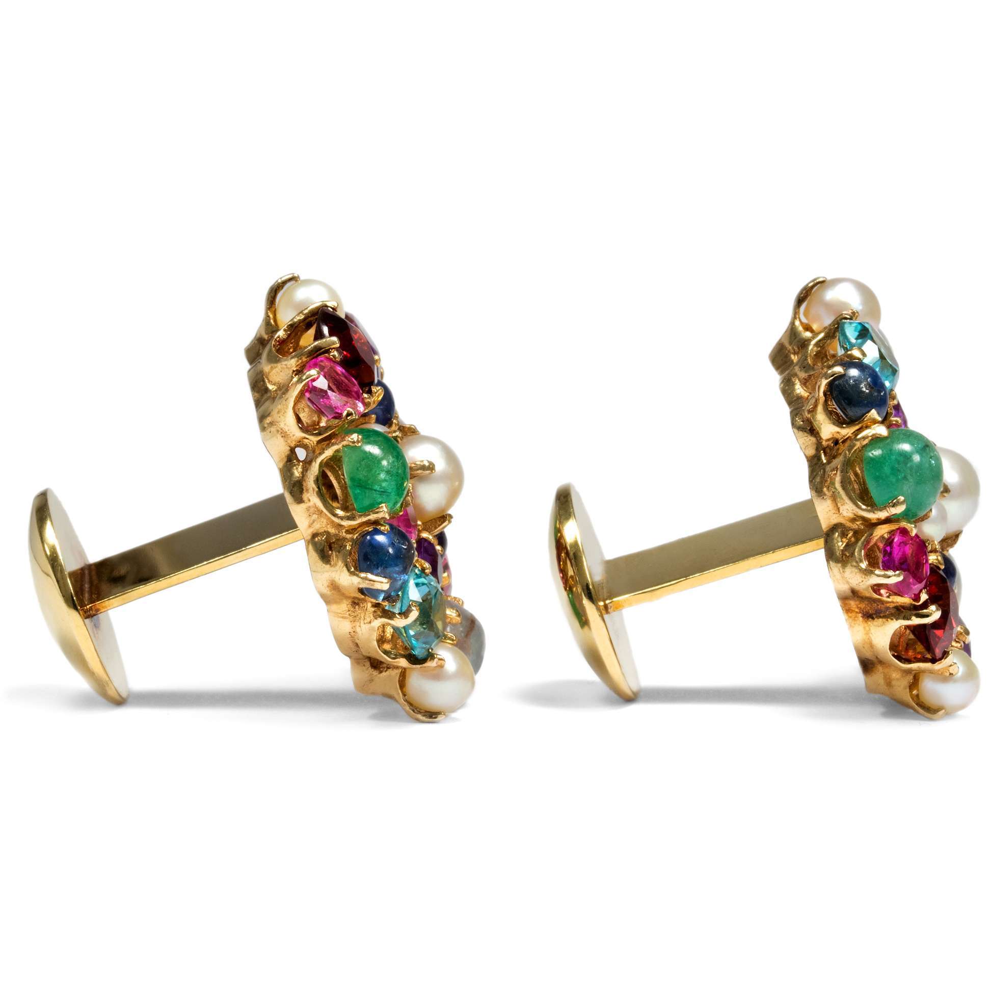 Das hier vorliegende Paar Manschettenknöpfe haben wir im Rheinland entdeckt. Insgesamt 34 feine Edelsteine und 10 Perlen machen die Schauseiten der großen Knöpfe zu einem wahren Feuerwerk der Farben. Um eine zentral eingelassene Perle reihen sich Saphire, Smaragde, rosa Turmaline, Granate, Amethyste, blaue Zirkone und weiße Sternsaphire. Einen prachtvolles Arrangement, das sich im jeweils anderen Manschettenknopf effektvoll wiederholt.