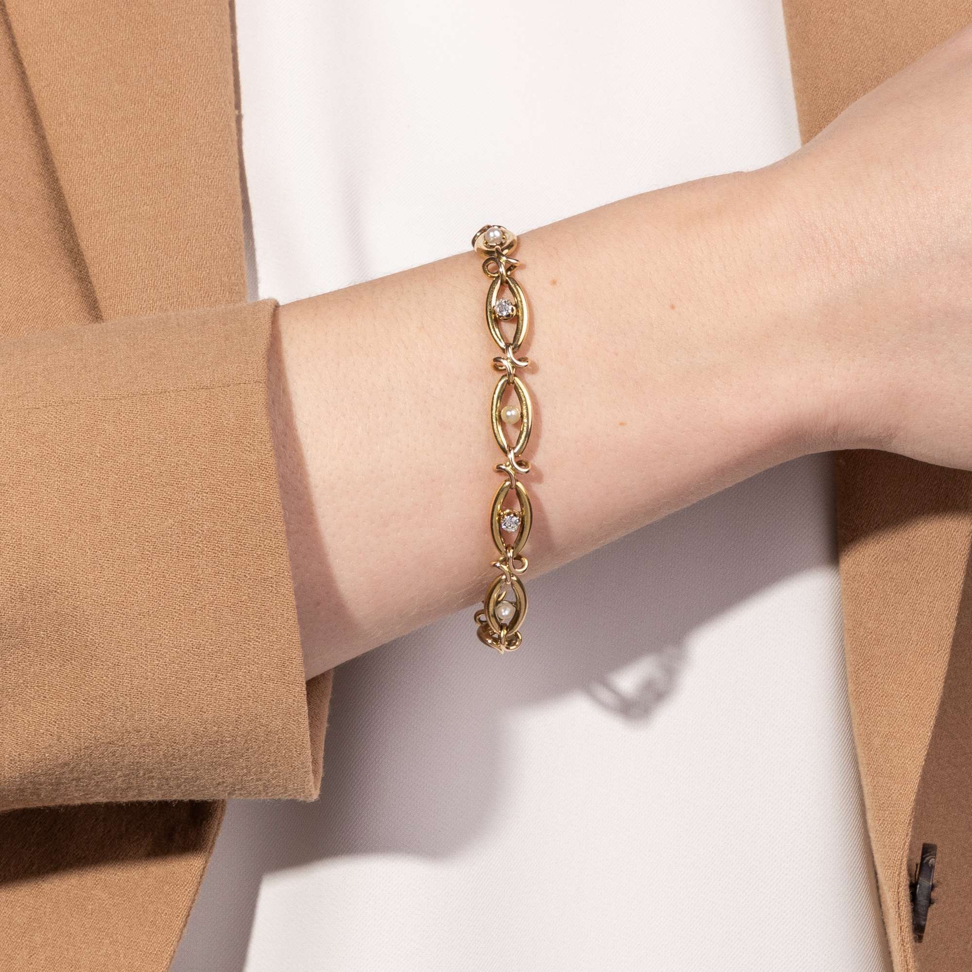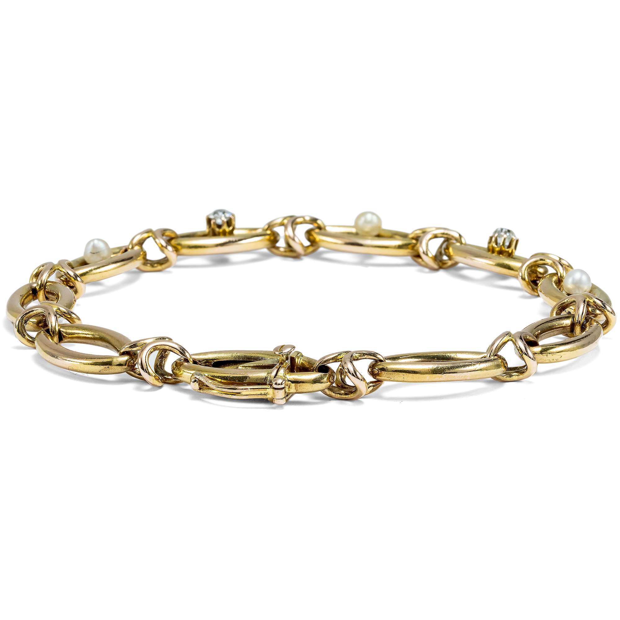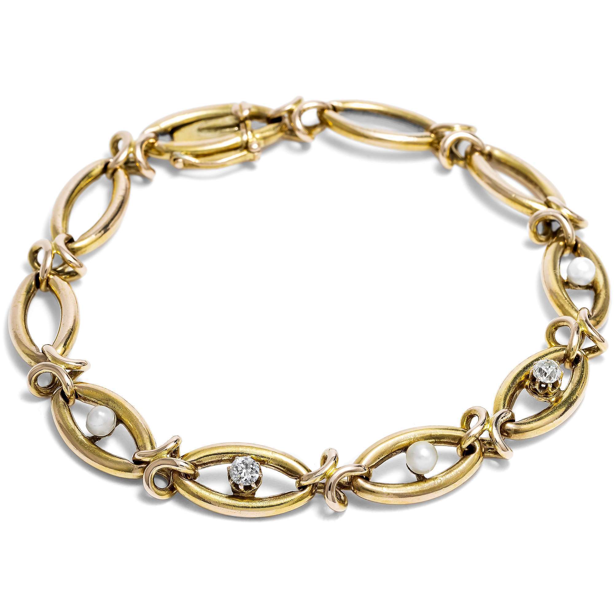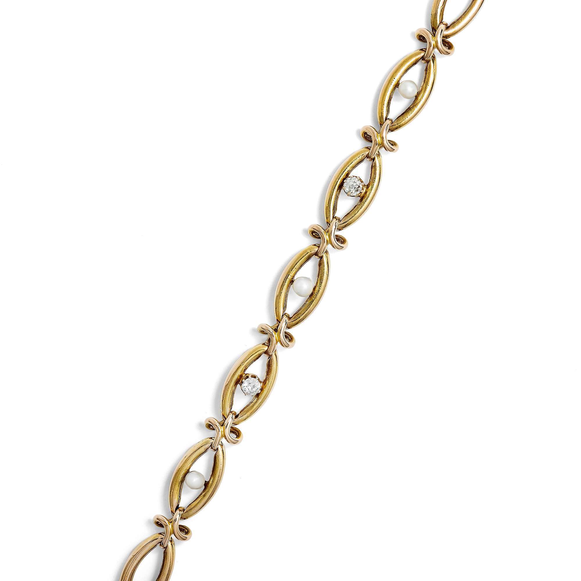 Das vorliegende Armband ist ein typischer Vertreter dieser Schmuckgattung und zeigt sich als gleichmäßiger Rapport länglicher Zierglieder, die von kreuzförmigen Spangen zusammengehalten werden. Als Höhepunkt präsentiert der Entwurf auf den mittleren fünf Gliedern zwei schöne Altschliff-Diamanten und drei natürliche Perlen.