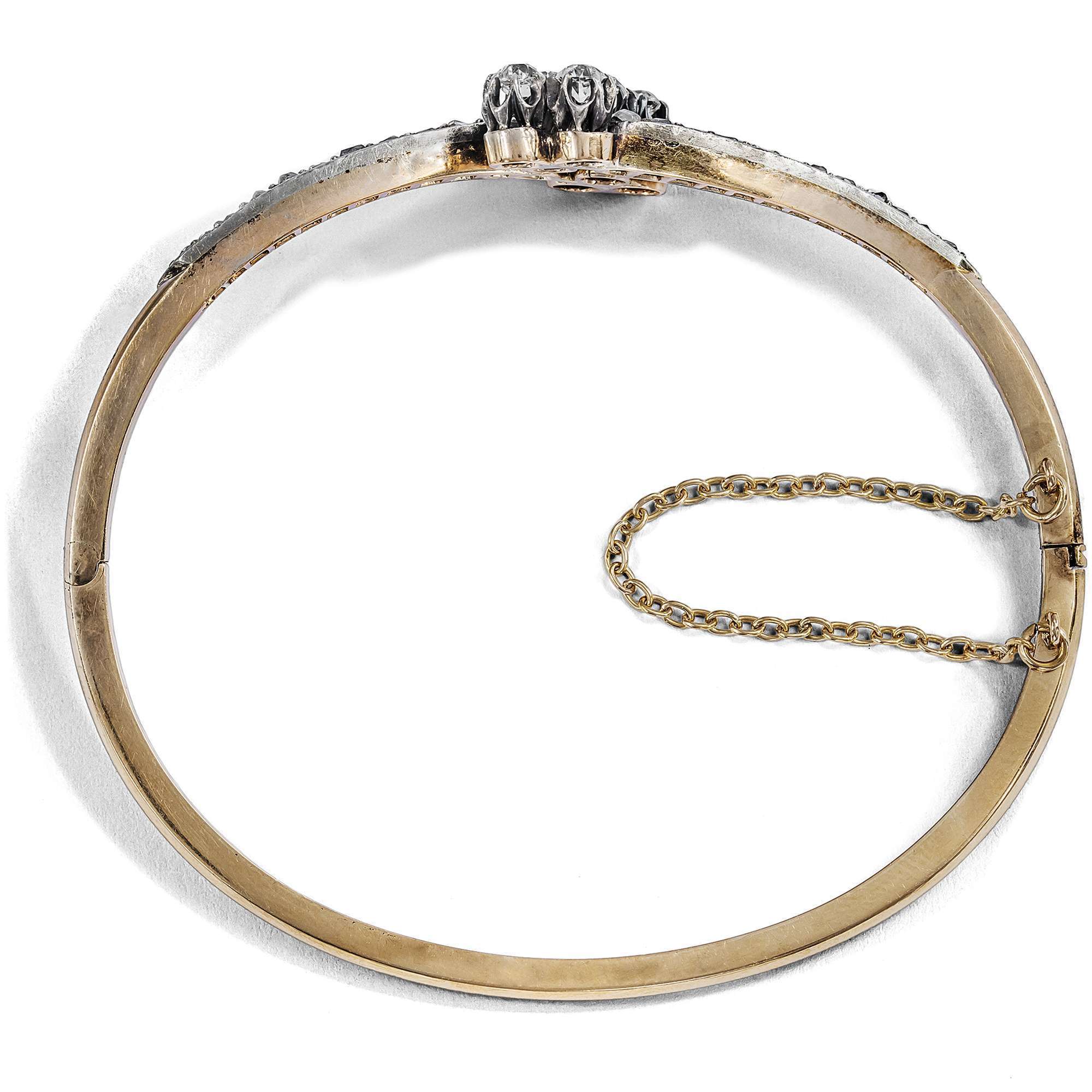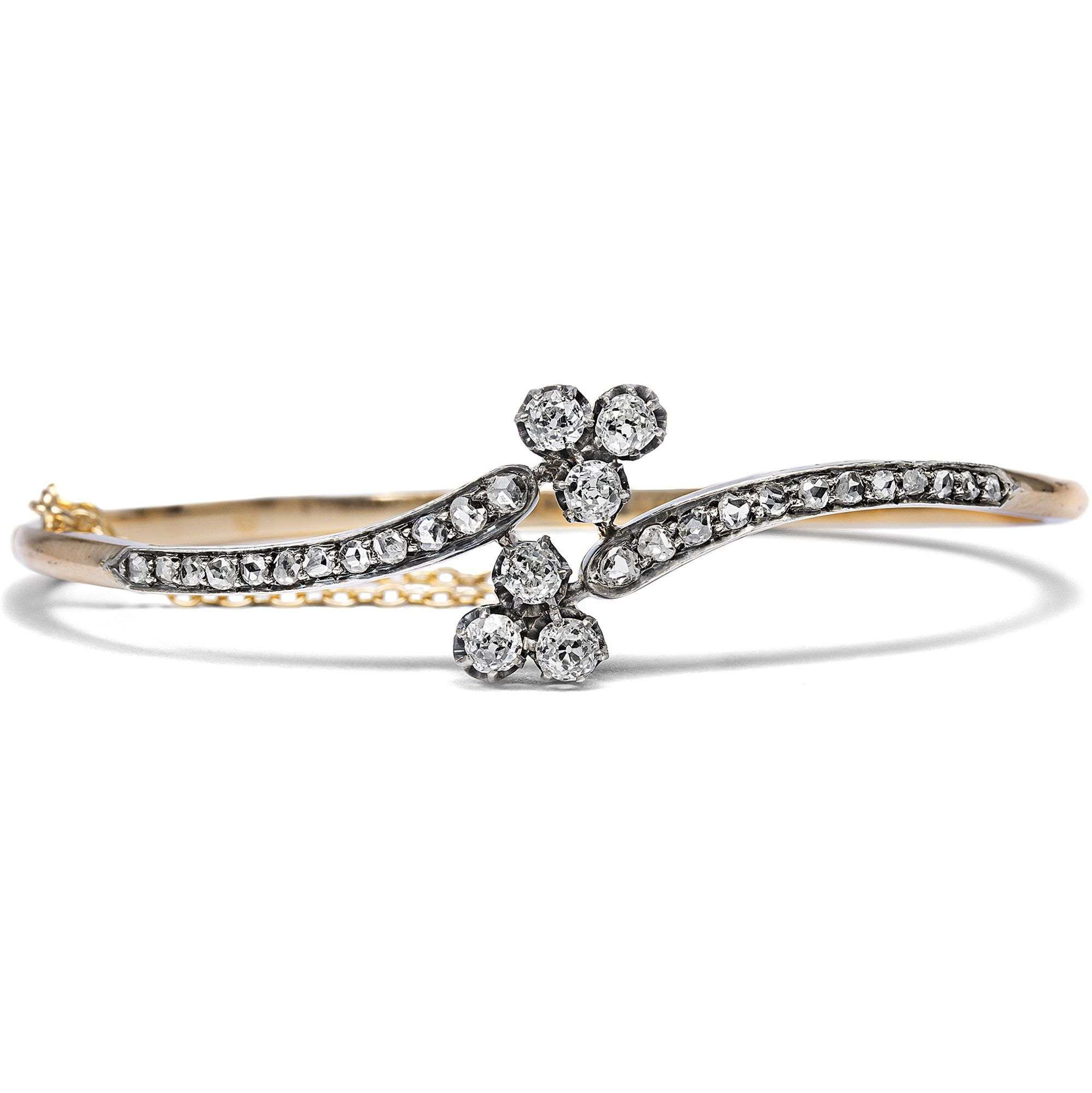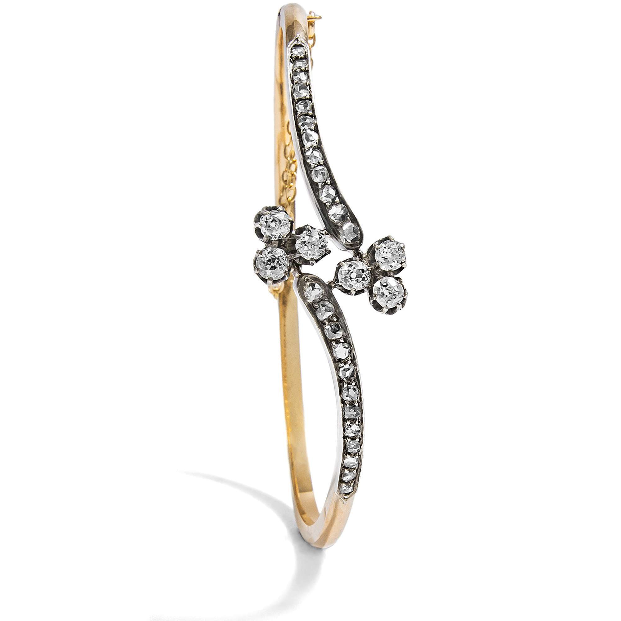 Aus dieser Zeit stammt auch der vorliegende Armreif, der aus Paris zu uns fand. Die diamantbesetzten Enden des schmalen Reifs schwingen gegenläufig aus und halten jeweils ein dreiblättriges Kleeblatt (oder die Spielkartenfarbe Treff), dessen Blätter aus Altschliff-Diamanten bestehen. Alle Diamanten sind in Silber gefasst, während der eigentliche Reif aus hochkarätigem, leicht rötlichem Gold besteht. Die Formensprache ist weich und verspielt, so wie es dem Zeitgeschmack des ausgehenden 19. Jahrhunderts entsprach.