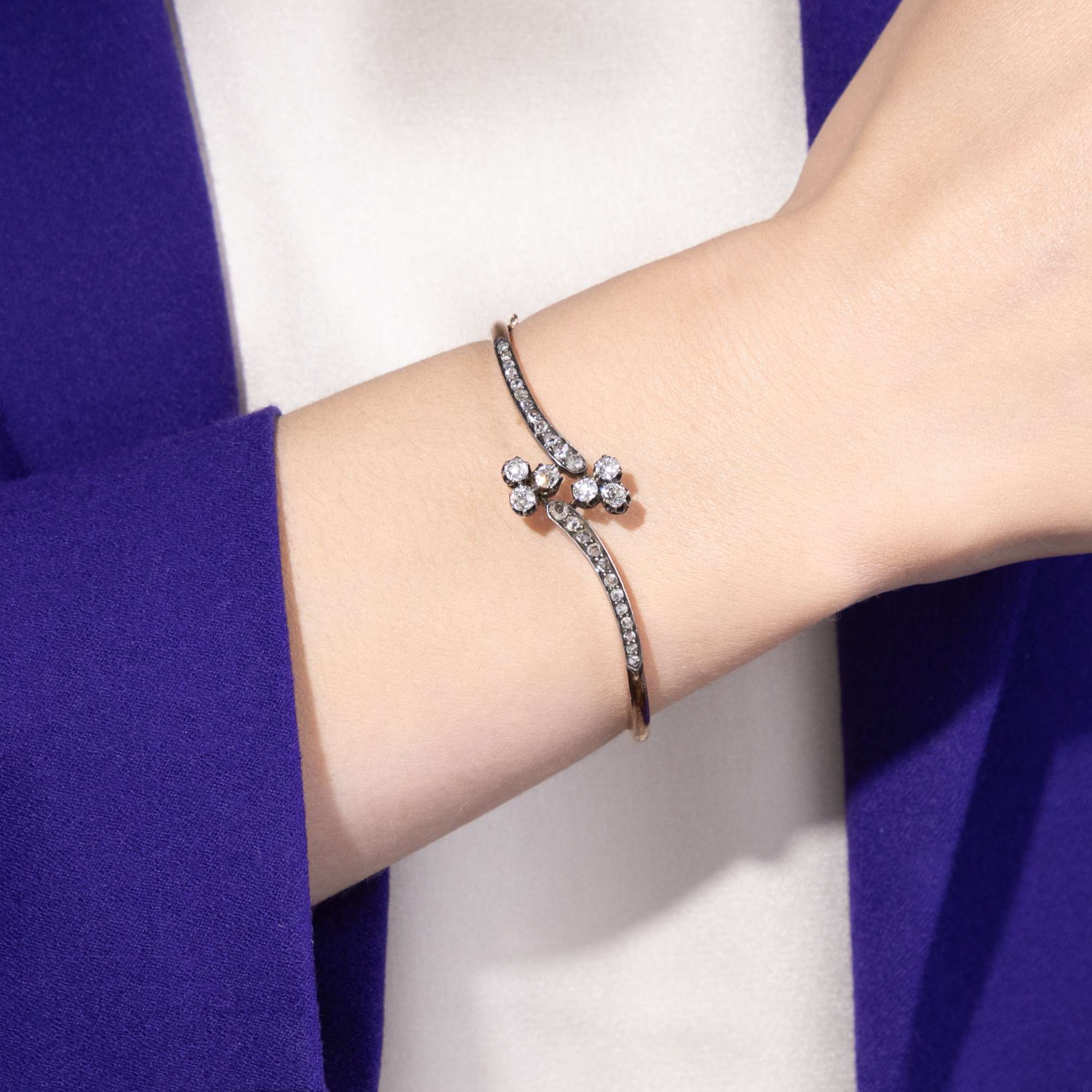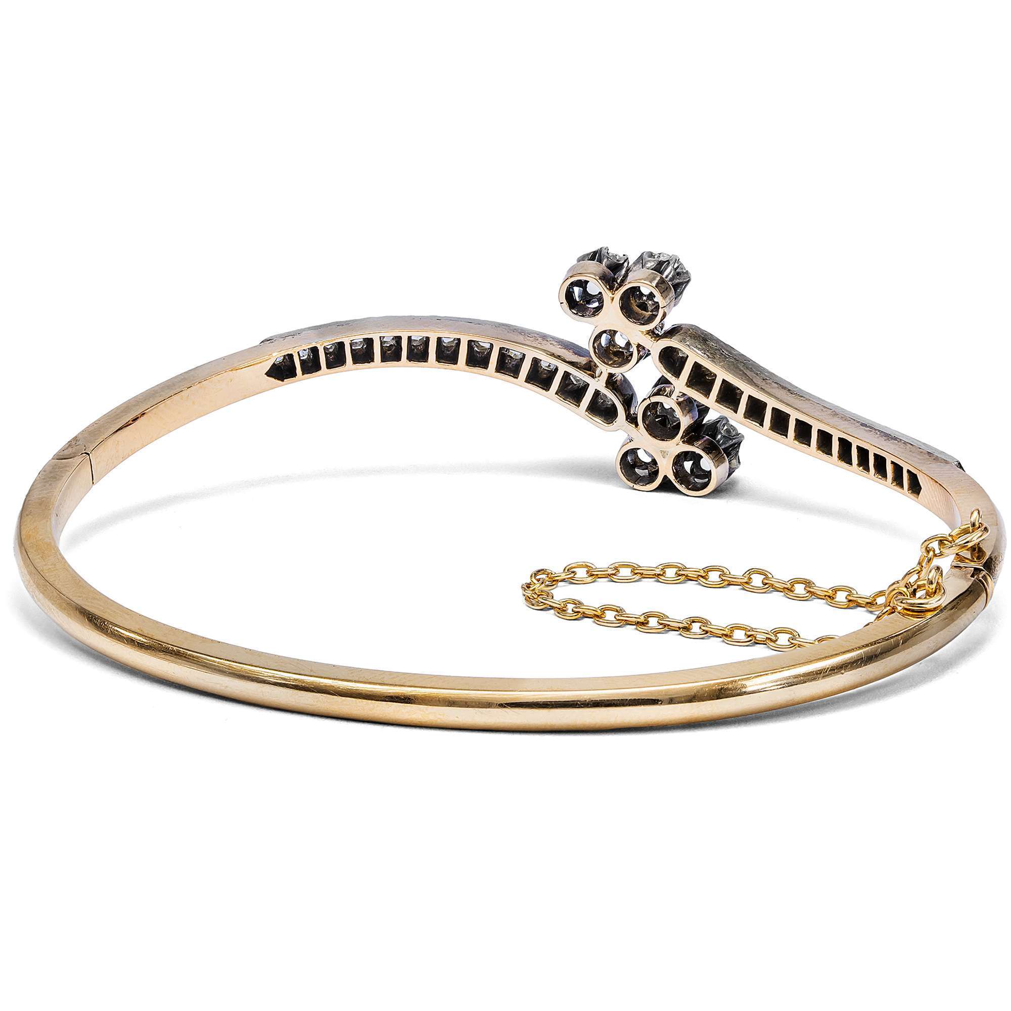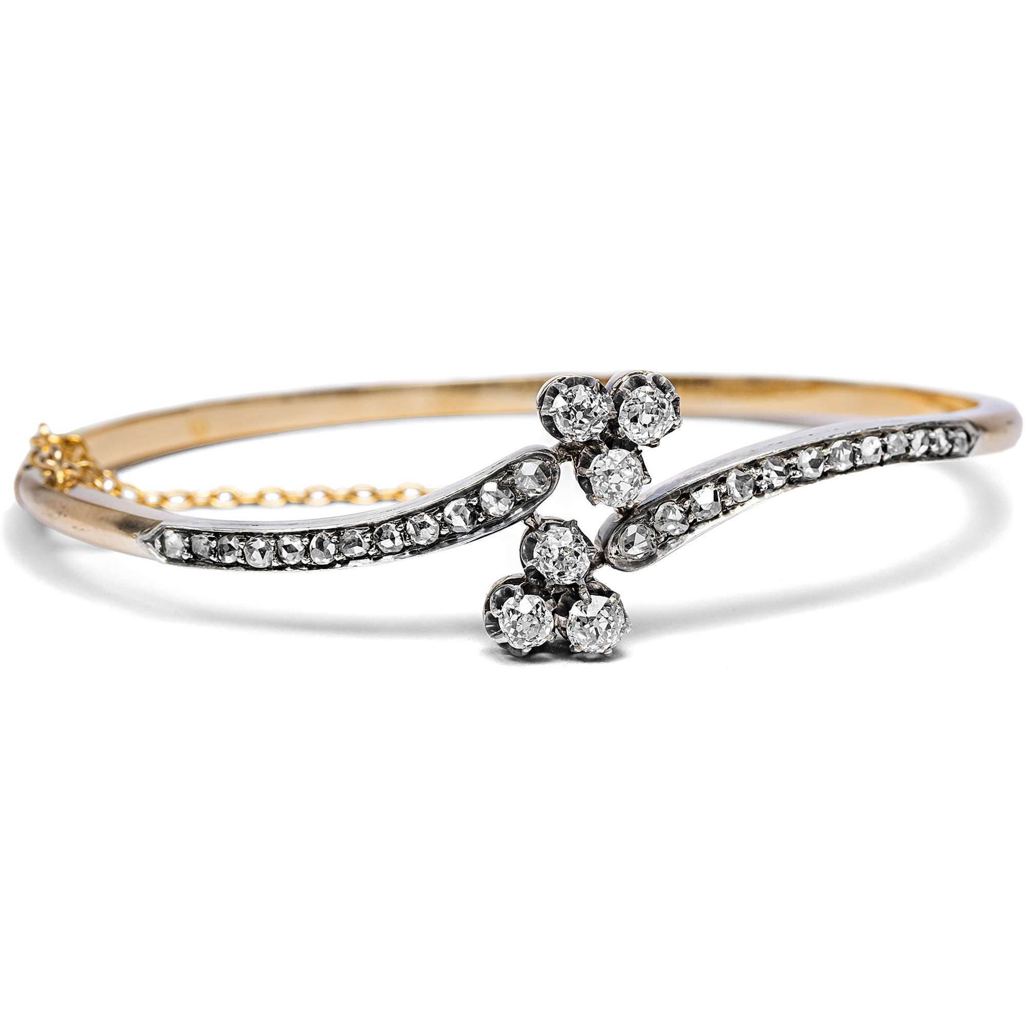 Aus dieser Zeit stammt auch der vorliegende Armreif, der aus Paris zu uns fand. Die diamantbesetzten Enden des schmalen Reifs schwingen gegenläufig aus und halten jeweils ein dreiblättriges Kleeblatt (oder die Spielkartenfarbe Treff), dessen Blätter aus Altschliff-Diamanten bestehen. Alle Diamanten sind in Silber gefasst, während der eigentliche Reif aus hochkarätigem, leicht rötlichem Gold besteht. Die Formensprache ist weich und verspielt, so wie es dem Zeitgeschmack des ausgehenden 19. Jahrhunderts entsprach.