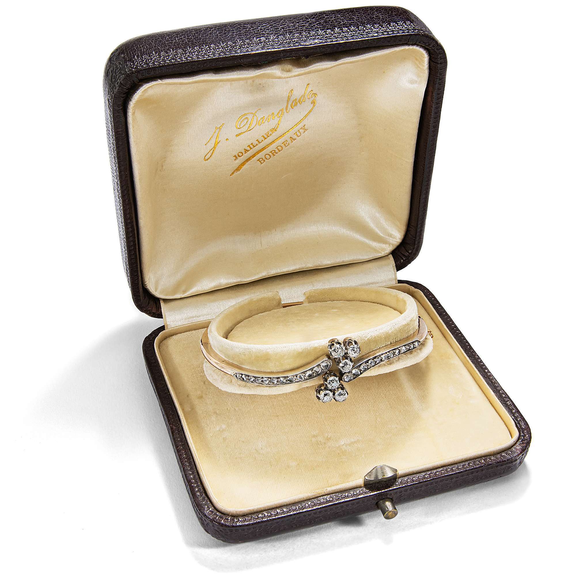 | Weiteres: | Lieferung in originalen Lederetui des Juweliers J. Dangladez, Bordeaux, auf dem Etui Monogramm „G.L“ |