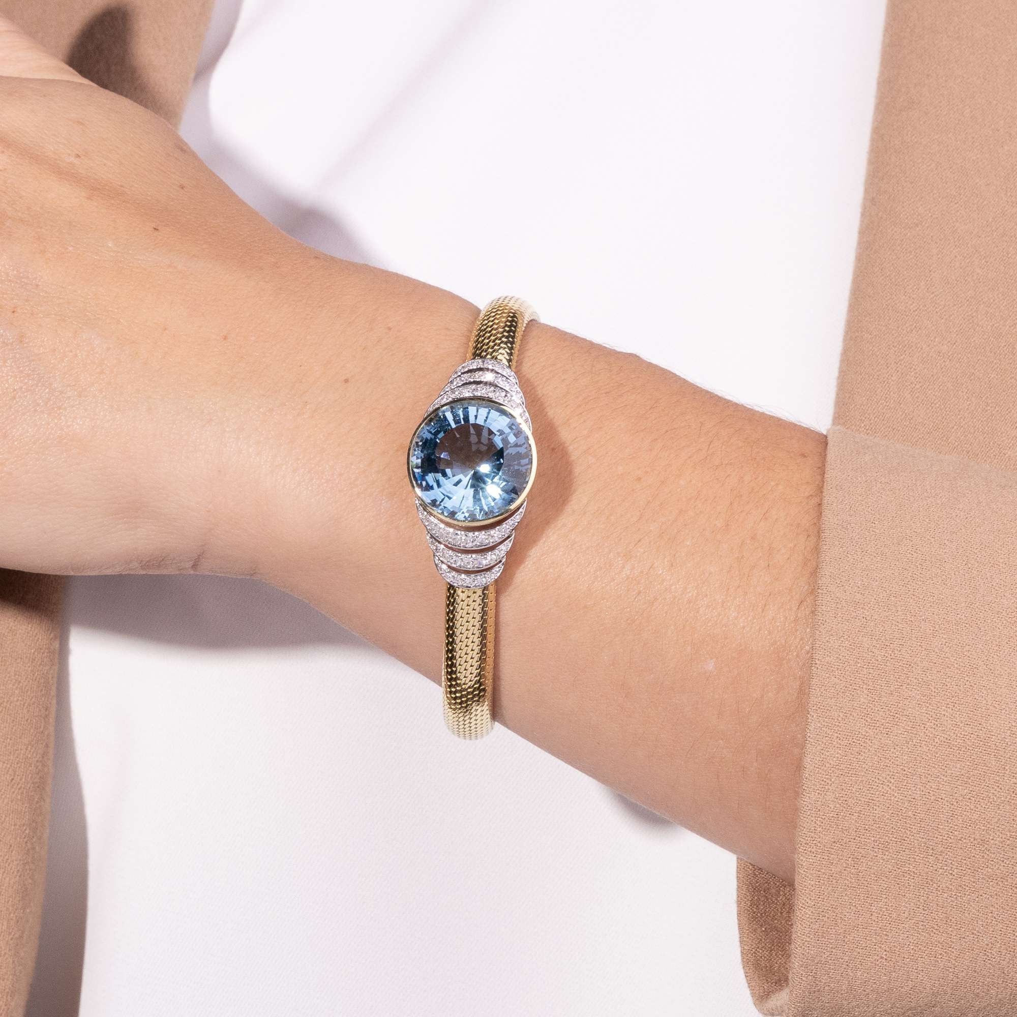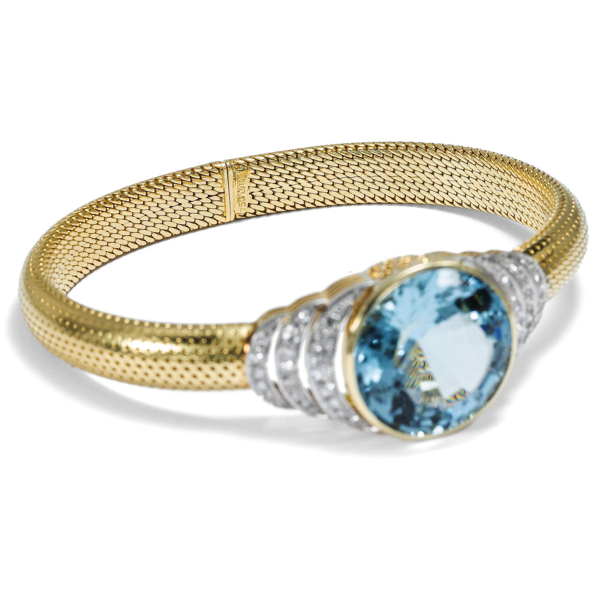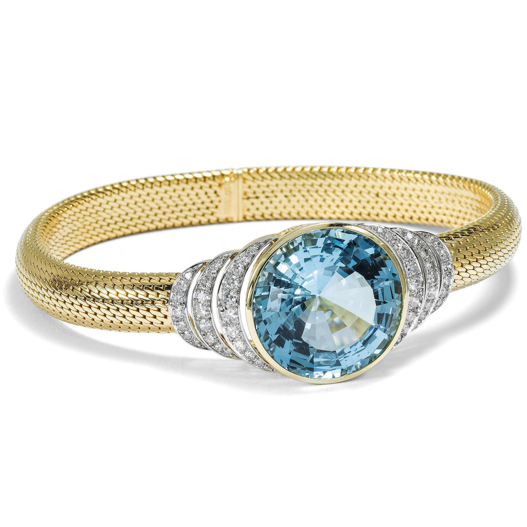 Dieses Armband ist ein prachtvoller Anblick. In der Mitte sehen wir einen großen, leuchtenden Aquamarin im Treppenschliff. Der Stein hat eine eindrucksvolle, intensive Farbe und ist in Gelbgold gefasst. Rechts und links nehmen gestaffelte Bögen aus Diamanten in Platin die Form des Aquamarins auf und leiten zum eigentlichen Armband über. Dieses ist in einer besonderen Technik ausgeführt: Es ist flexibel gearbeitet, ähnlich wie gestrickt, dabei weich und angenehm zu tragen.