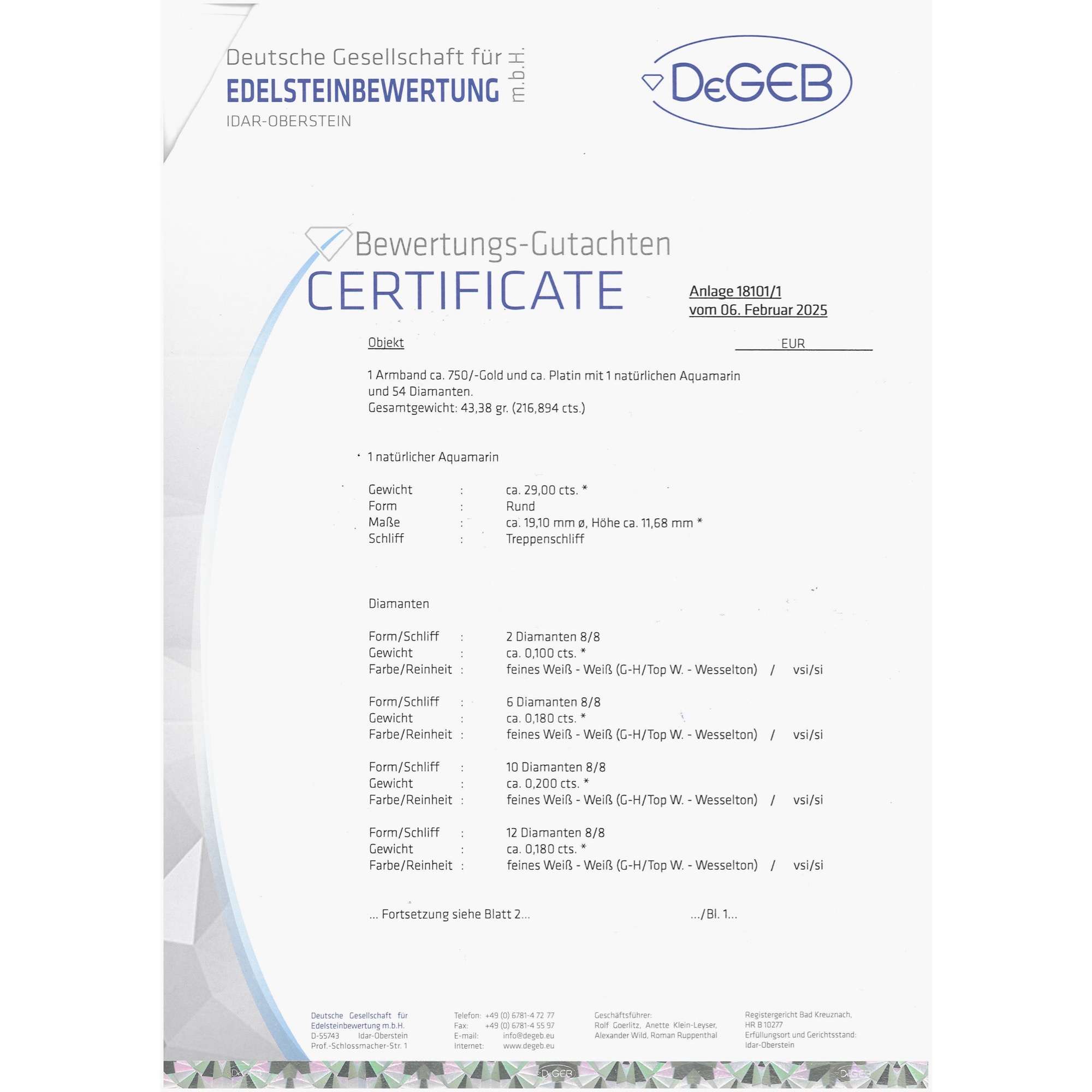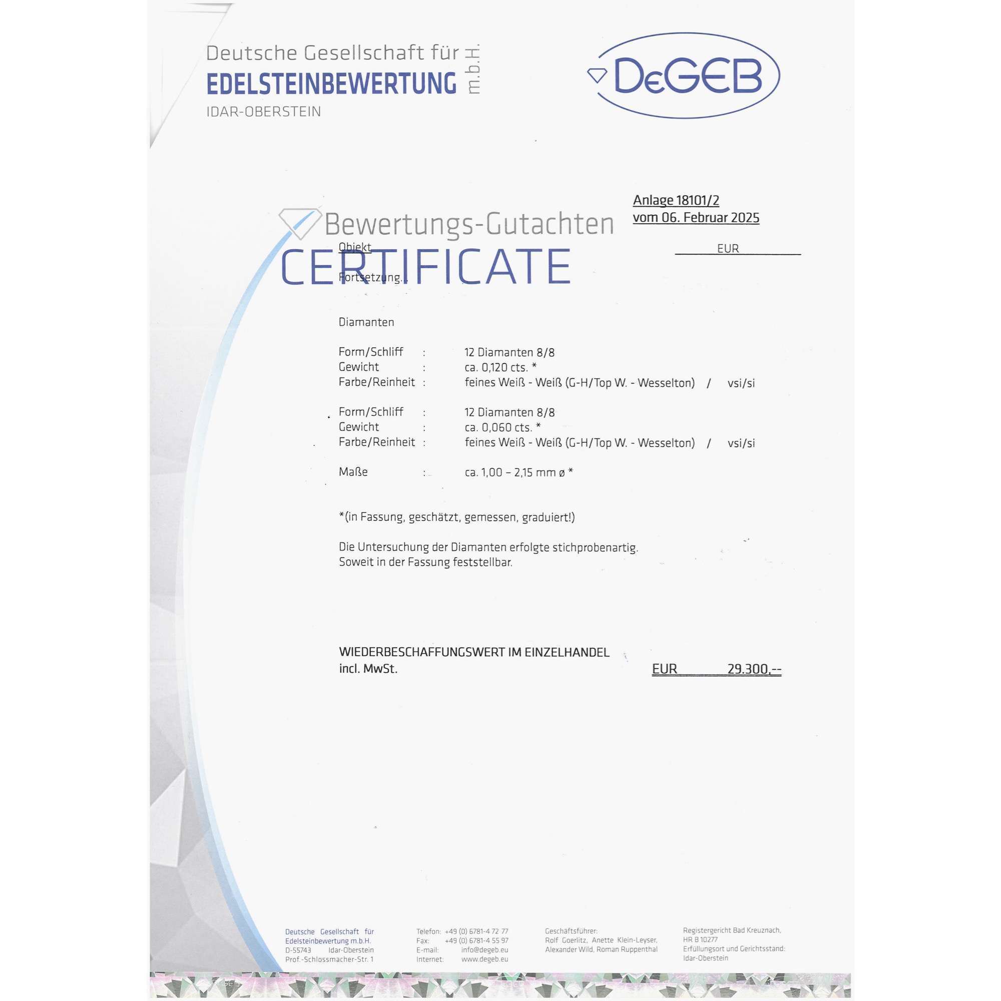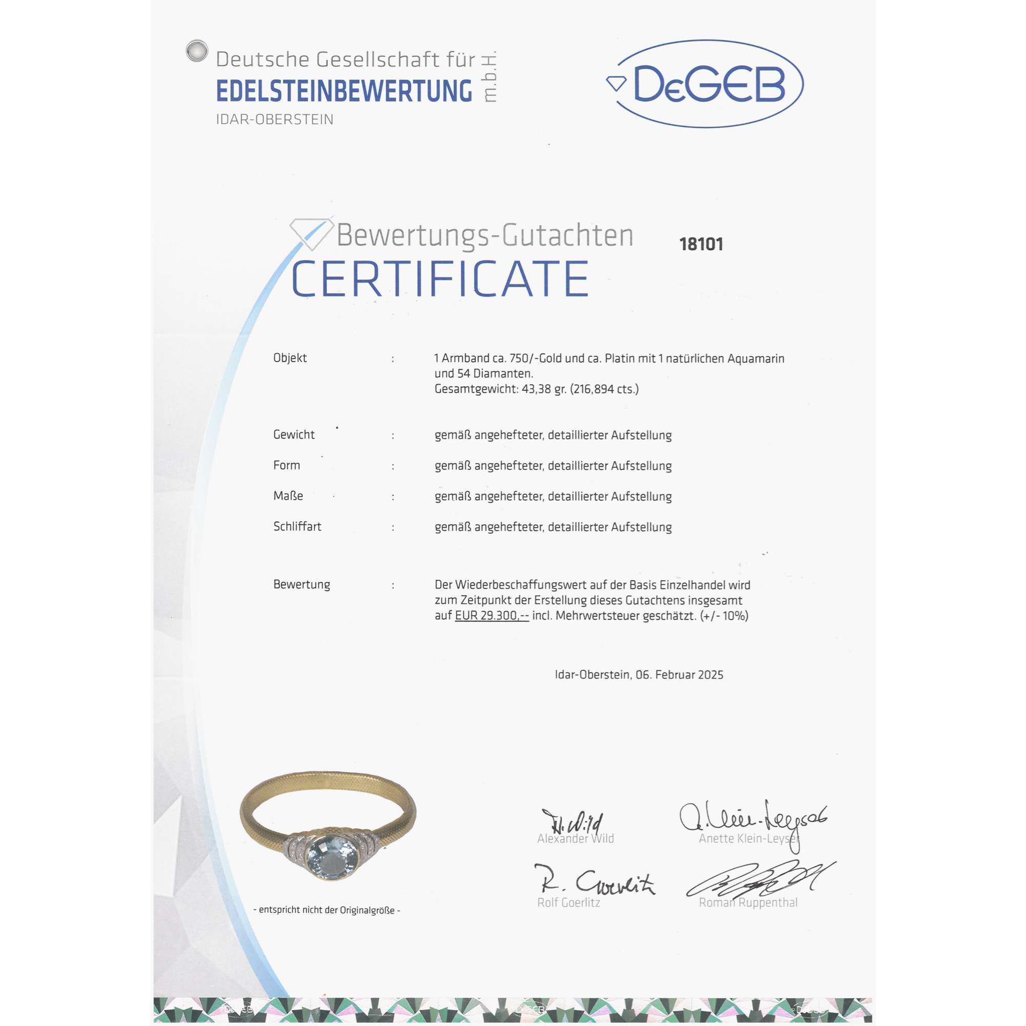 | Zertifikat: | Lieferung mit einem detaillierten Gutachten der Deutschen Gesellschaft für Edelsteinbewertung vom 6. Februar 2025. Festgestellter Wiederbeschaffungswert: 29.300,- Euro. |