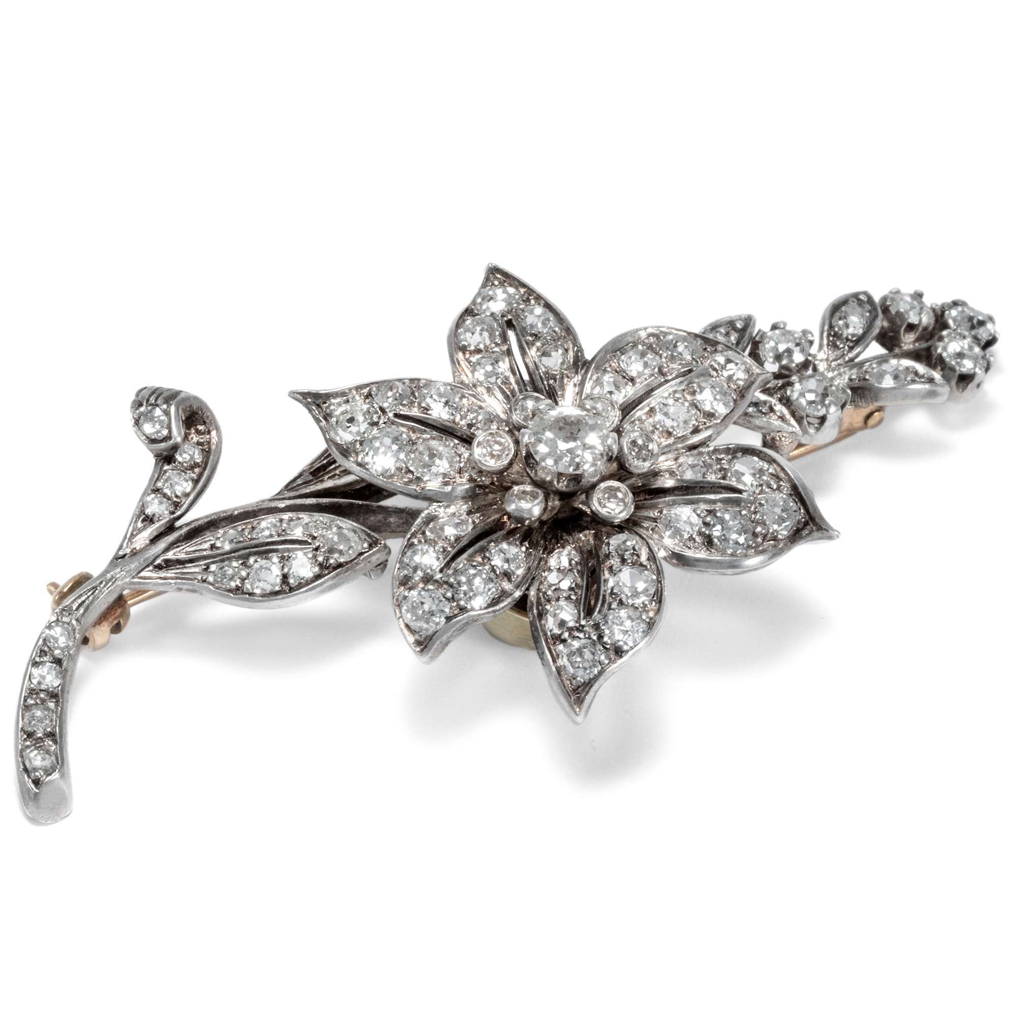 Material: 75 Diamanten im Altschliff bzw. 8/8-Schliff, zus. ca. 3,10 ct, Feines Weiß (Top Wesselton, G)–Weiß (Wesselton, H), vsi–si, wenige Steine pi Front aus Silber Rückseite und Nadel aus Gold 585/000, entspricht 14 Karat