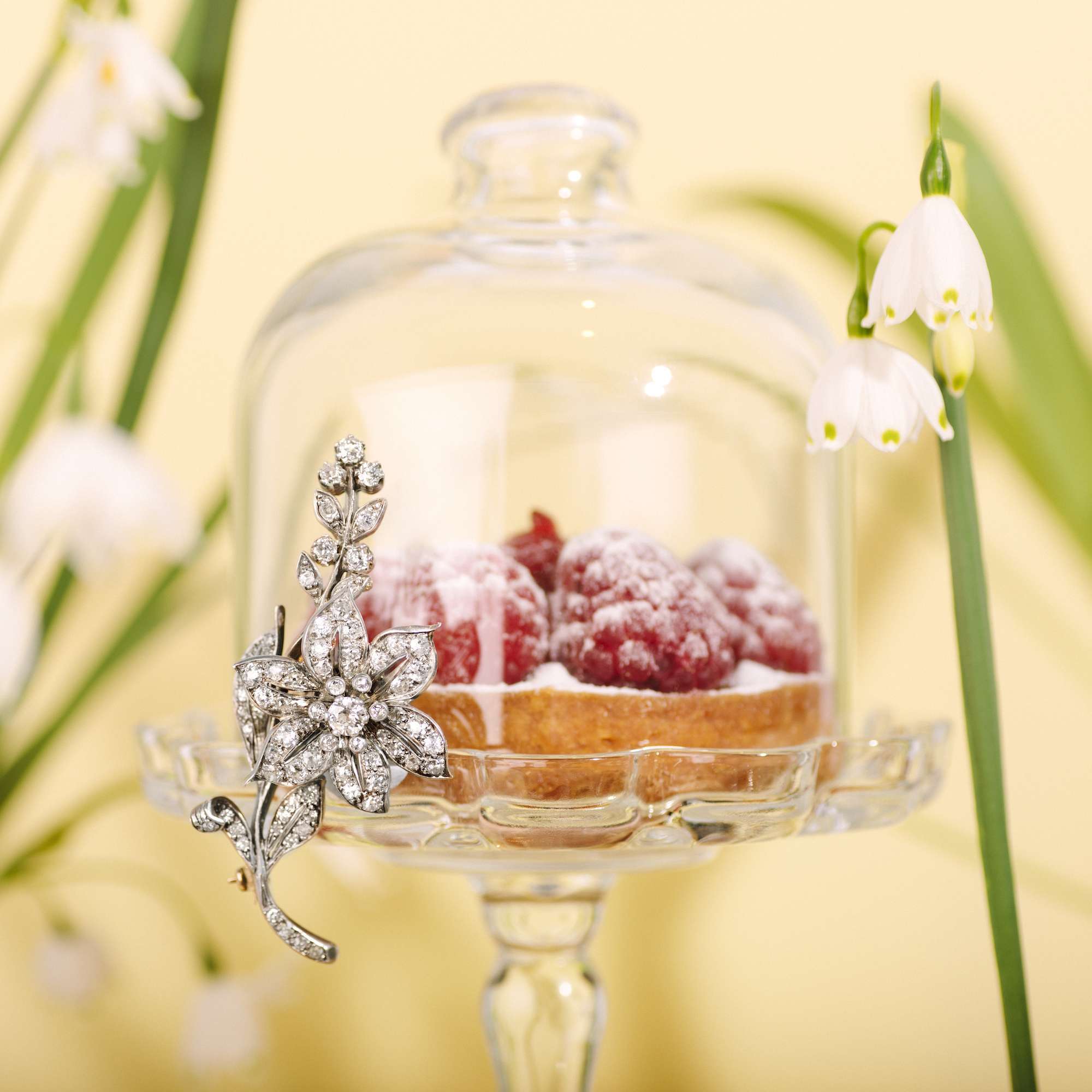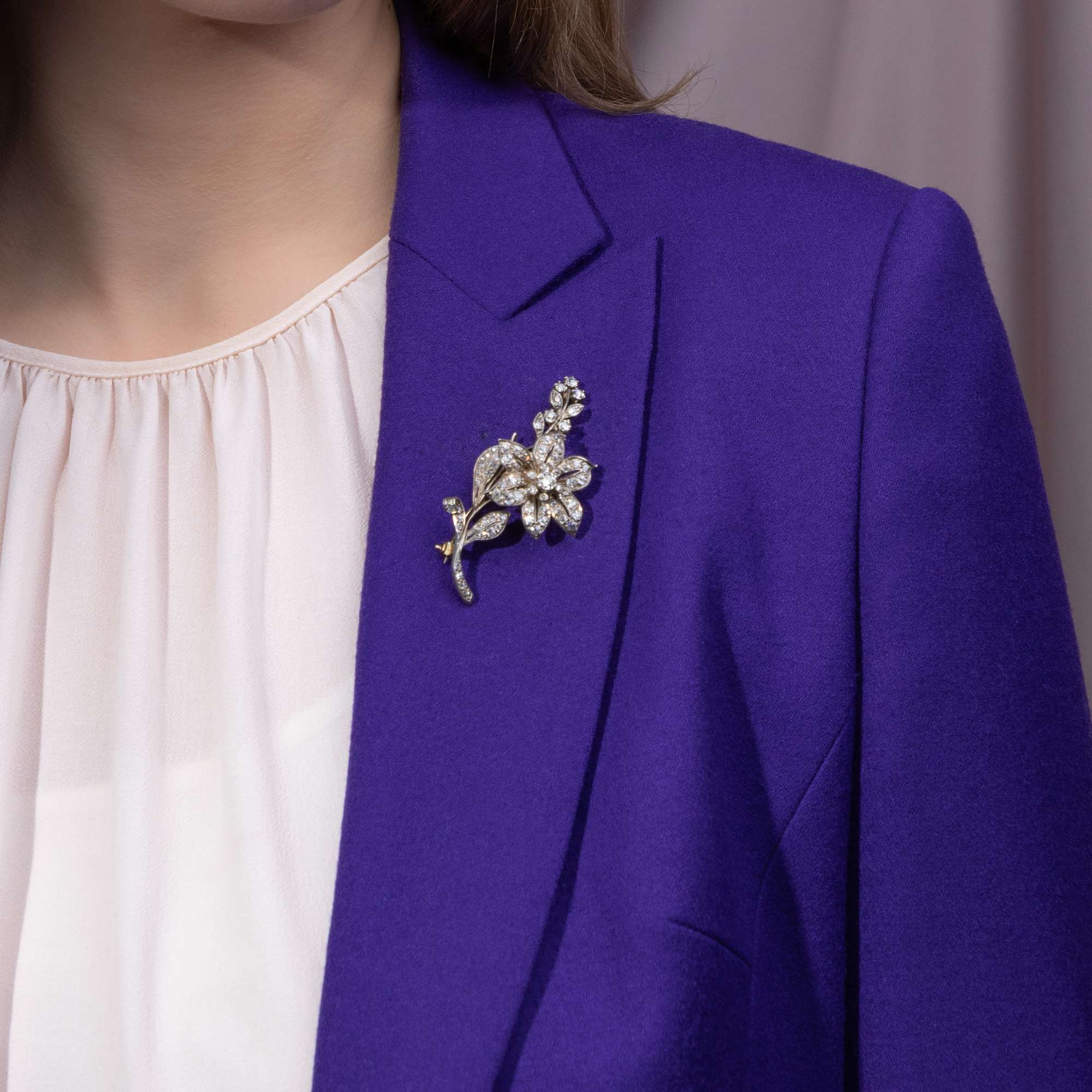 Das hier vorliegende Schmuckstück nutzt diese Technik für einen ganz besonderen Anblick. Wir sehen einen große Blütenzweig, der über und über im Licht von 3,10 ct Diamanten funkelt. Die große Blüte ist dabei „en tremblant“ gelagert, d.h., sie zittert und vibriert bei jeder Bewegung ihrer Trägerin und die Diamanten gewinnen bei jedem neuen Lichteinfall an Brillanz. Auch unterstützt die gefederte Lagerung der Blüten die Naturnähe und den Realismus des Entwurfes.