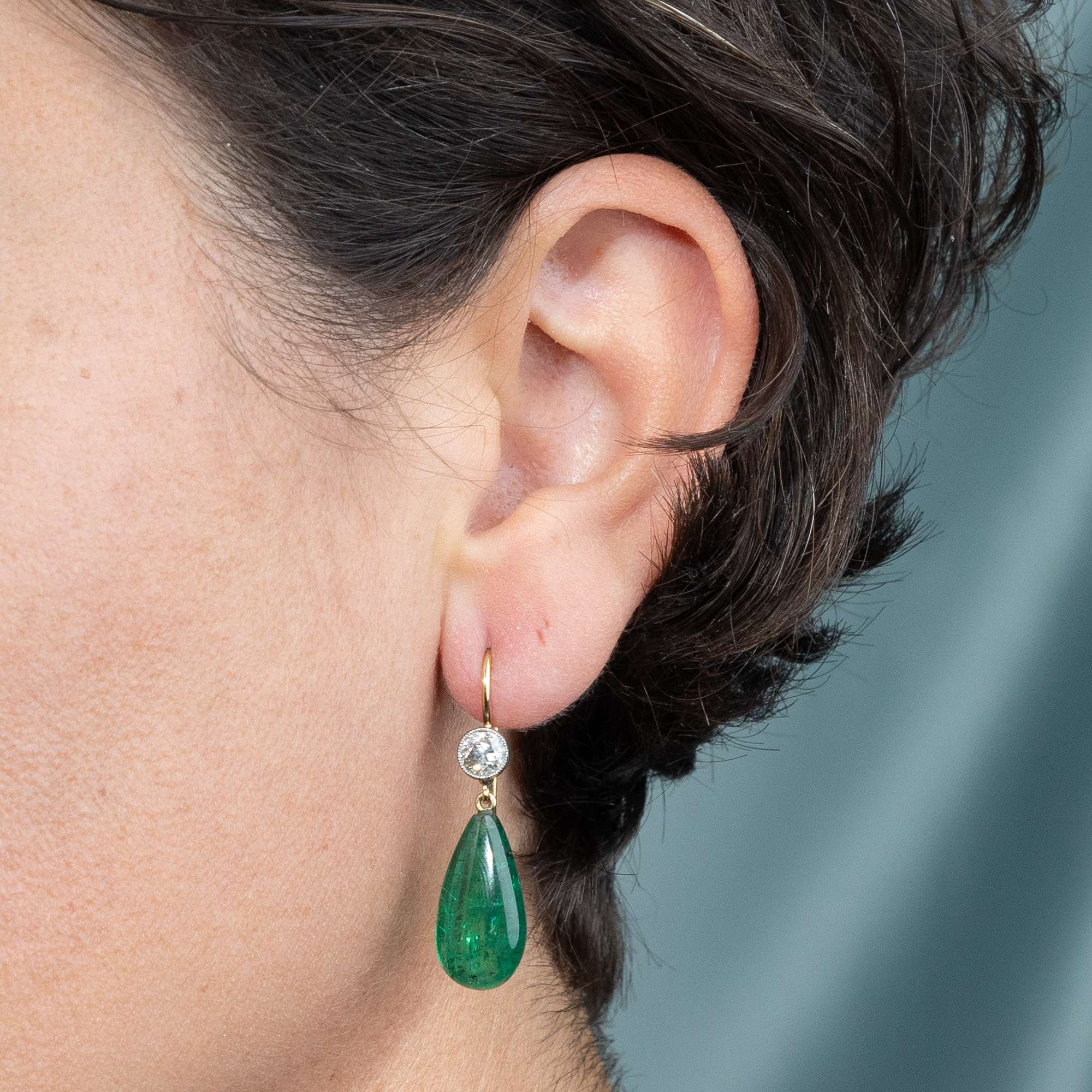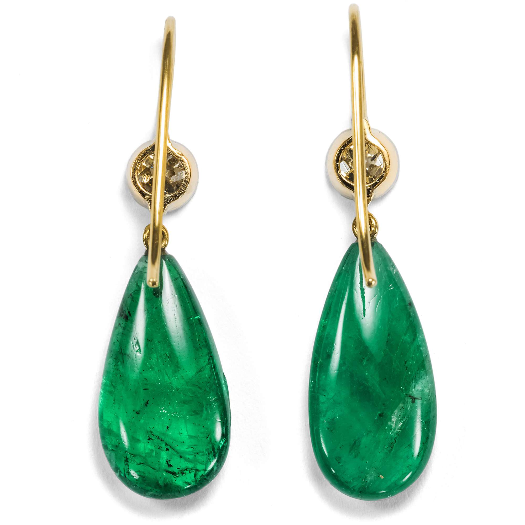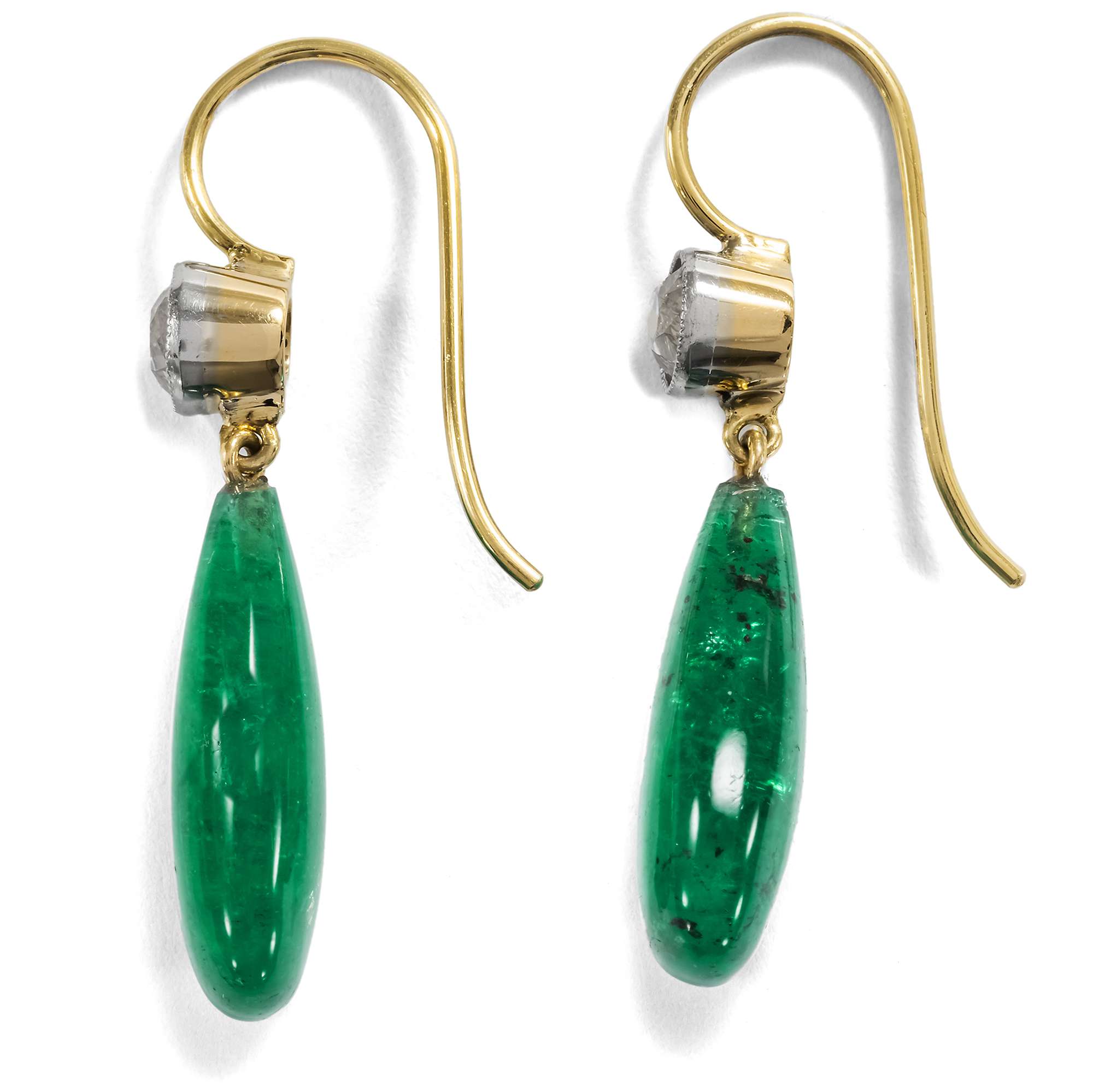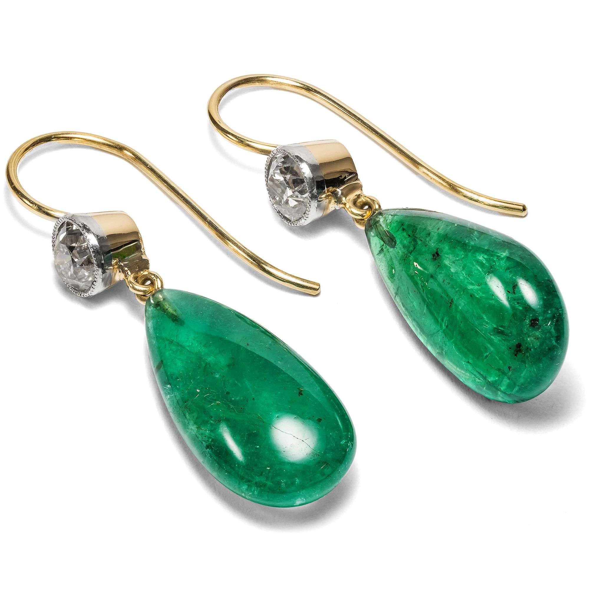 Die hier vorliegenden, prachtvollen Ohrringe, entstanden aus antiken Elementen, rufen dieses und ähnliche Bilder in uns hervor. Je ein wundervoller Altschliffdiamant, der wie Schnee leuchtet, ist unter den elegant gebogenen Bügeln angebracht. Die beiden Steine von zusammen 1,30 Karat werden von antiken Fassungen aus Platin und Gold gehalten, die einst Teil einer Brosche aus den Jahren um 1910 waren. Darunter pendeln qualitätvolle Smaragdtropfen von zusammen 17,24 Karat Gewicht in zauberhaft grüner Farbe.
