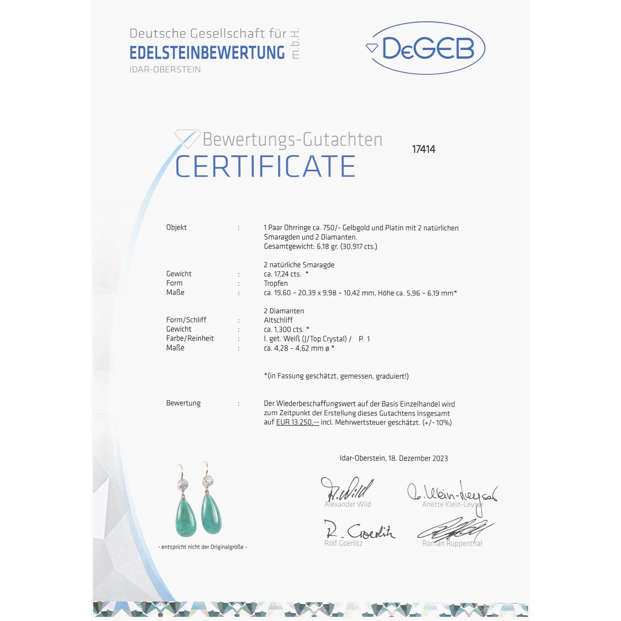 | Material: | Zwei natürliche Smaragde im Tropfenschliff, zus. ca. 17,24 ct, ca. 19,60 – 20,39 x 9,98 – 10,42 mm, Höhe ca. 5,96 – 6,19 mm Zwei Diamanten im Altschliff, zus. ca. 1,30 ct, Leicht getöntes Weiß (Top Crystal, J), p1 Gelbgold 750/000, entspricht 18 Karat Diamantfassung aus Platin |