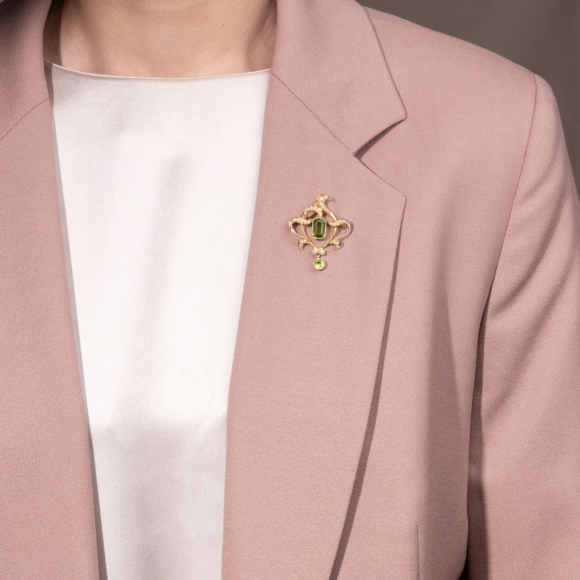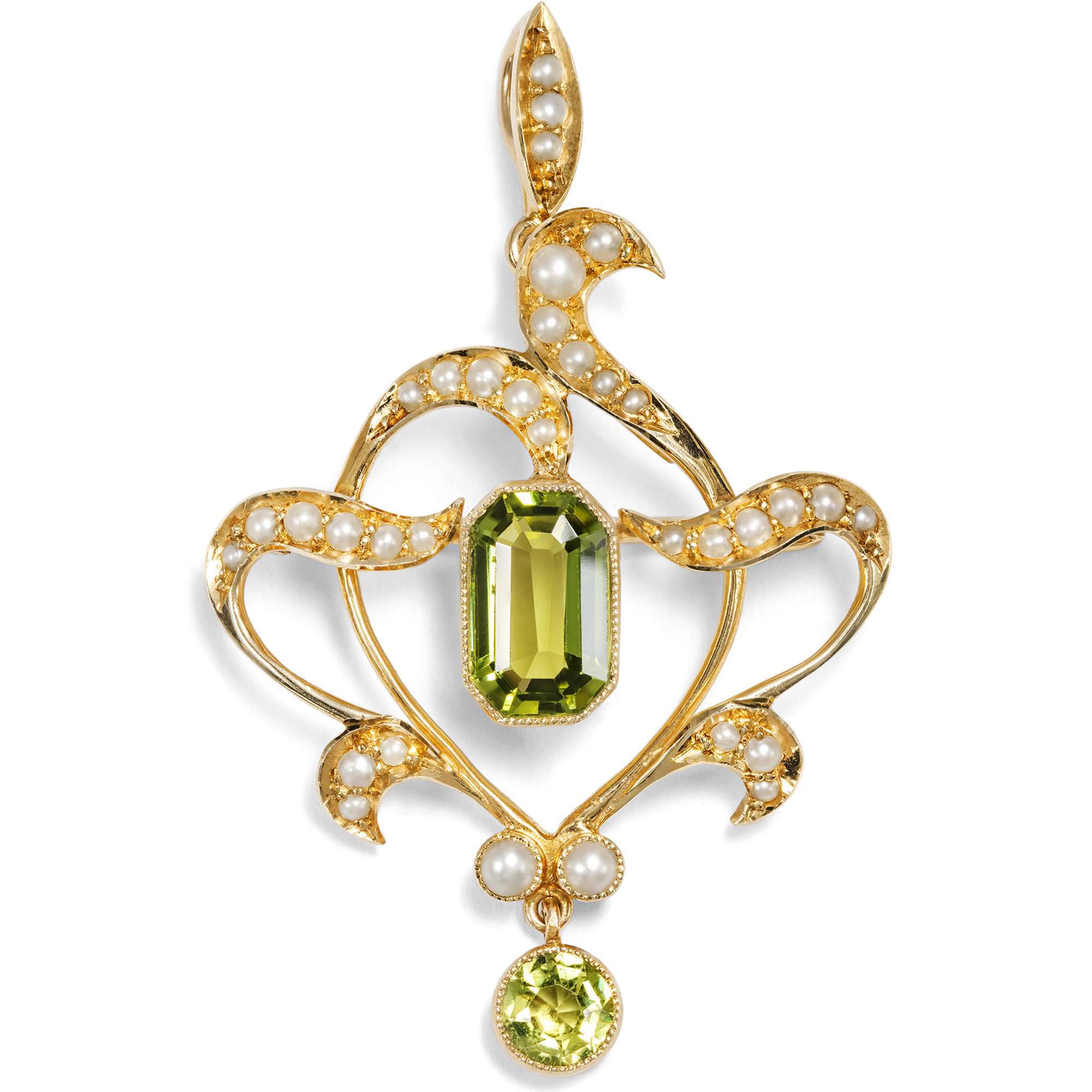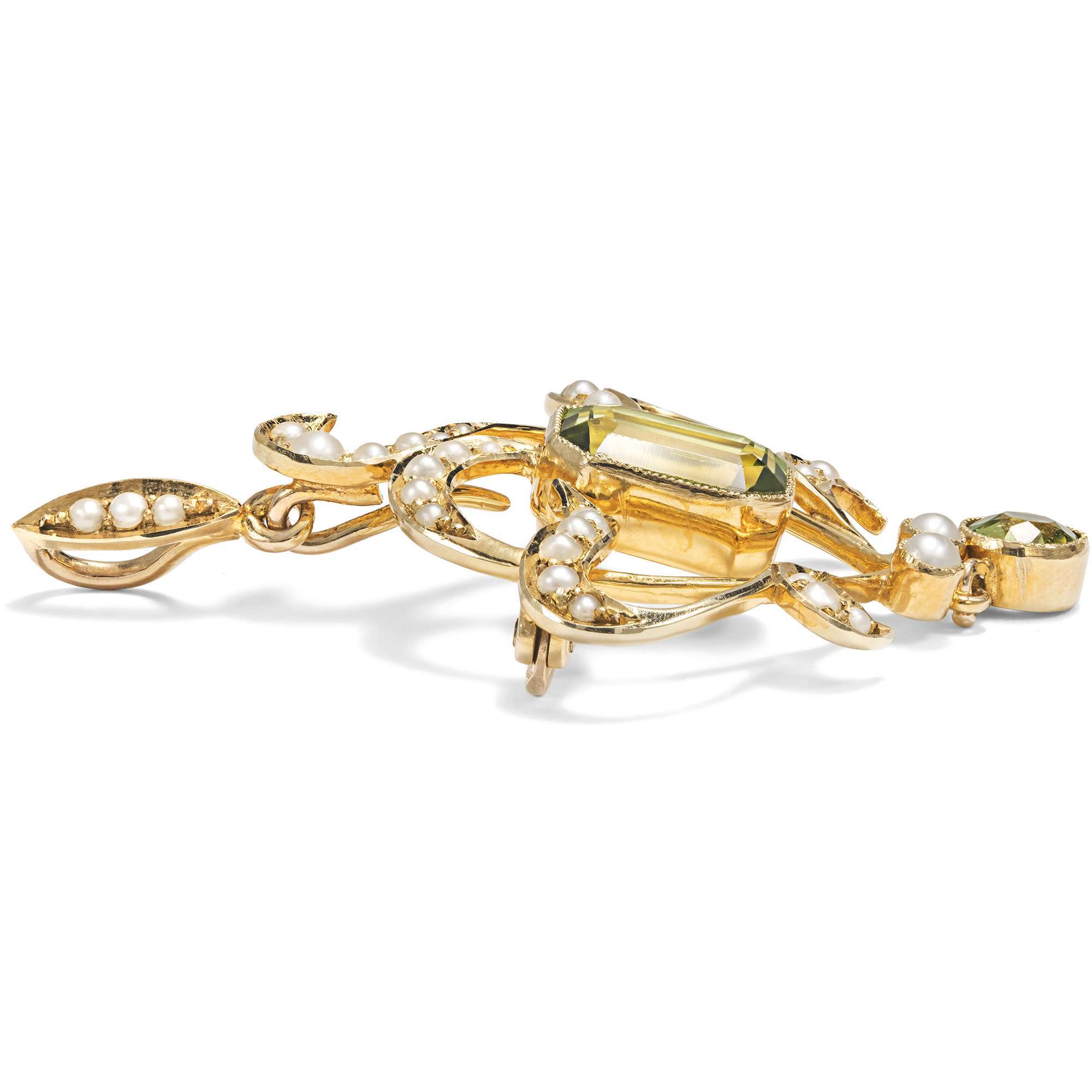 Hier nun sind die Peridote und Perlen in einem anmutigen Arrangement vereint. Ranken aus Gold und Perlen umrahmen die Edelsteine und lassen den Einfluss des Jugendstil erkennen. Durch eine rückseitige Nadel kann das Stück als Brosche getragen werden. Eine Anhängeröse, ebenfalls mit Perlen besetzt, kann durch eine Hakenaufhängung einfach abgenommen werden, sodass man das Schmuckstück auch effektvoll in eine Perlenkette einhängen kann.Das Schmuckstück ist aus der typisch britischen Legierung von fünfzehnkarätigem Gold (entspricht einem Feingehalt von 625/000) hergestellt. Diese Legierung begegnet uns bei vielen viktorianischen und edwardianischen Schmuckstücken, wurde jedoch nur bis zum Jahr 1932 verwendet; danach wurde ihr Gebrauch untersagt.
