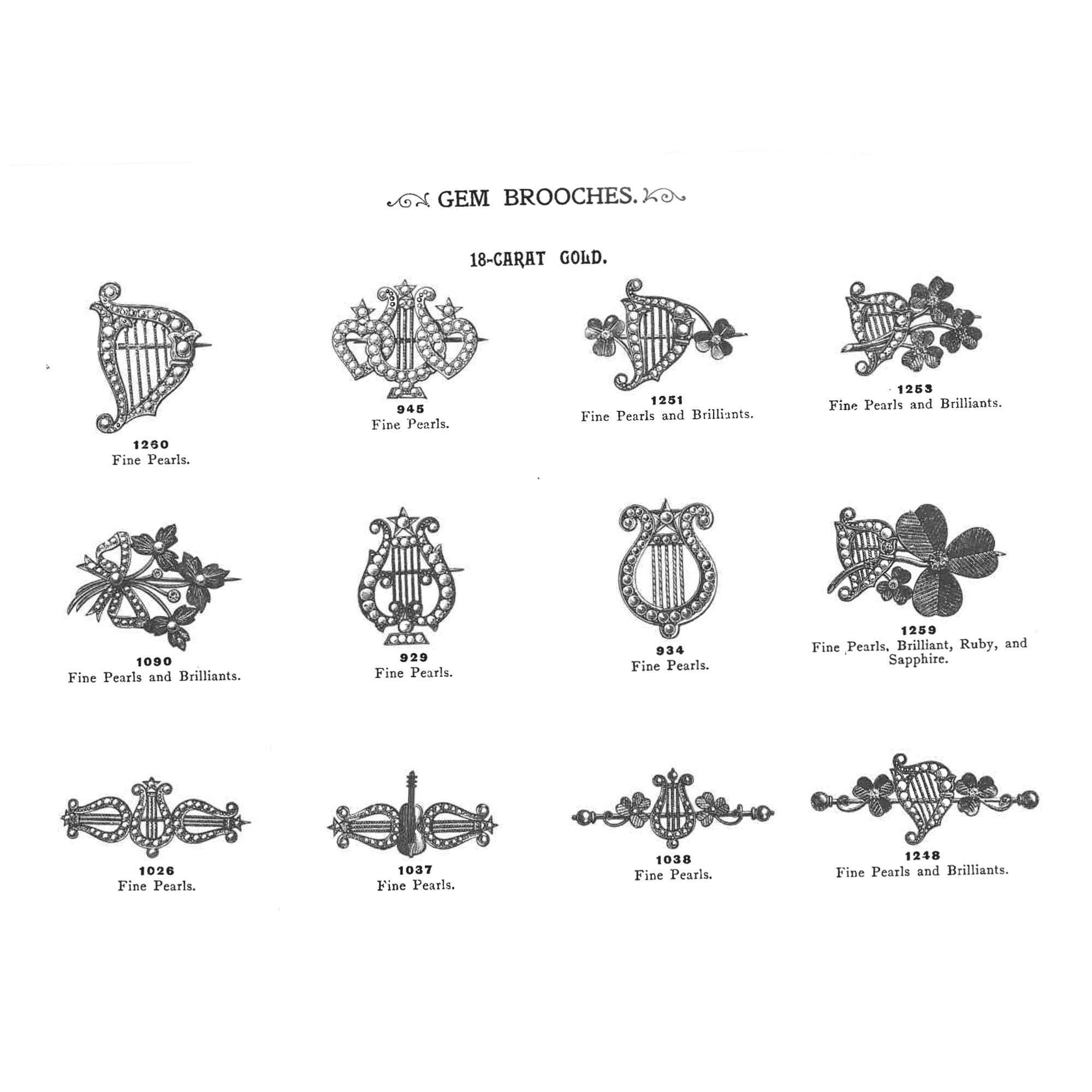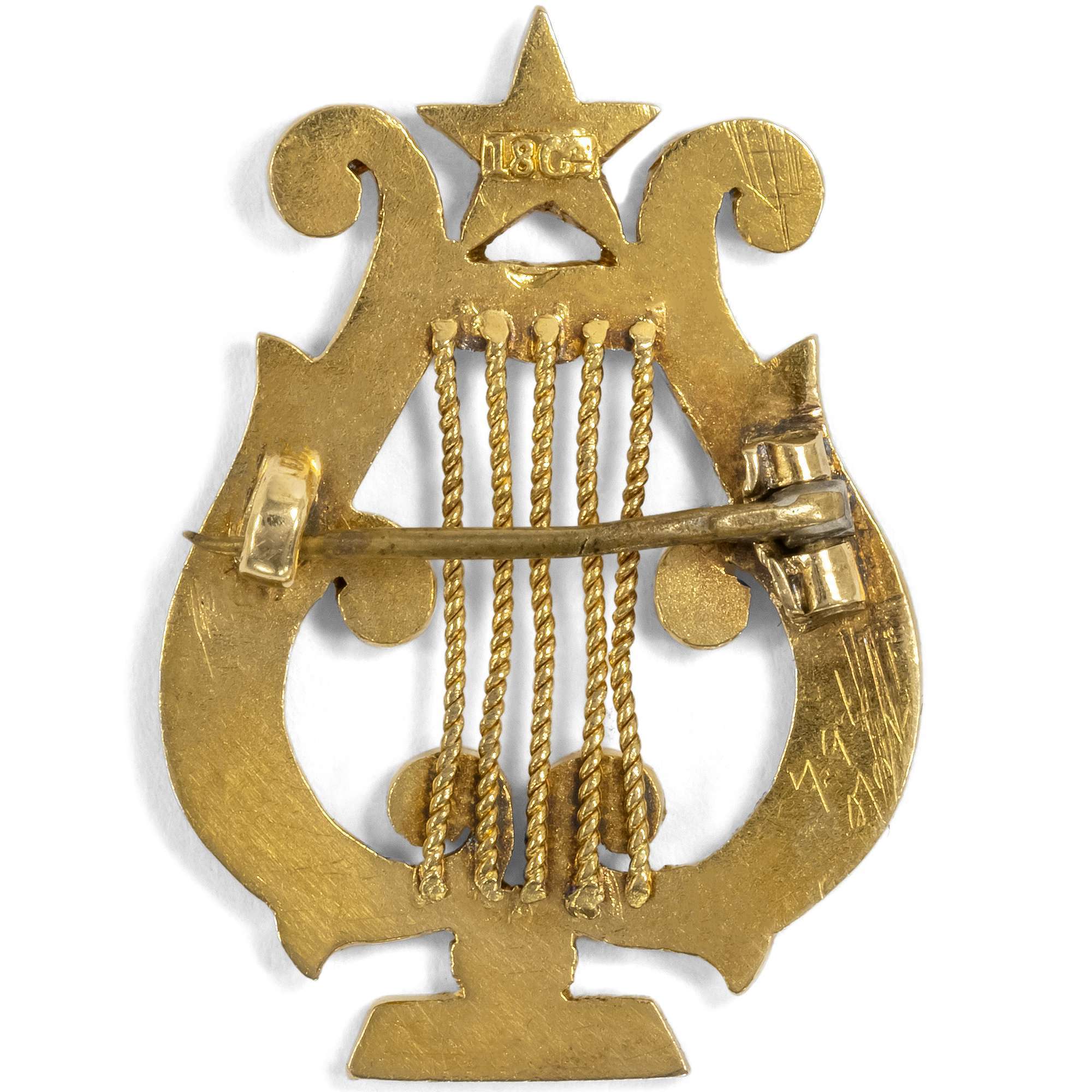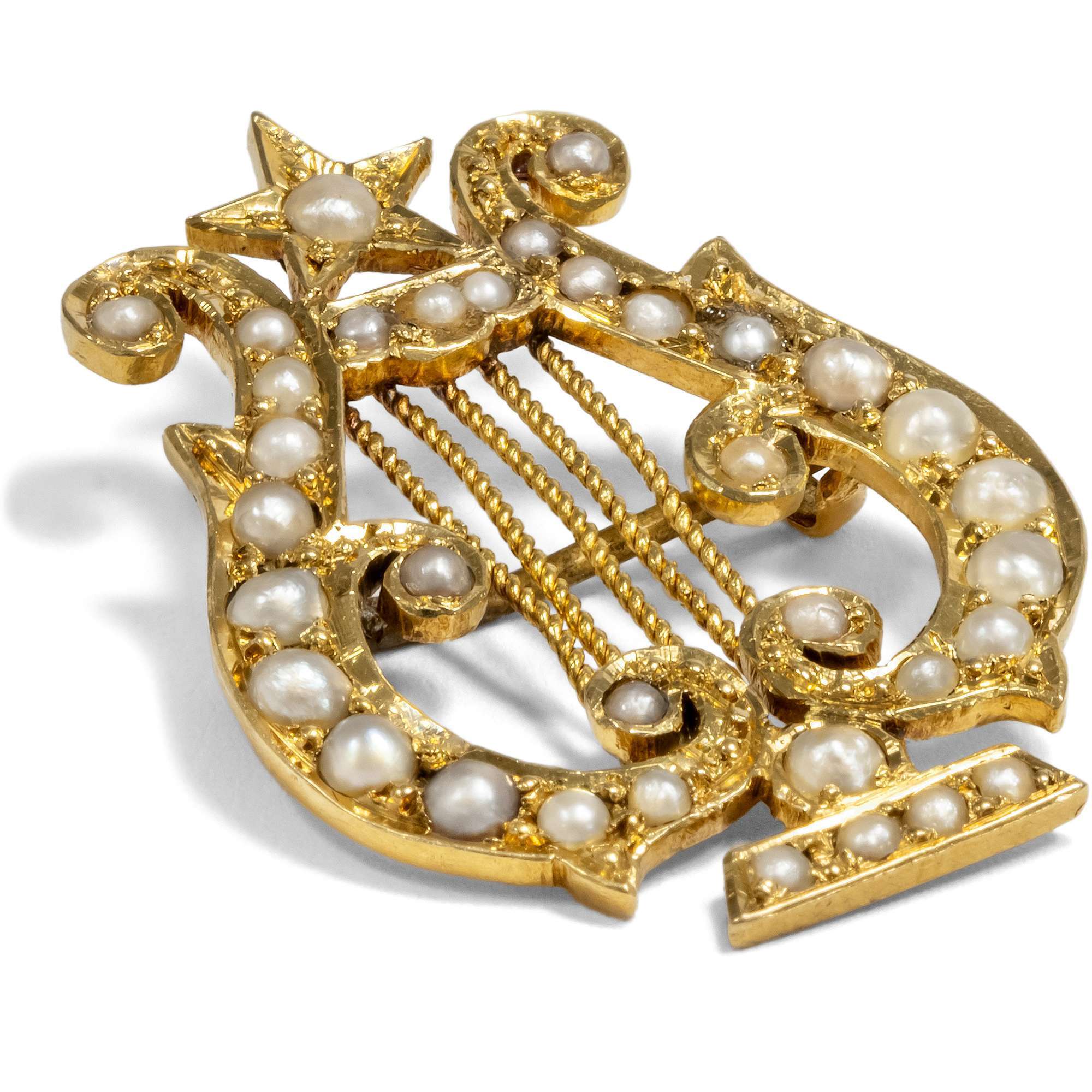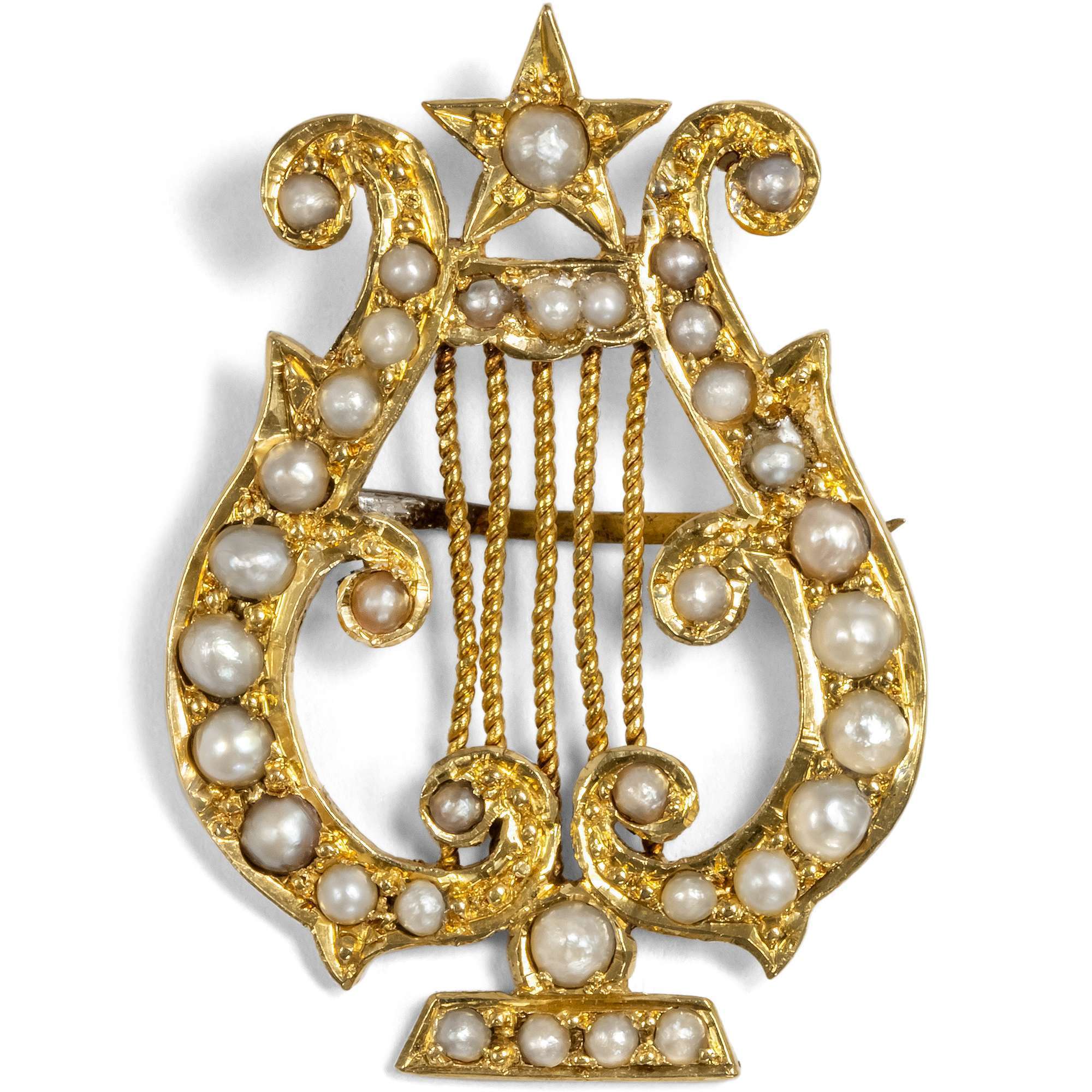 Ein solches Instrument ist hier in hochkarätigem Gold dargestellt und vollständig mit Perlen ausgefasst. Mit seinem figürlichen Thema ist das Schmuckstück ein typisches Juwel der vorletzten Jahrhundertwende, als figürliche Broschen in Form von Instrumenten, Gegenständen, aber sogar Tieren und Sportutensilien gerade in Mode gekommen waren.