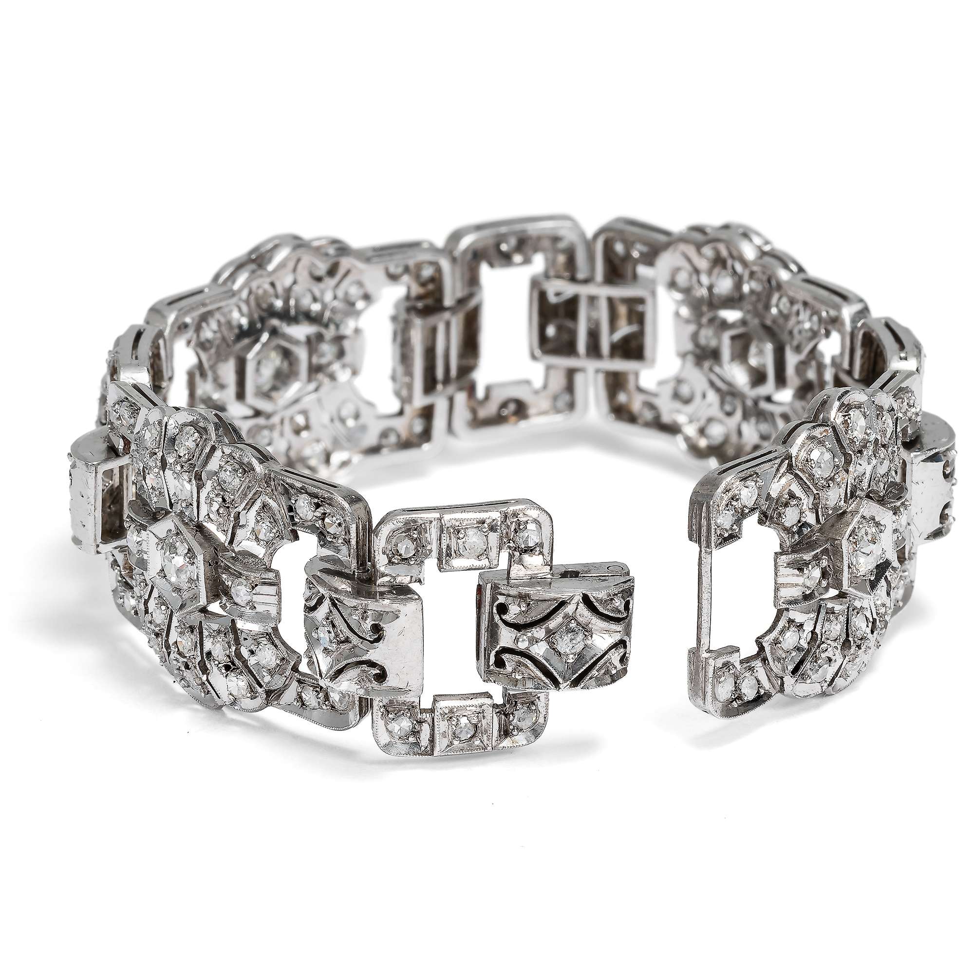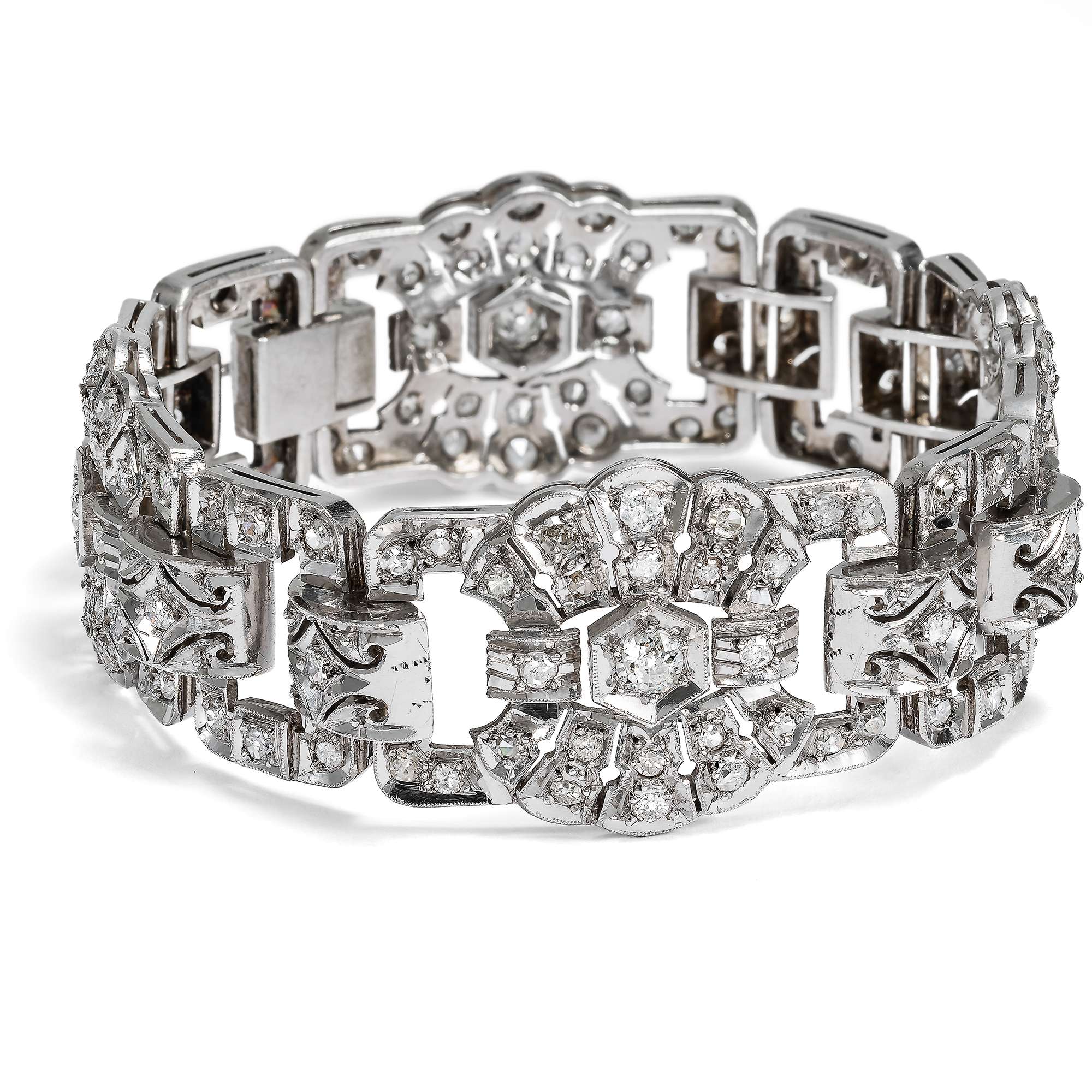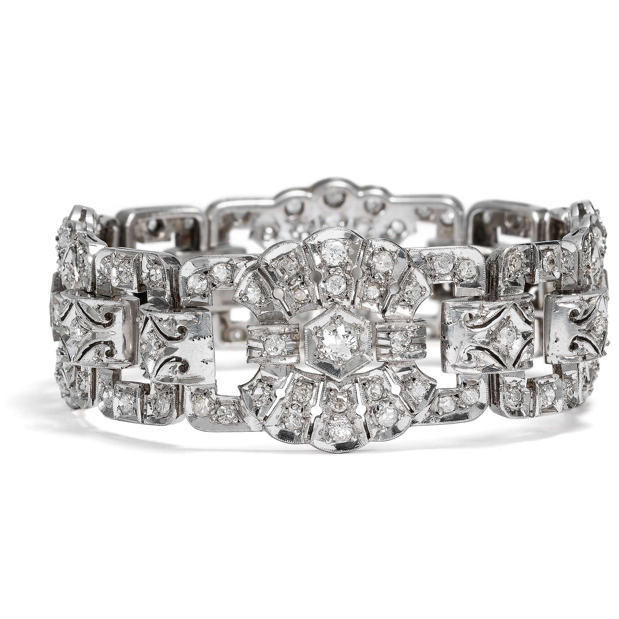 Wir datieren das Schmuckstück in die 1940er Jahre, als die Formen des Art Déco kräftiger wurden und sich vom allzu filigranen Stil der 1920er Jahre fortentwickelten. Zudem stützen zwei Umstände die Datierung des Armbands: Zum einen besteht die Arbeit nicht aus Platin, sondern aus rhodiniertem Silber. Zum anderen stammen die Diamanten zum Teil wohl aus älteren Schmuckstücken und sind für dieses Band in Zweitverwendung gefasst worden. Wir sehen historische Altschliffe neben recht modernen Übergangsschliffen.