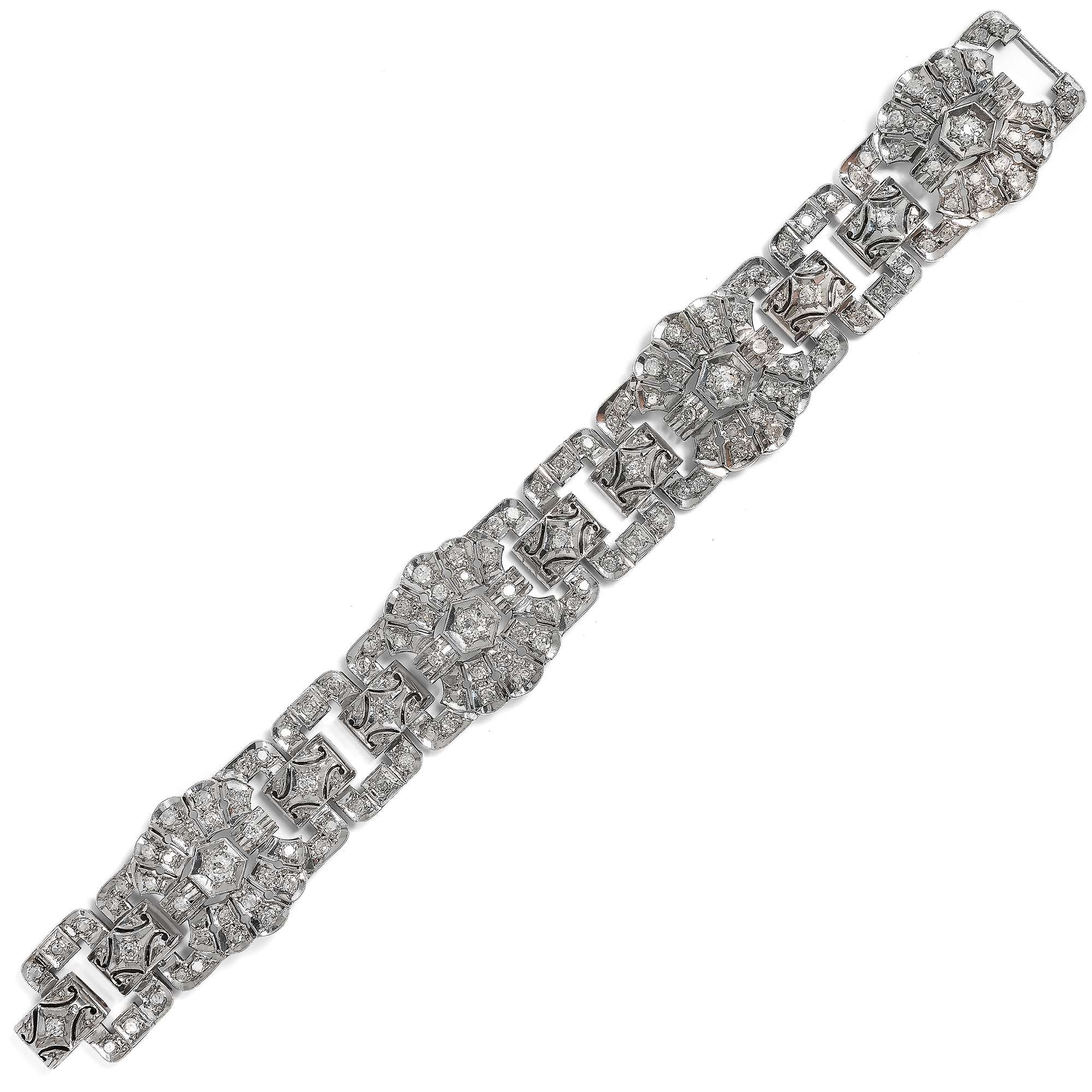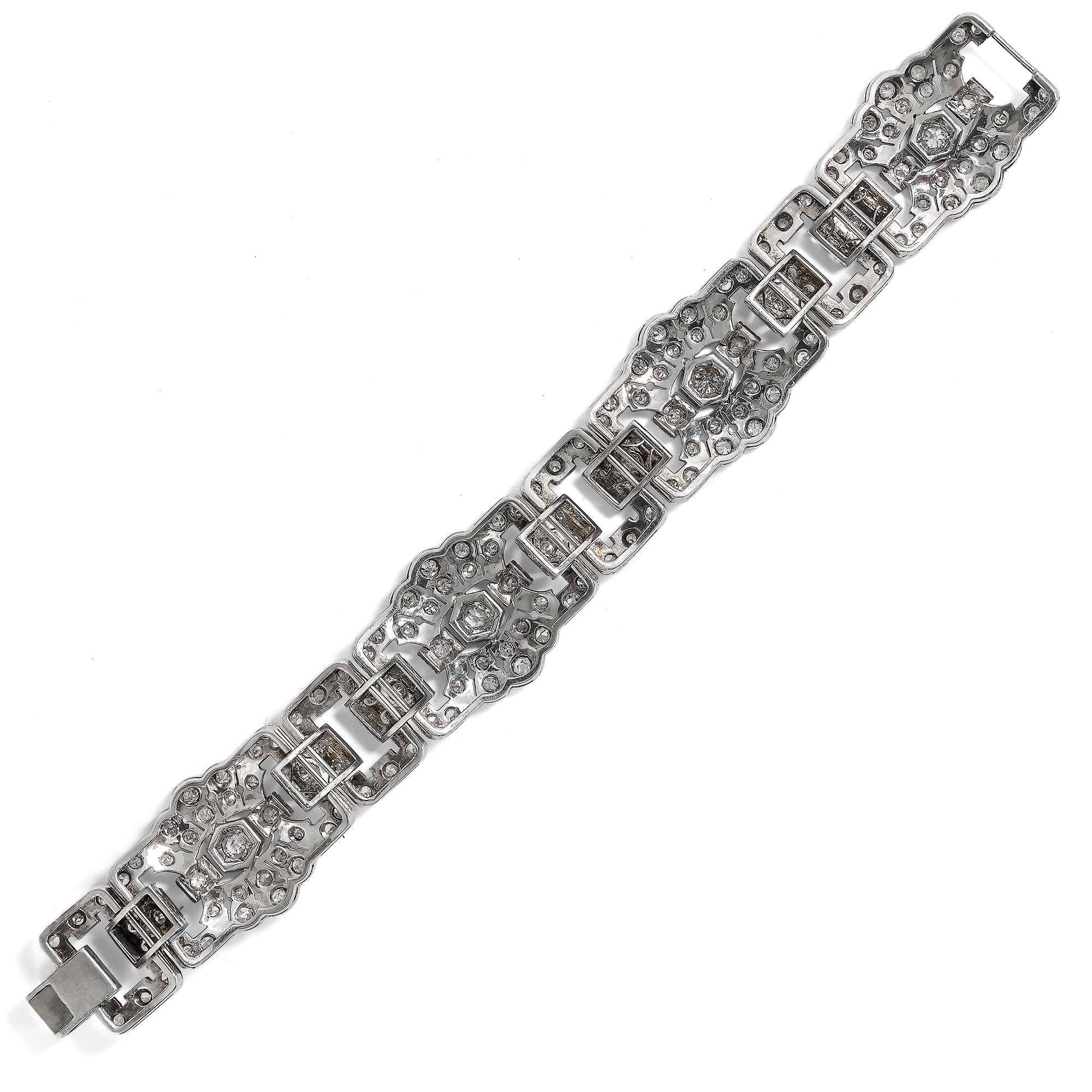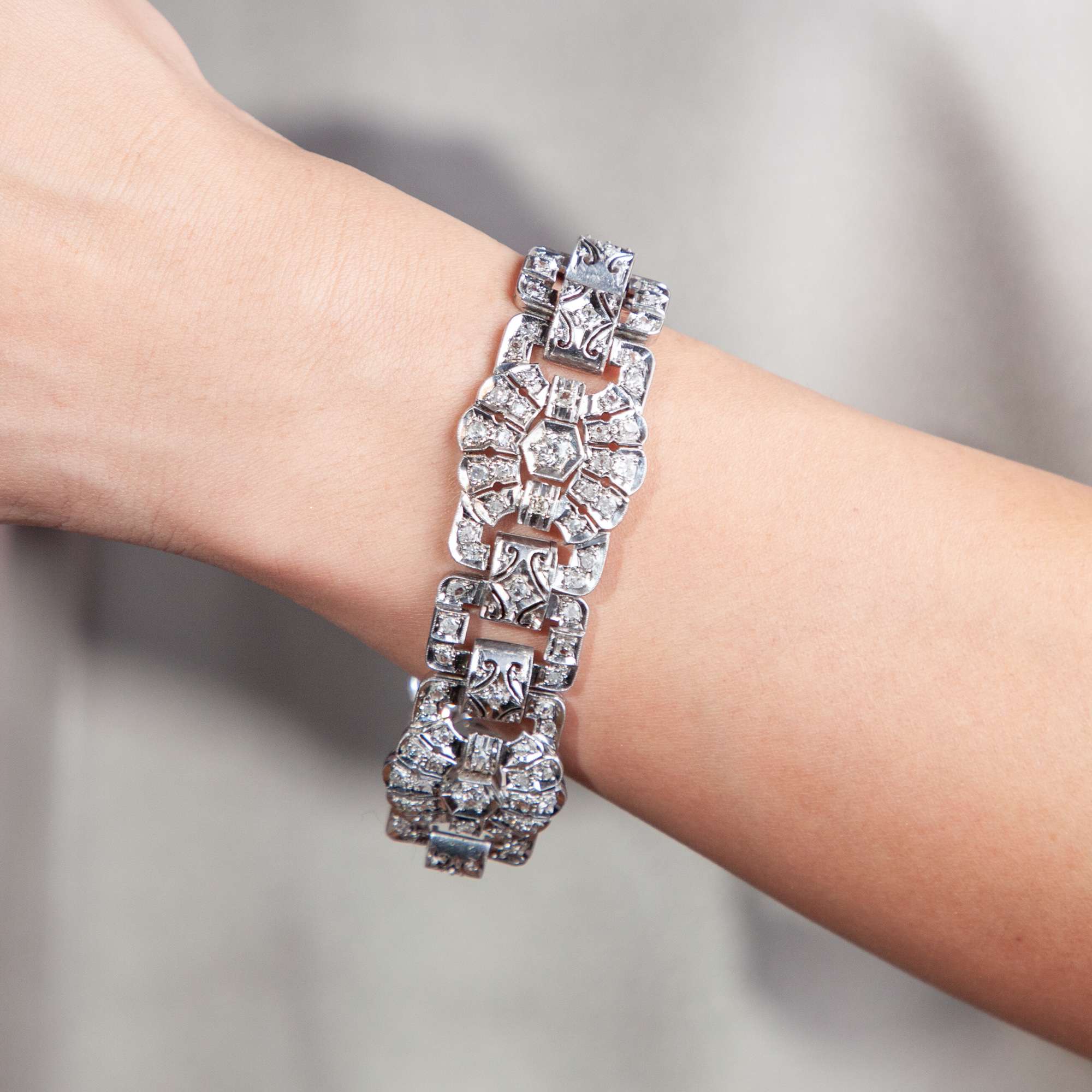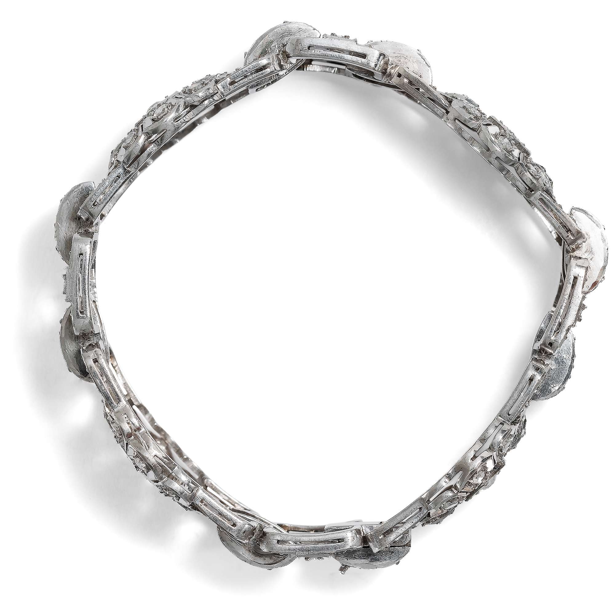 Wir datieren das Schmuckstück in die 1940er Jahre, als die Formen des Art Déco kräftiger wurden und sich vom allzu filigranen Stil der 1920er Jahre fortentwickelten. Zudem stützen zwei Umstände die Datierung des Armbands: Zum einen besteht die Arbeit nicht aus Platin, sondern aus rhodiniertem Silber. Zum anderen stammen die Diamanten zum Teil wohl aus älteren Schmuckstücken und sind für dieses Band in Zweitverwendung gefasst worden. Wir sehen historische Altschliffe neben recht modernen Übergangsschliffen.