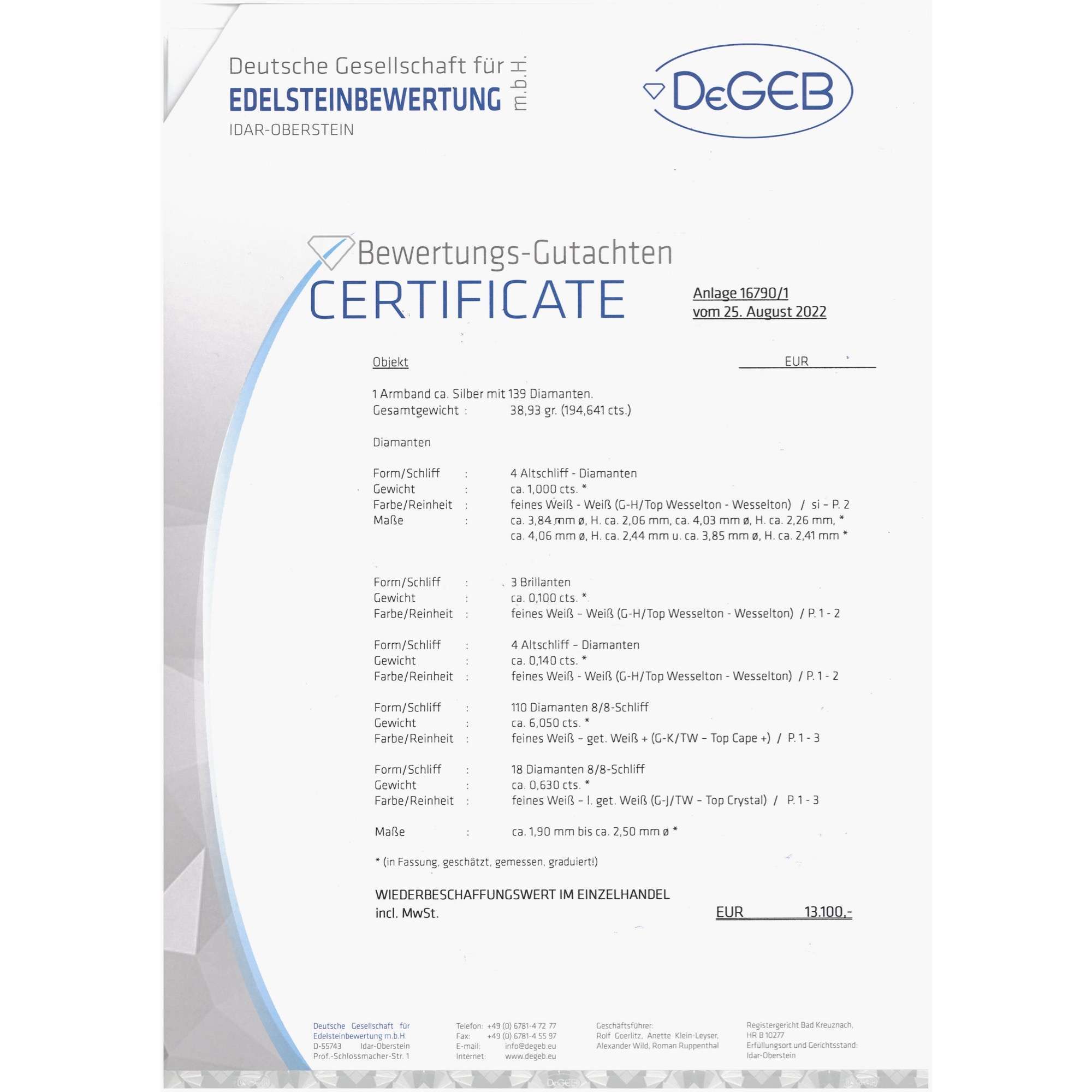 | Material: | 139 Diamanten im Altschliff („Ole European Cut“), Übergangsschliff und 8/8-Schliff, zus. 7,82 ct, Feines Weiß (Top Wesselton, G)–Getöntes Weiß (Top Cape+, K), si–pi Silber |
