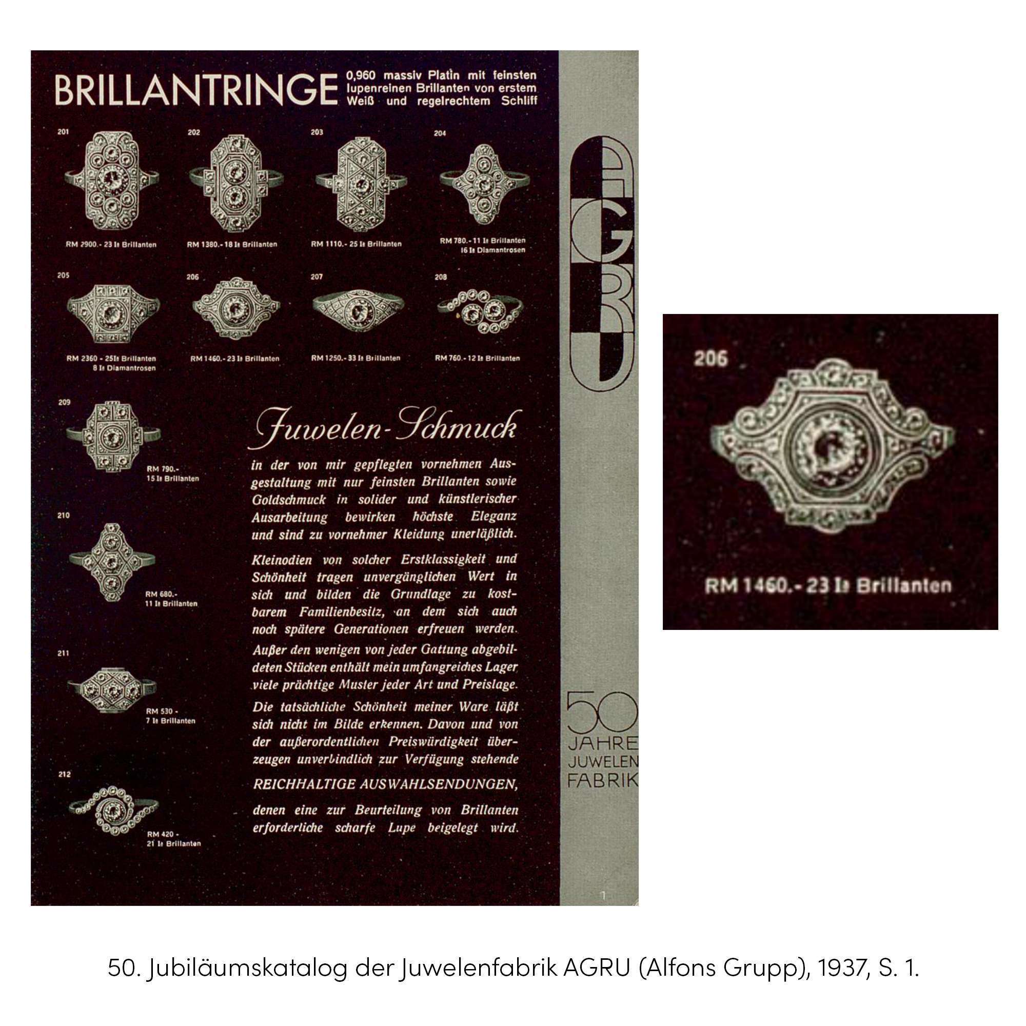 An dieser Stelle können wir Ihnen die nächstmögliche Erfüllung dieses Traums anbieten – denn der vorliegende Ring entstammt der Manufaktur des deutschen Schmuckfabrikanten Alfons Grupp, kurz AGRU, und ist in seinem 50. Jubiläumskatalog aus dem Jahre 1937 abgebildet. In weiser Voraussicht warb Grupp schon damals auf der ersten Seite, die auch diesen Ring zeigt: „Kleinodien von solcher Erstklassigkeit und Schönheit tragen unvergänglichen Wert in sich und bilden die Grundlage zu kostbarem Familienbesitz, an dem sich auch noch spätere Generationen erfreuen werden.“ Grupp sollte recht behalten, denn noch immer ist der Ring in hervorragendem Zustand, und trotz aller zeittypischen Finesse geradezu zeitlos zu nennen.