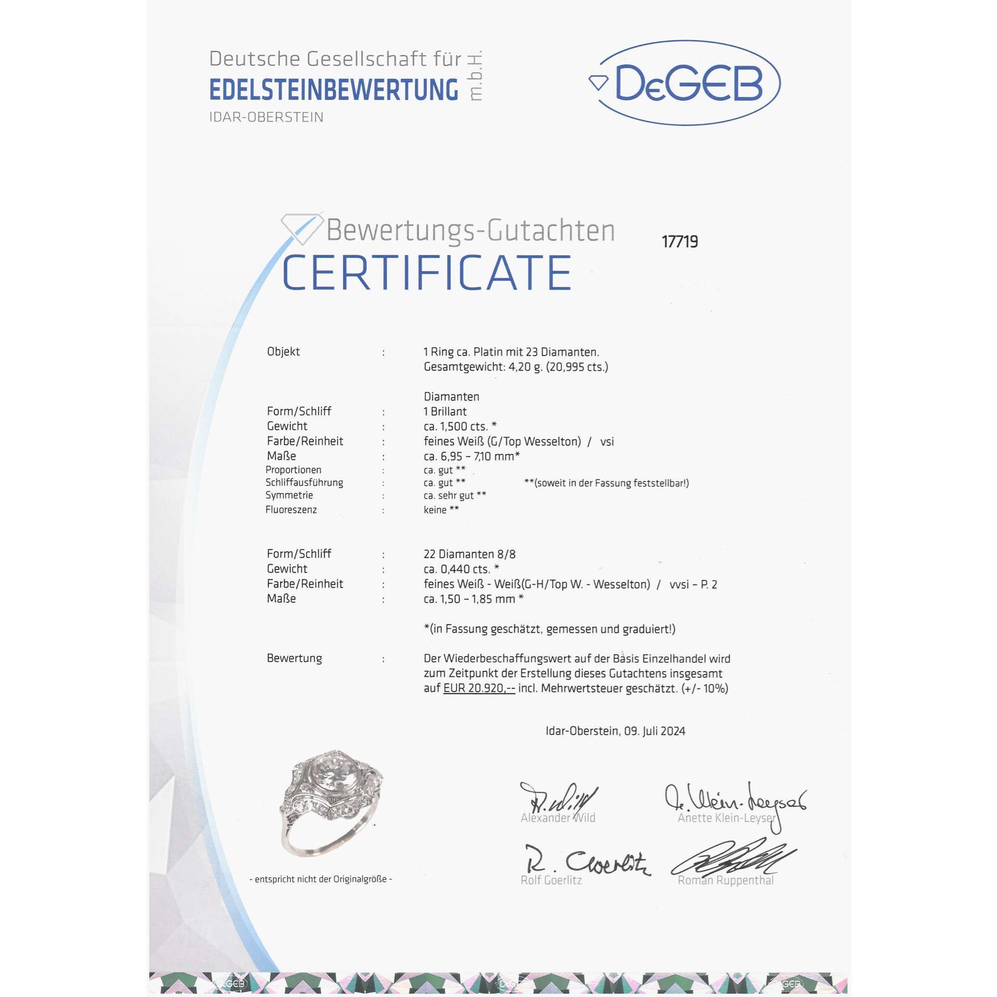| Material: | Ein Diamant im Altschliff (Old European Cut), ca. 1,500 ct, Feines Weiß (Top Wesselton, G), vsi Diamanten im 8/8-Schliff, zus. ca. 0,440 ct, Feines Weiß (Top Wesselton, G) – Weiß (Wesselton, H), vvsi-vsi, ein Stein pi2 Platin 960/000 |
