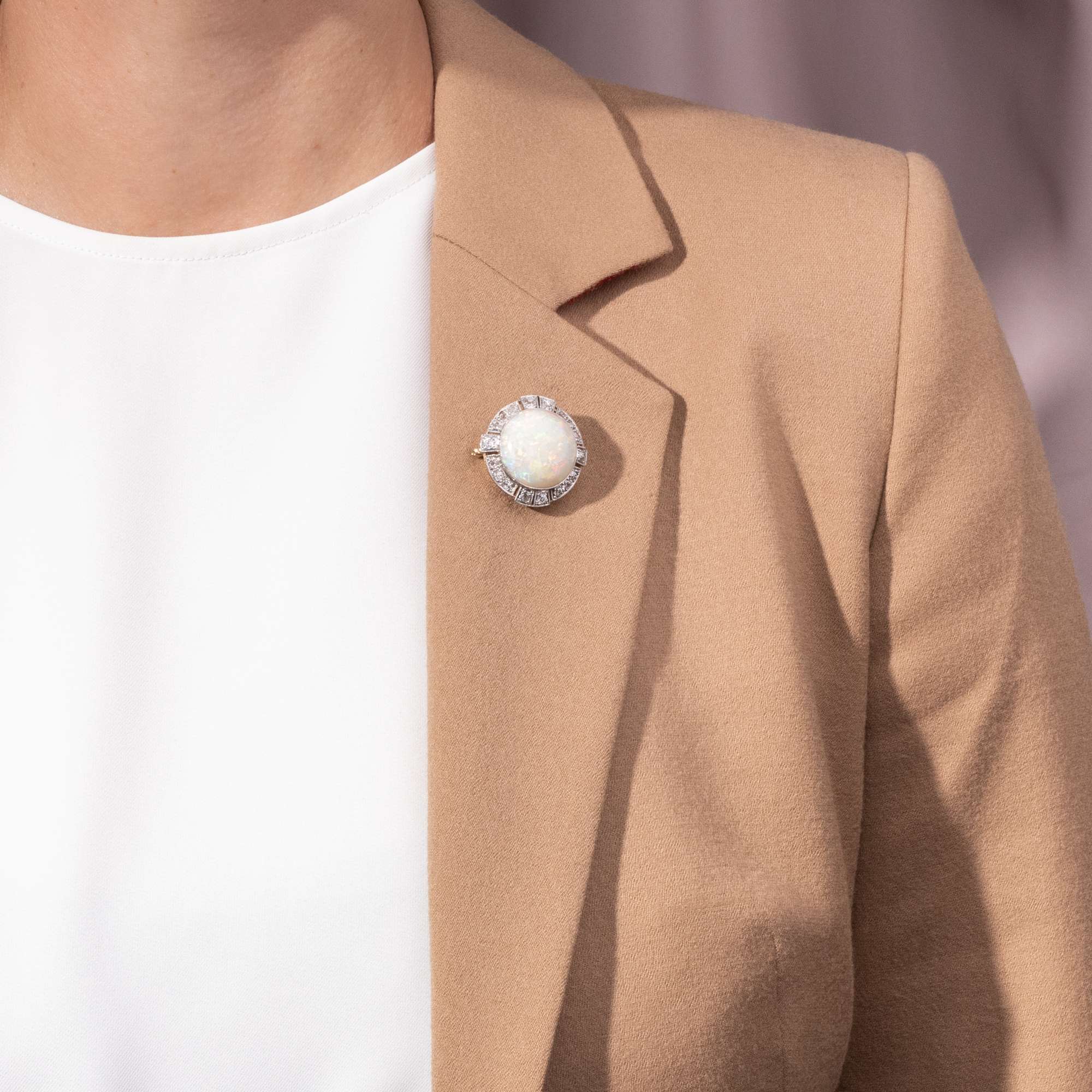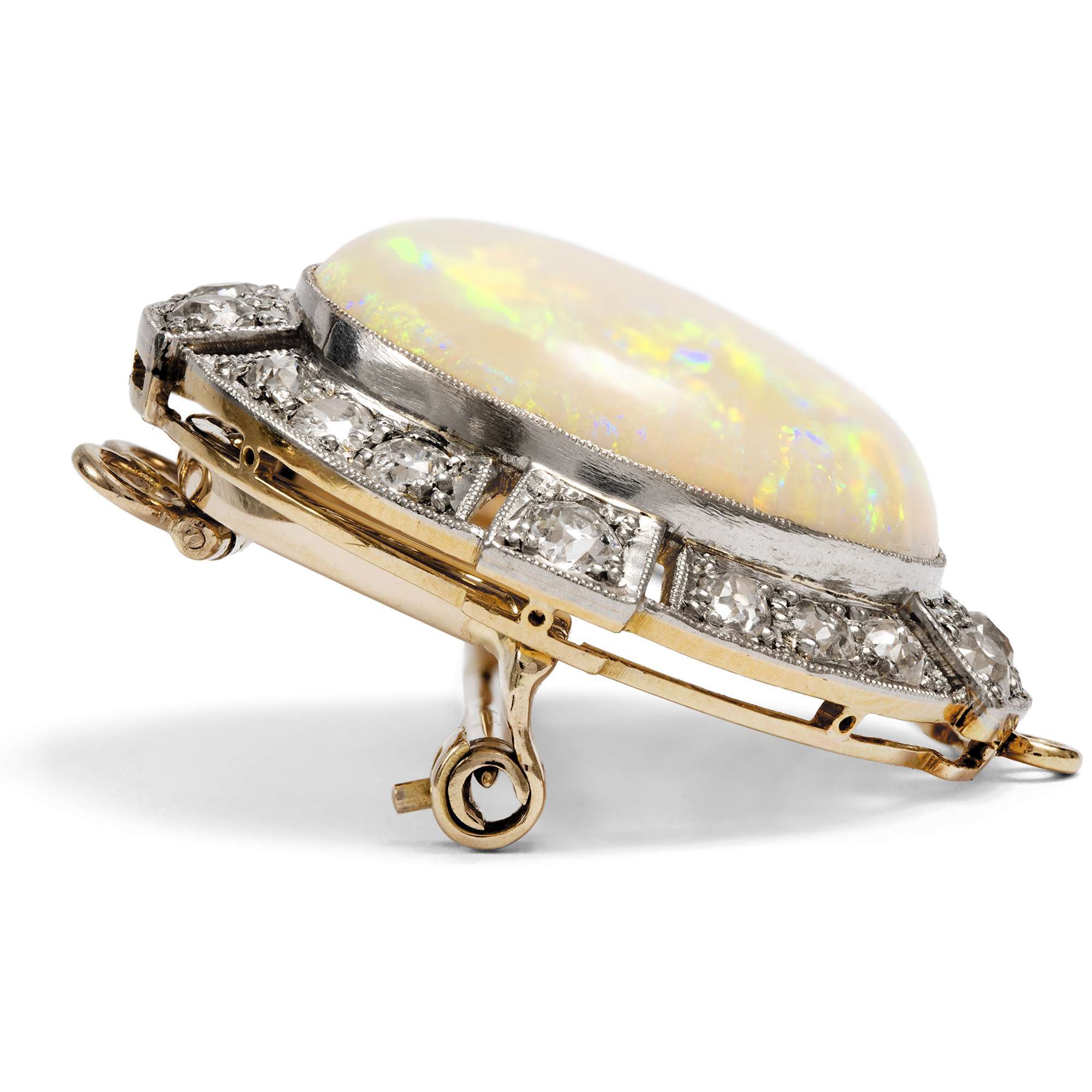 Gefasst ist der Opal in einen geometrisch entworfenen Rahmen aus Platin, besetzt mit Diamanten im Altschliff. Rund 1,20 ct Diamanten von guter Qualität umgeben den Opal mit weißem Licht. Die Unterkaderung schließlich ist, zeittypisch, aus Gelbgold gefertigt. Auf Grund ihres Entwurfes, des Schliffs der Diamanten und der Verarbeitung mit Platin auf Gold datieren wir das Schmuckstück in die Jahre um 1920.