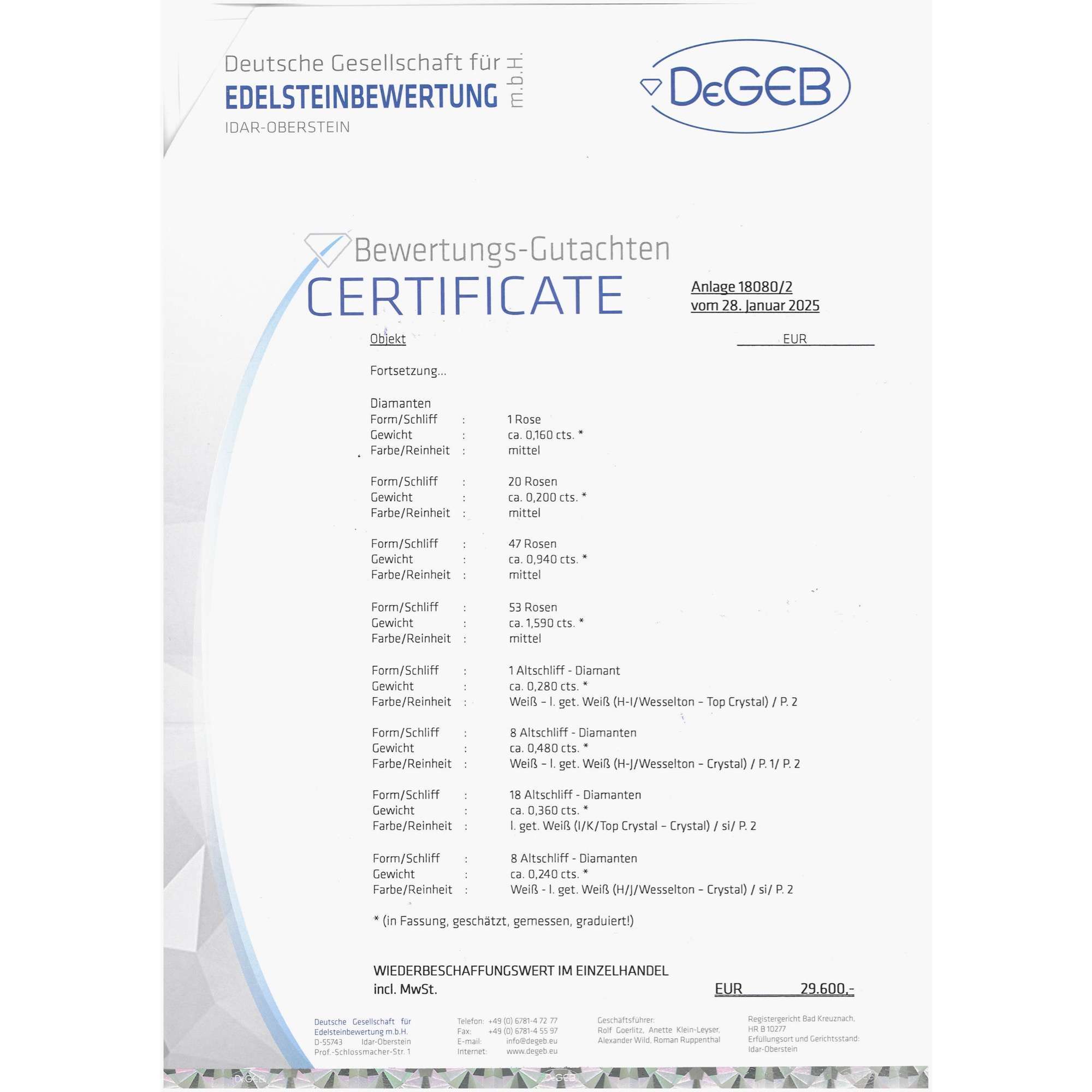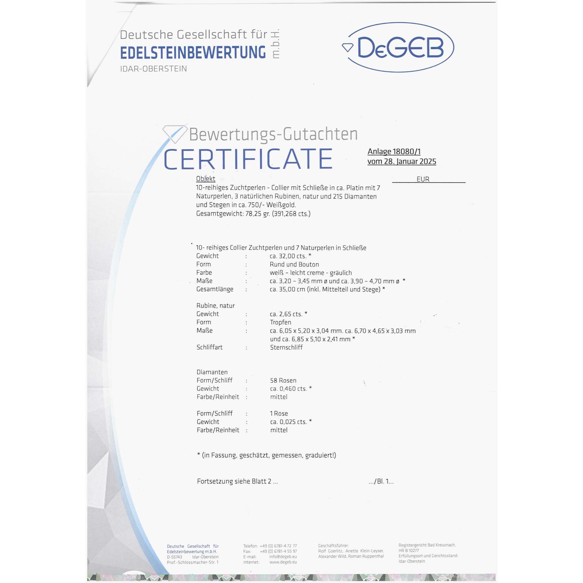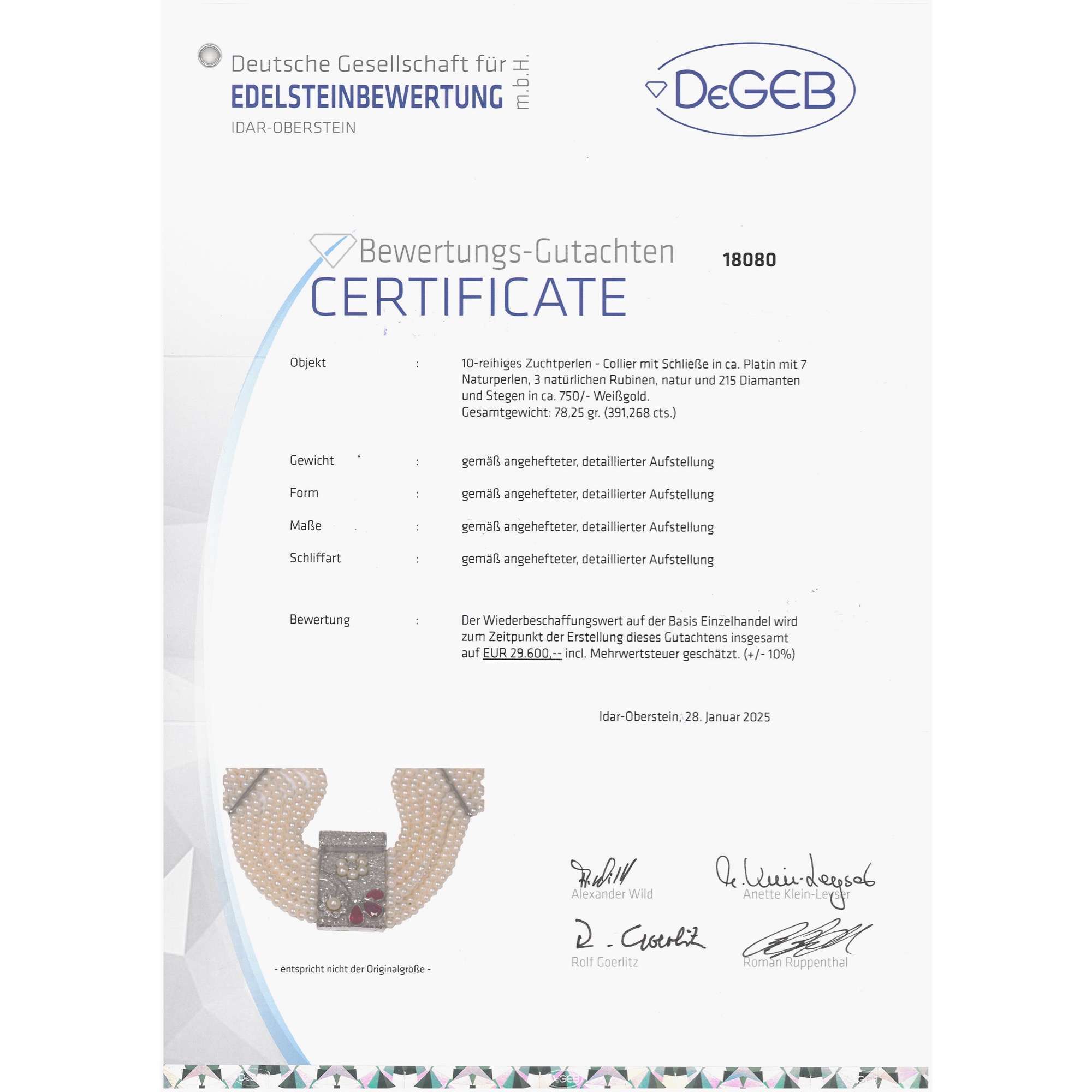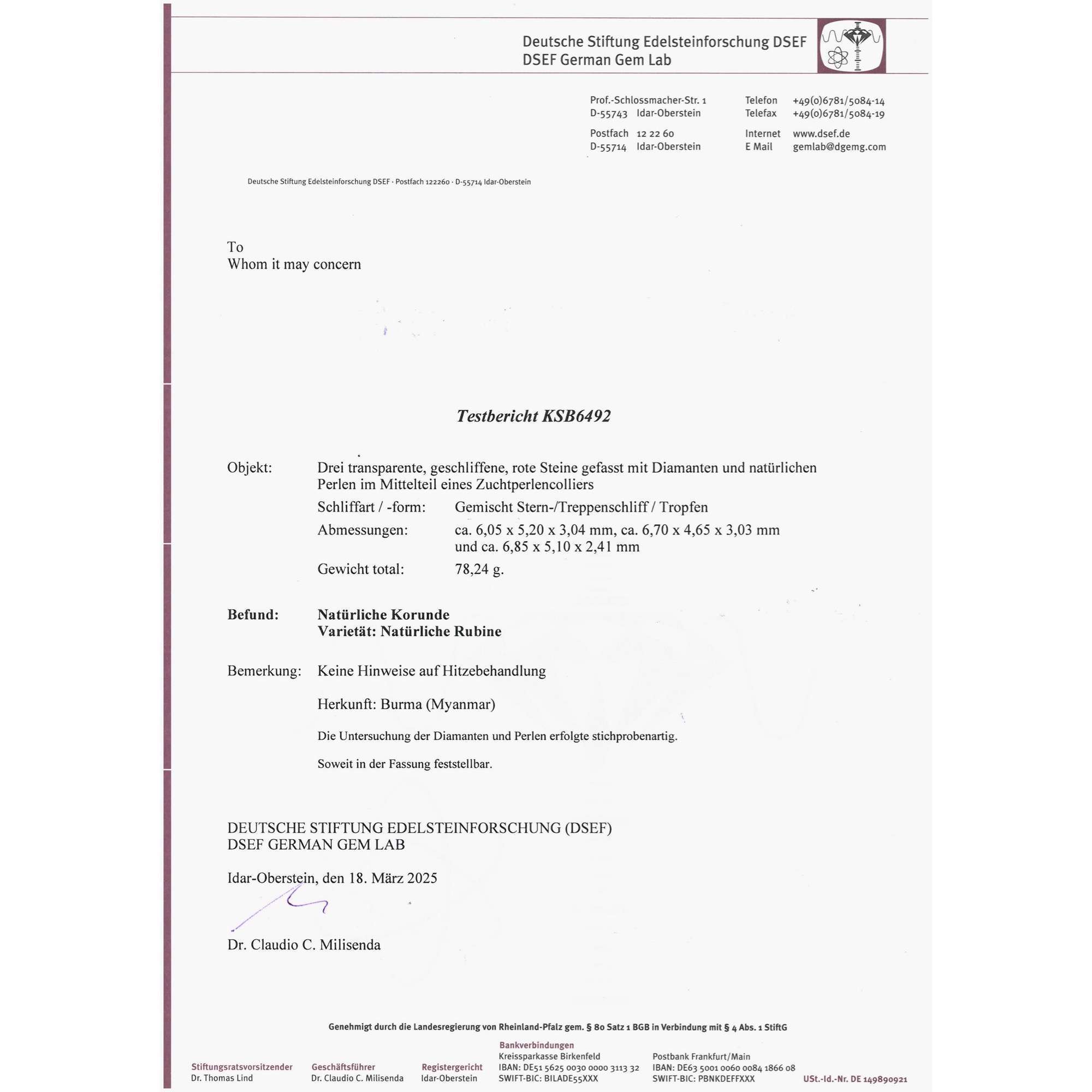 | Zertifikat: | Lieferung mit einem Gutachten der Deutschen Stiftung Edelsteinforschung zur Herkunft und Behandlung der Rubine sowie mit einem detaillierten Gutachten der Deutschen Gesellschaft für Edelsteinbewertung vom 28. Januar 2025. Festgestellter Wiederbeschaffungswert: 29.600,- Euro. |