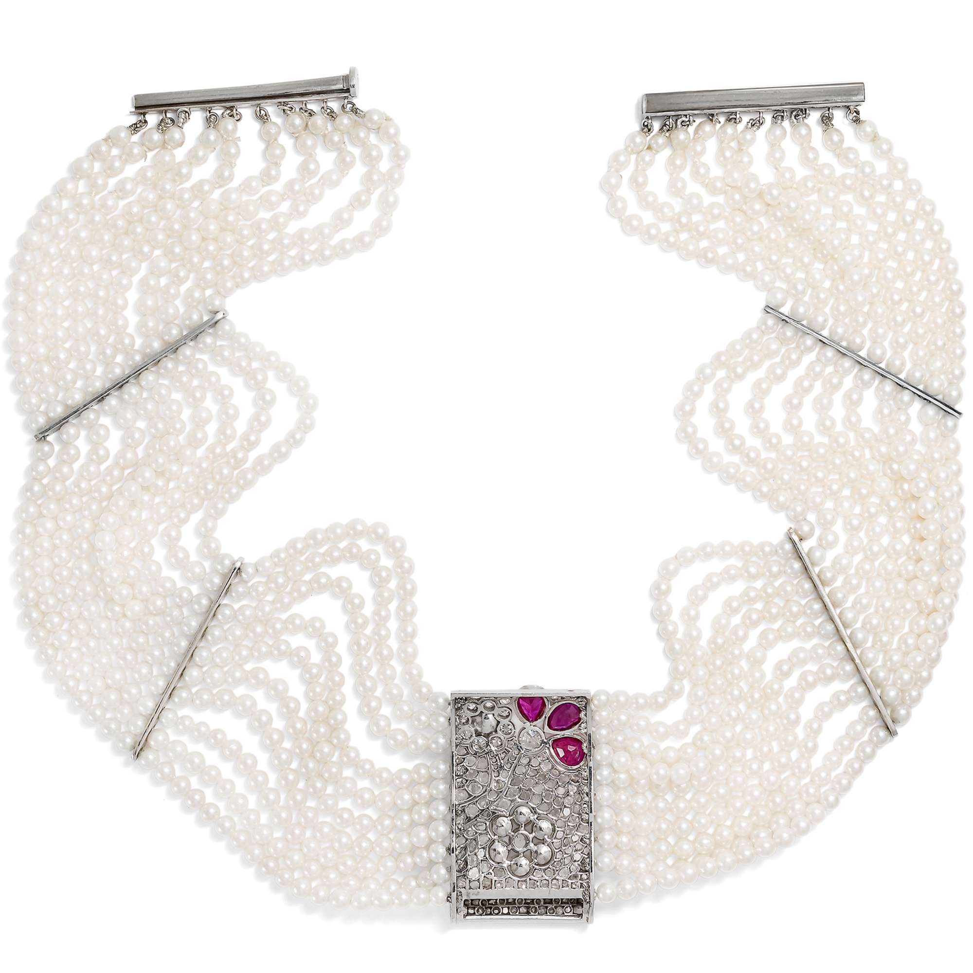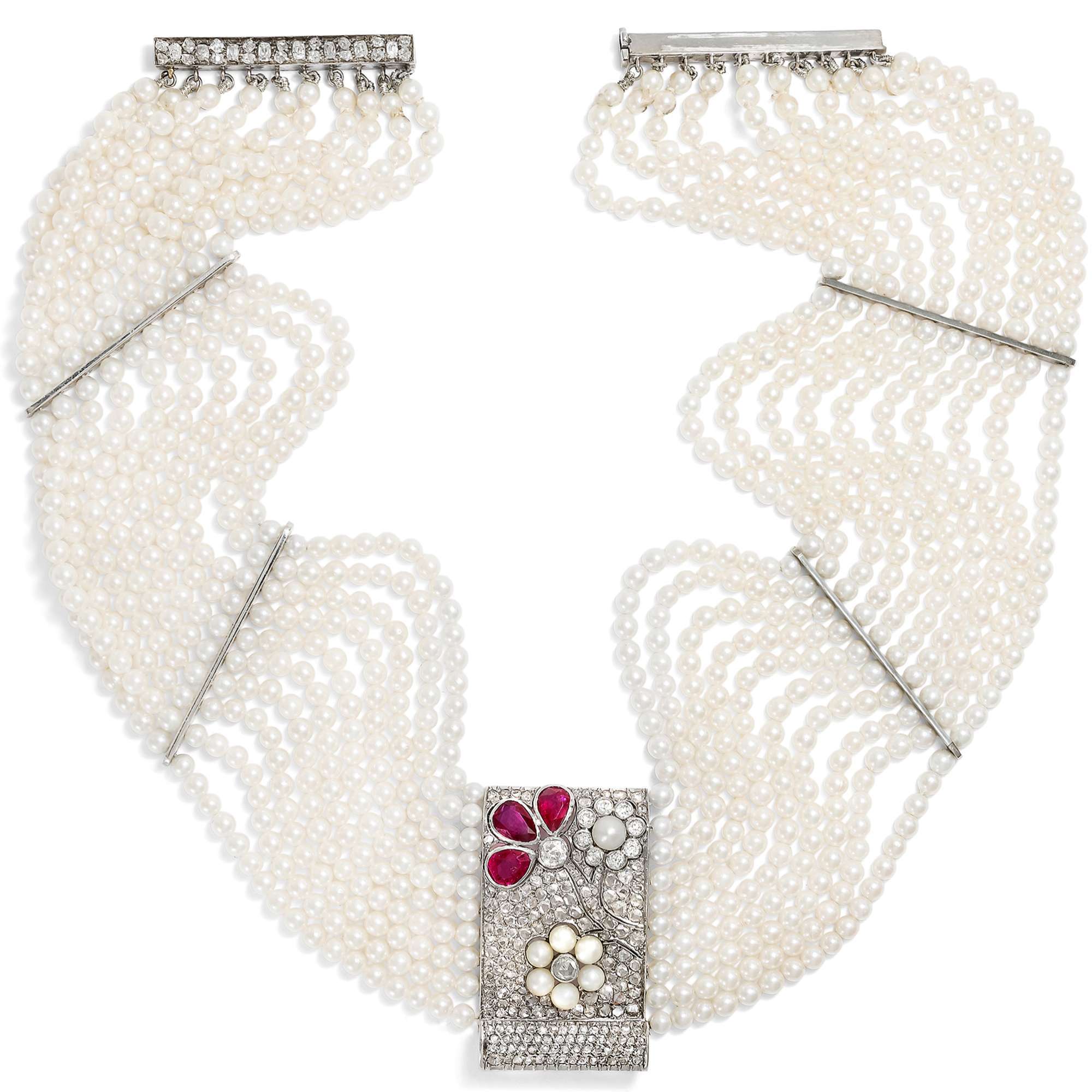 | Material: | Drei natürliche, unbehandelte Rubine aus Burma im Sternschliff, Tropfenform, zus. ca. 2,65 ct, max. 6,5 x 4,6 mm 35 Diamanten im Altschliff (Old European Cut und weitere, kissenförmige ältere Schliffe), zus. ca. 1,36 ct, Weiß (Wesselton, H) – Getöntes Weiß+ (Top Cape, K), si–pi 180 Diamanten im Rosenschliff, zus. ca. 3,37 ct, mittlere Reinheit und Farbe Sieben natürliche Salzwasserperlen (Orientperlen) auf dem Schaustück, max. 4,9 mm Durchmesser Zehn Reihen Salzwasser-Zuchtperlen (Akoyaperlen), cremeweiß, 3,2 –3,4 mm Durchmesser Schaustück in der Mitte aus Platin Stege und Schließe Weißgold 750/000, entspricht 18 Karat |