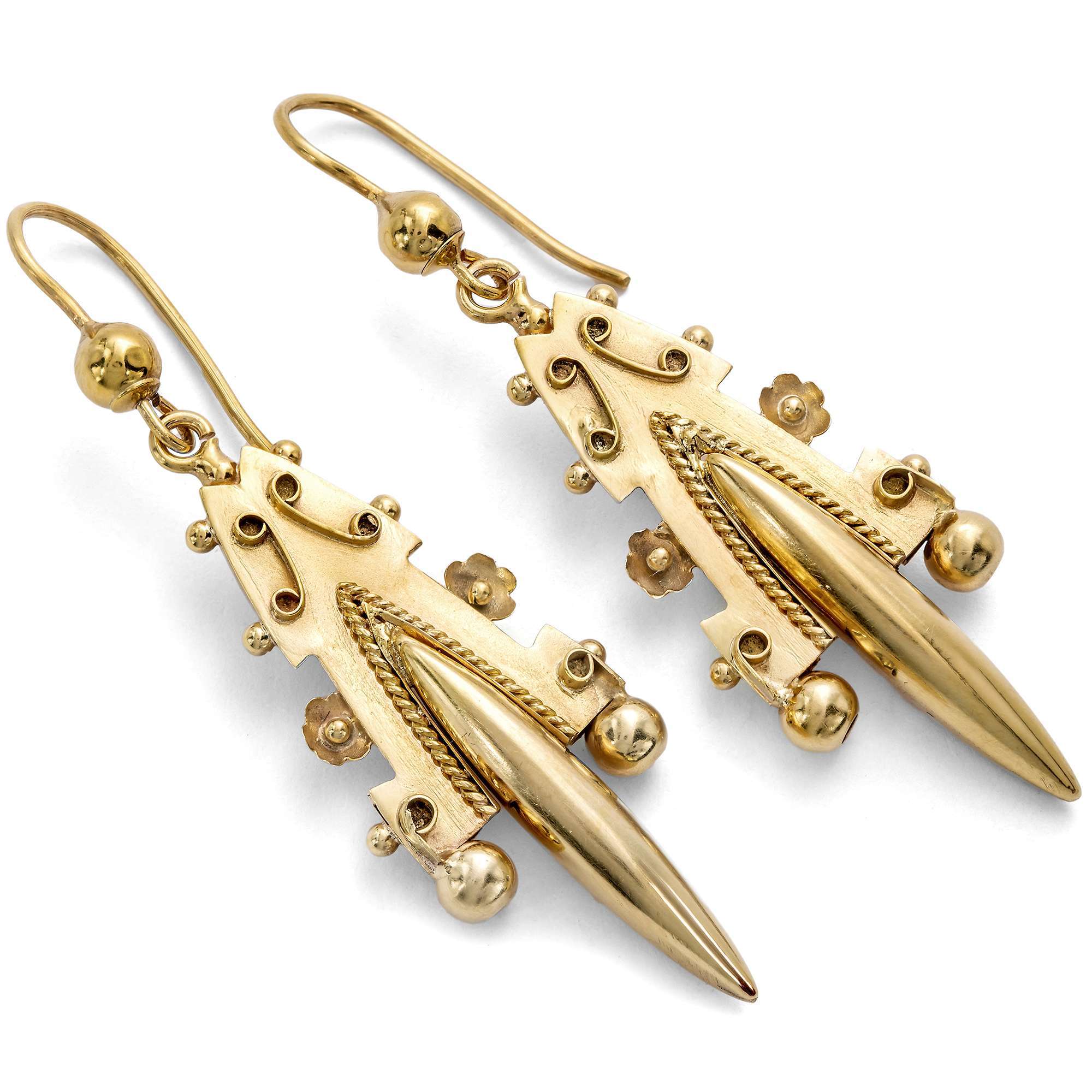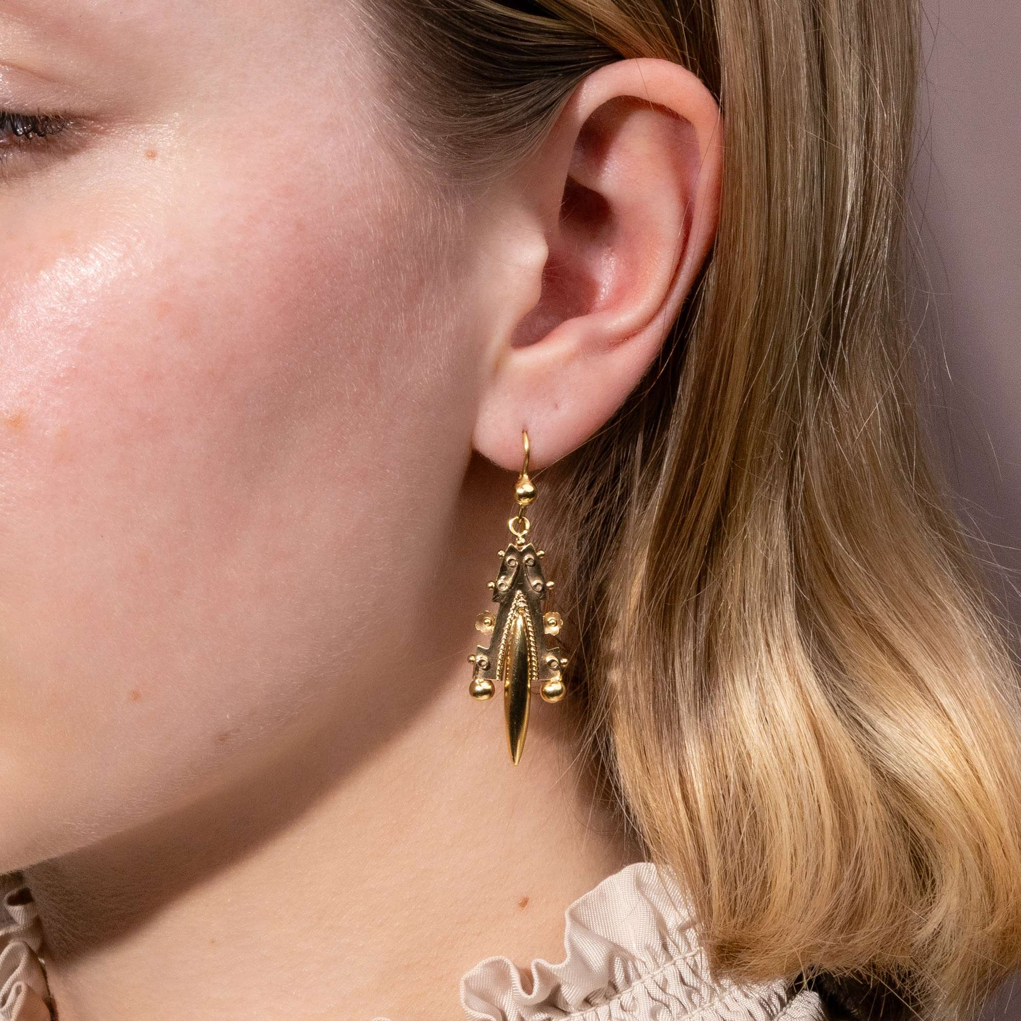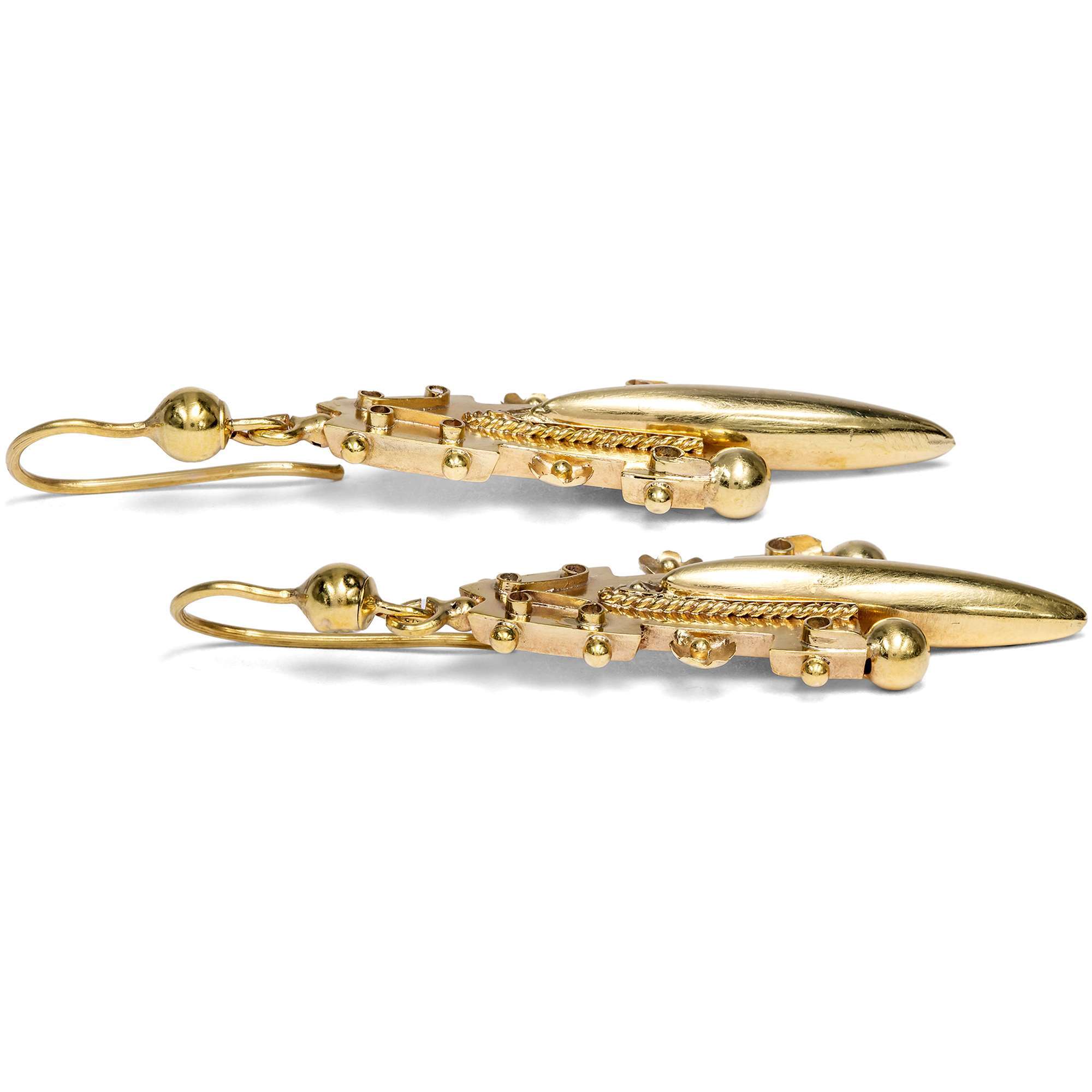 Das hier vorliegende Paar Ohrringe spricht die Formensprache dieser Mode. Unter einem Ohrbügel mit angebrachter Kugel ist ein reich verziertes Element beweglich angebracht, das Blüten zusammen mit feinen Kordelbelötungen und gewickelten Golddrähten zeigt. Teile des Ornaments sind glatt poliert, während andere samtig matt schimmern.