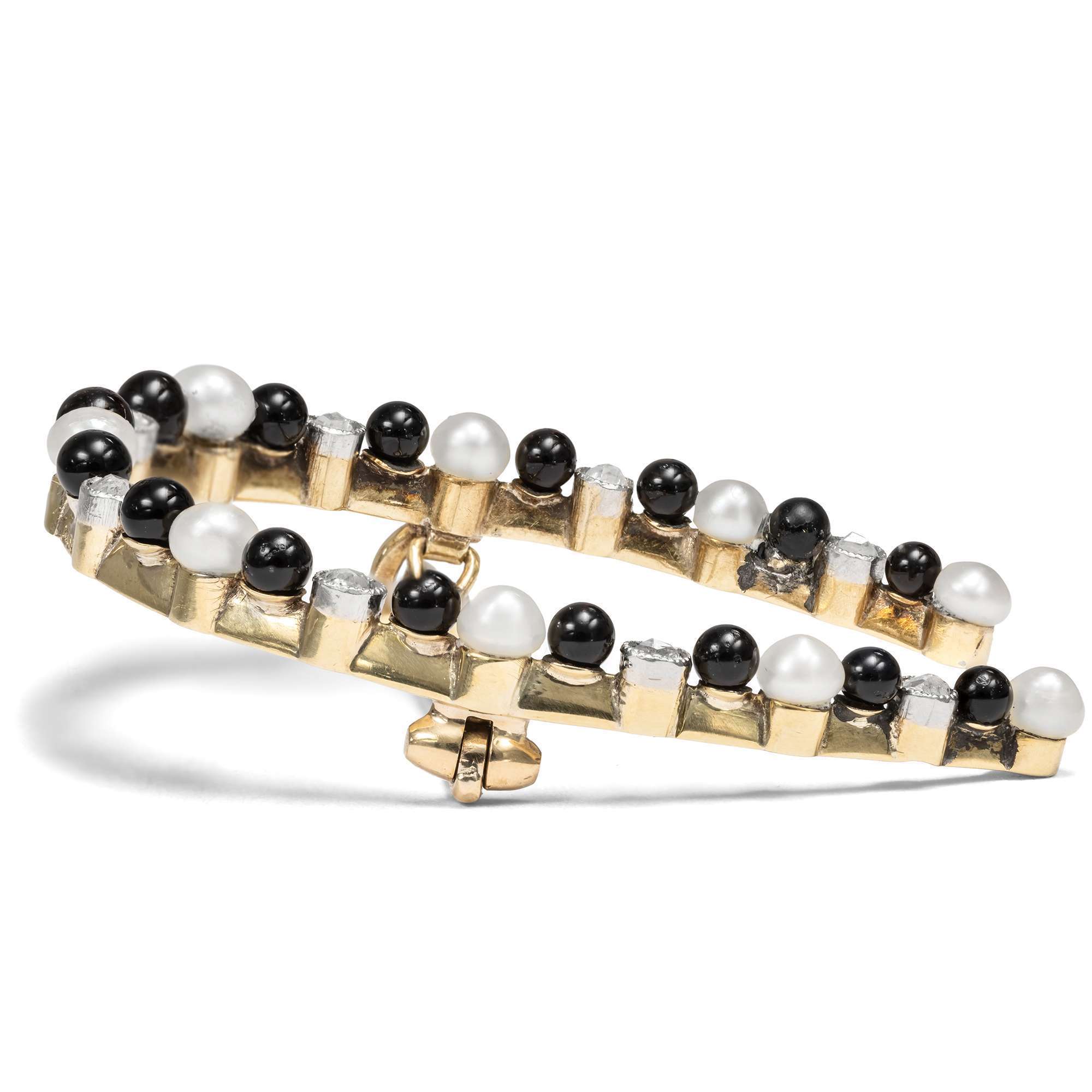 | Material: | Neun natürliche Salzwasser-Perlen (Orientperlen), je etwa 3,0 mm Durchmesser Acht Diamanten im Rosenschliff, zus. ca. 0,12 ct, Feines Weiß (Top Wesselton, G) – Leicht getöntes Weiß (Crystal, J), si-pi, gute Farbe und Reinheit 16 Perlen aus Onyx, 2,2 bis 2,8 mm Durchmesser Gold 585/000, entspricht 14 Karat Fassungen der Diamanten aus Platin |