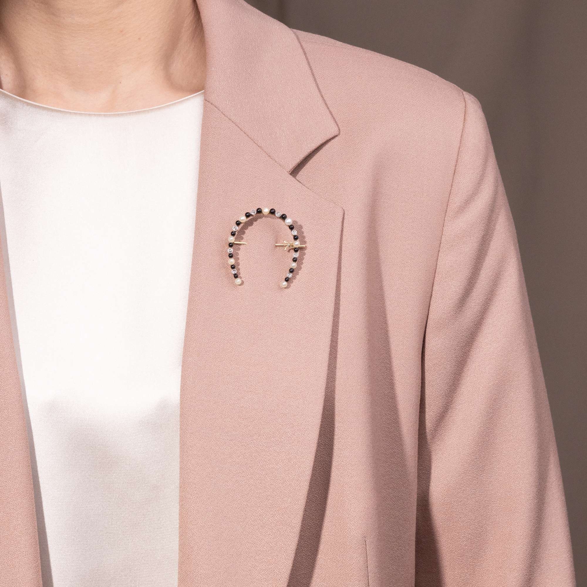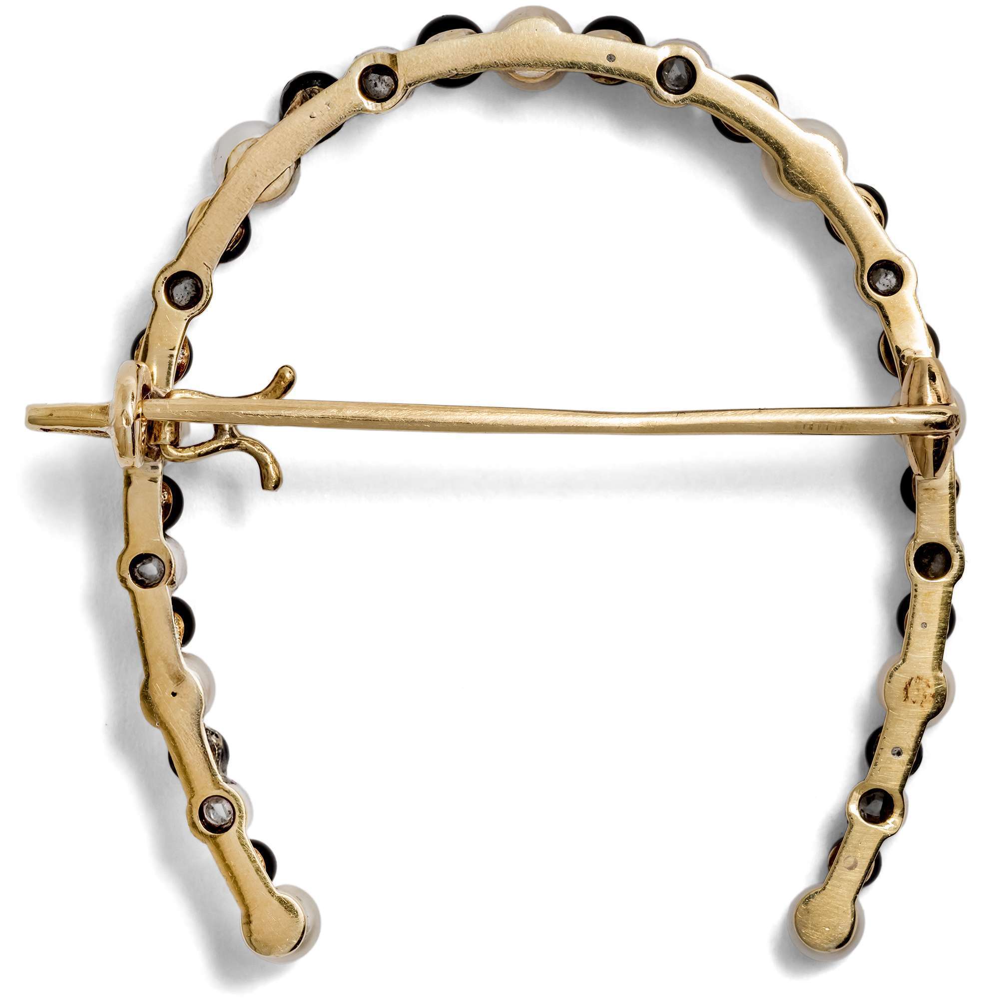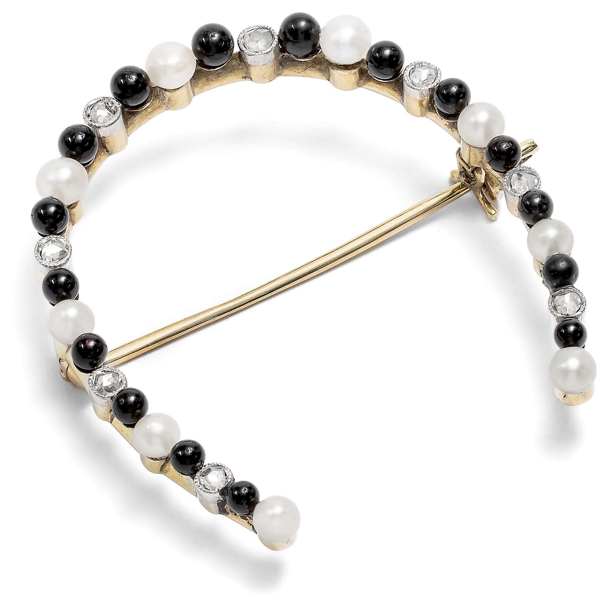 Die hier vorliegende Brosche ist mit der Öffnung nach unten zu tragen: Sie hält das Glück also fest bei seiner Trägerin. Dabei kombiniert der Entwurf Perlen, Diamanten und schwarzen Onyx zu einem Entwurf im Geschmack der Belle Époque: Delikat und kostbar, fein verarbeitet und geschmackvoll.