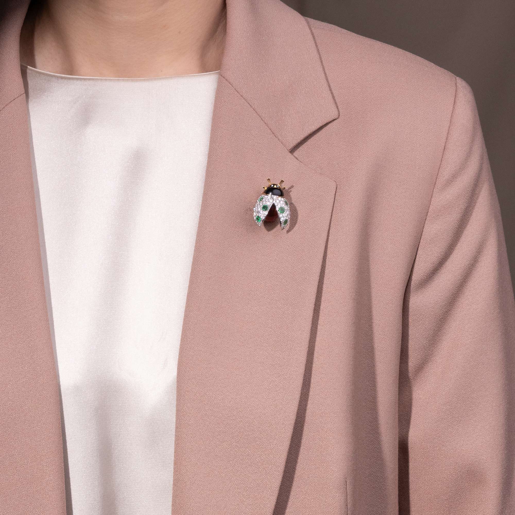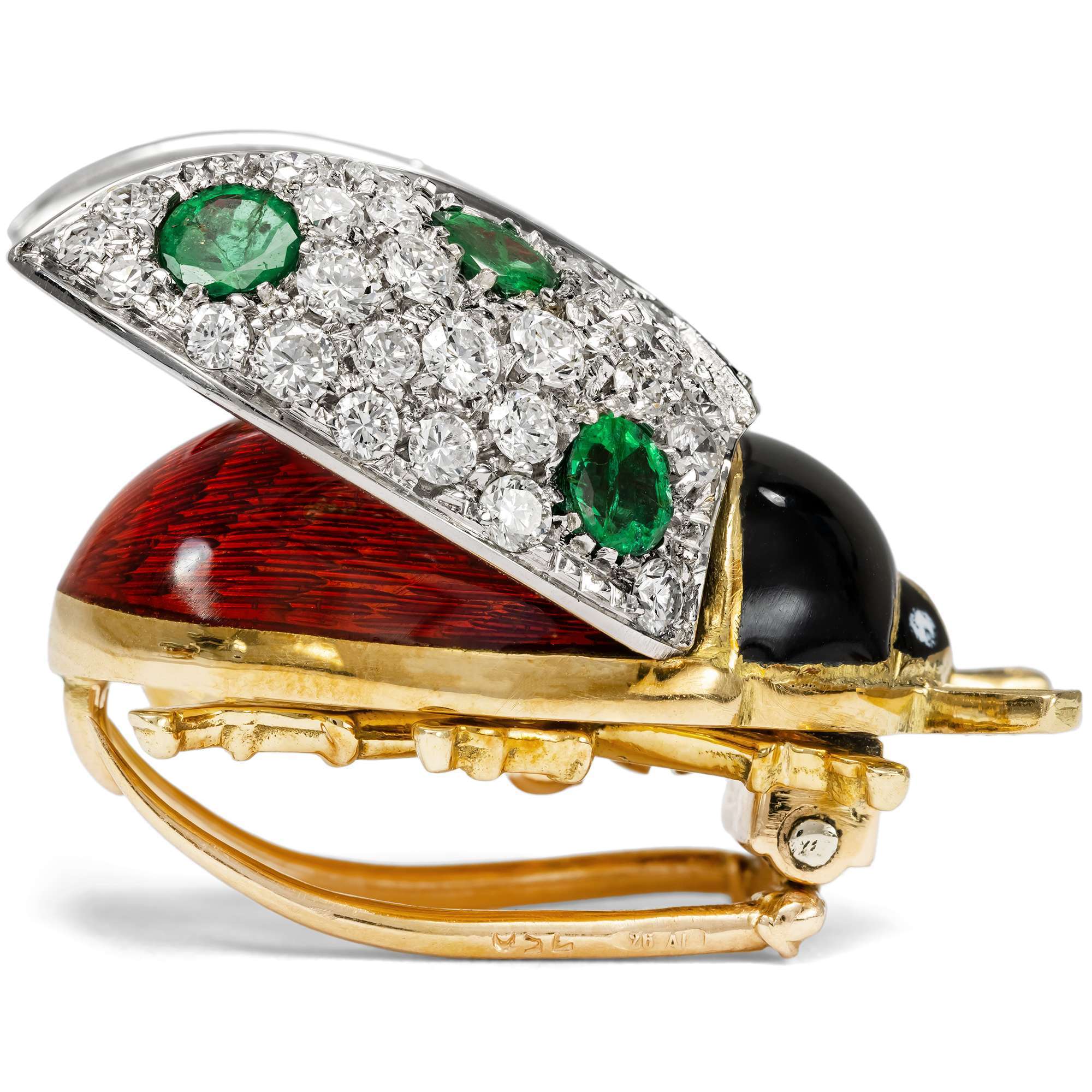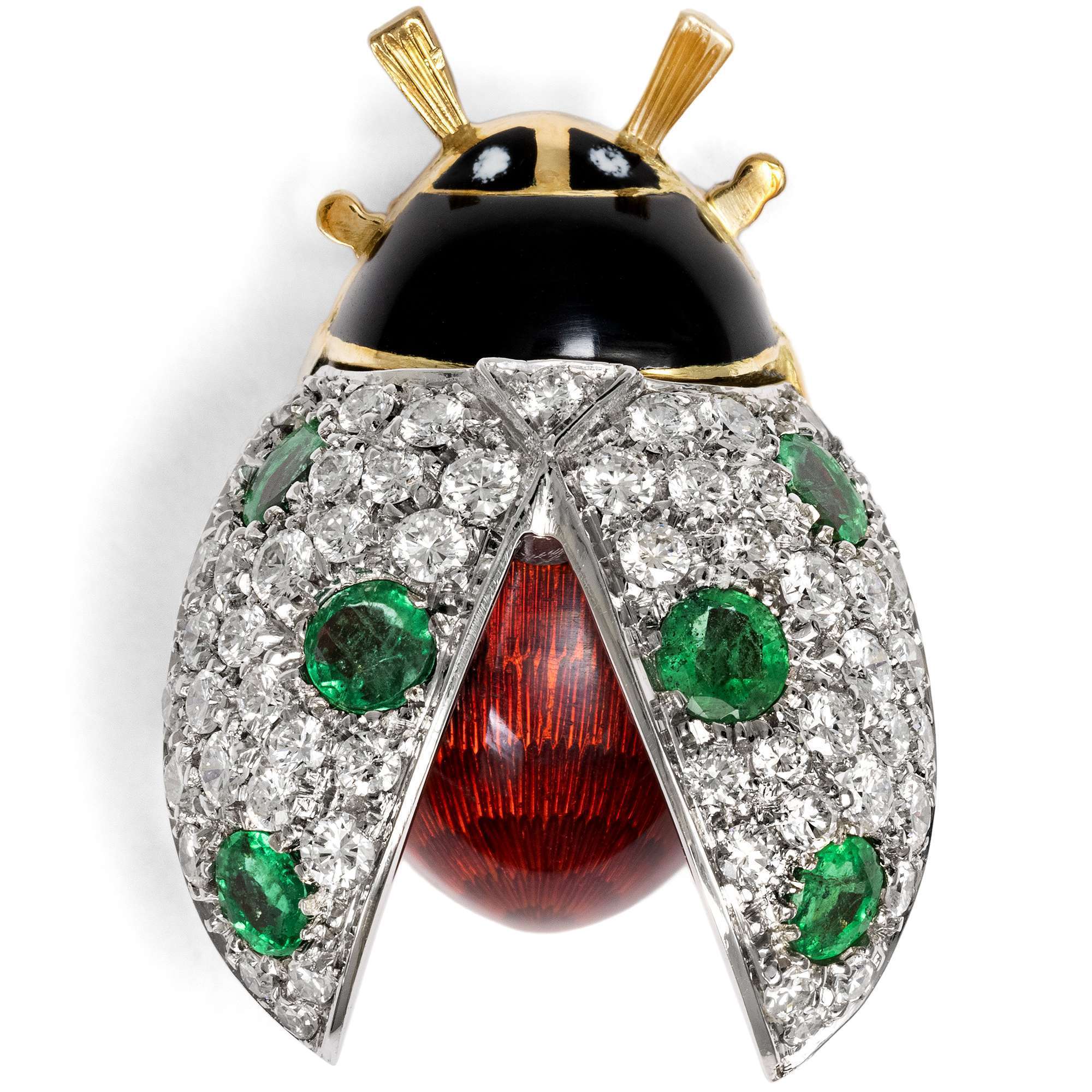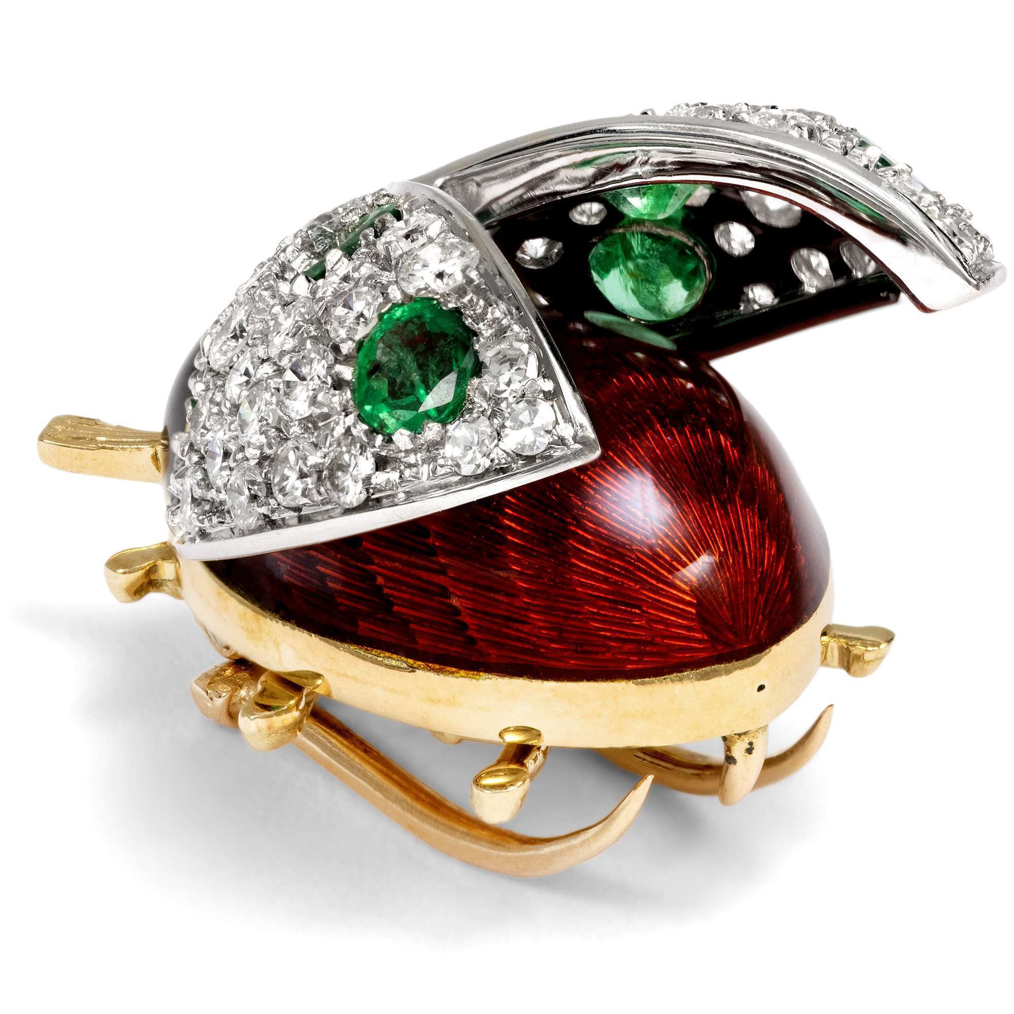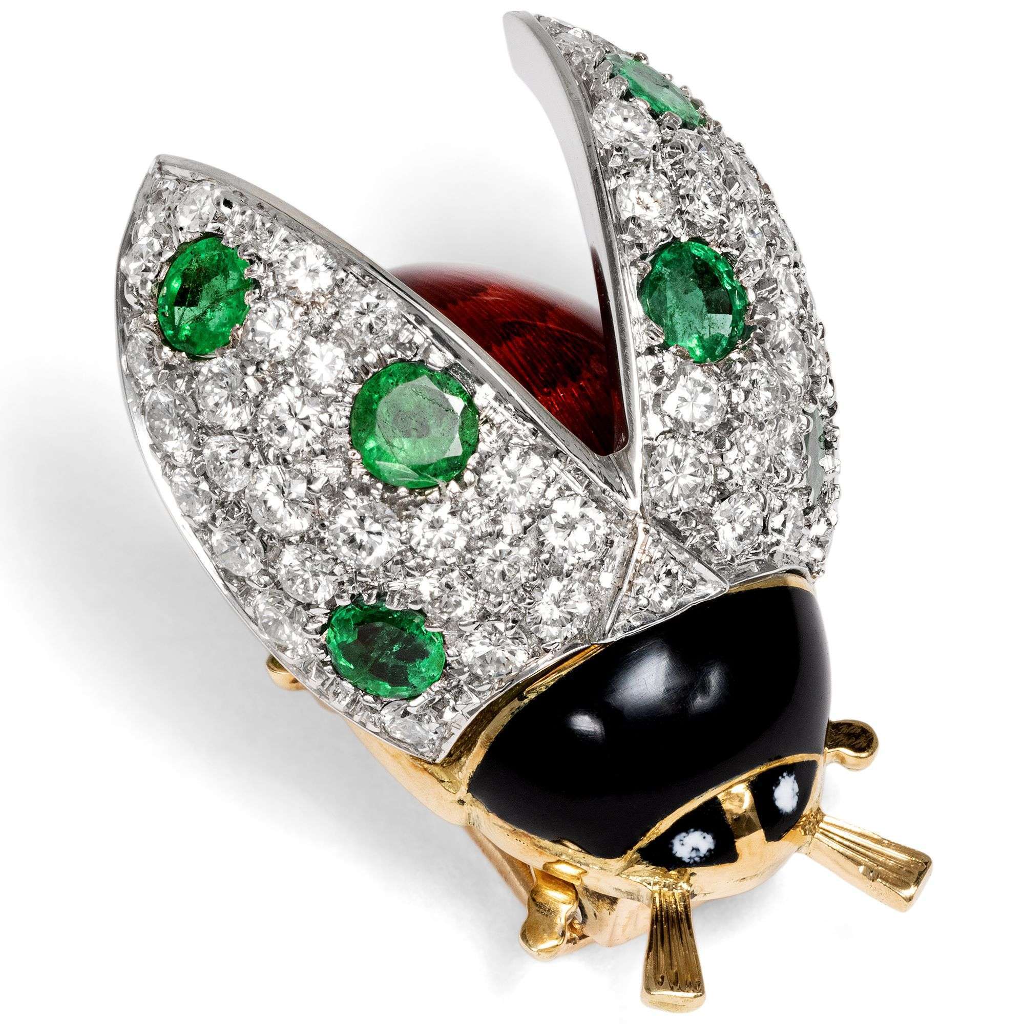 Der hier vorliegende Glückskäfer hat einen rot emaillierten Körper mit schwarzem Kopf. Seine Flügel sind mit 53 feinen weißen Diamanten besetzt, zwischen denen sechs grüne Smaragde funkeln. Die aufgestellten Flügel bestehen aus Weißgold, während das restliche Tierchen aus Gelbgold geschmiedet ist. Es handelt sich um das große, heute nicht mehr hergestellte Modell.