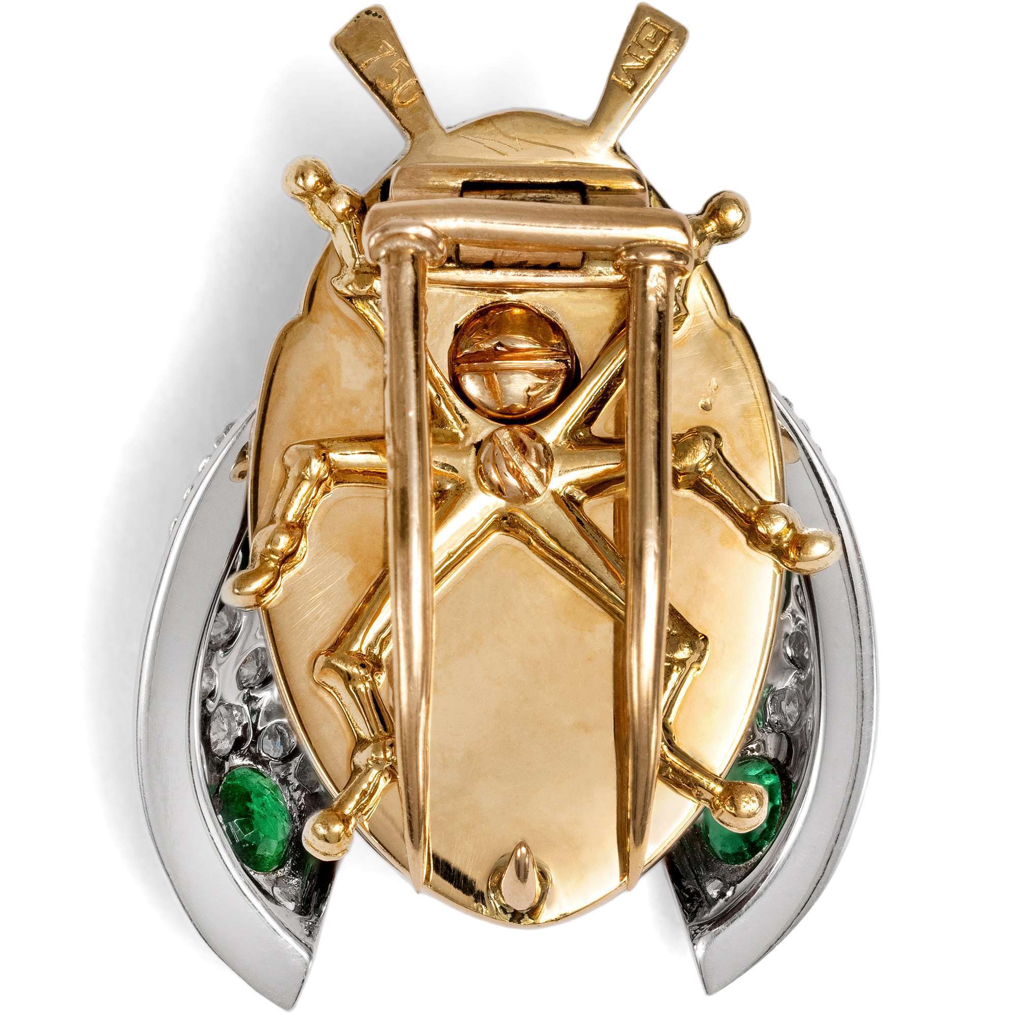 | Stempelungen: | Der Feingehaltsstempel „750“ und die Werkstattmarke „EM“ für Emil Meister auf der Rückseite der Fühler, zusätzlich eine italienische Stempelung für die Werkstatt von Carlo Illario „26 AL“ auf der Nadel |