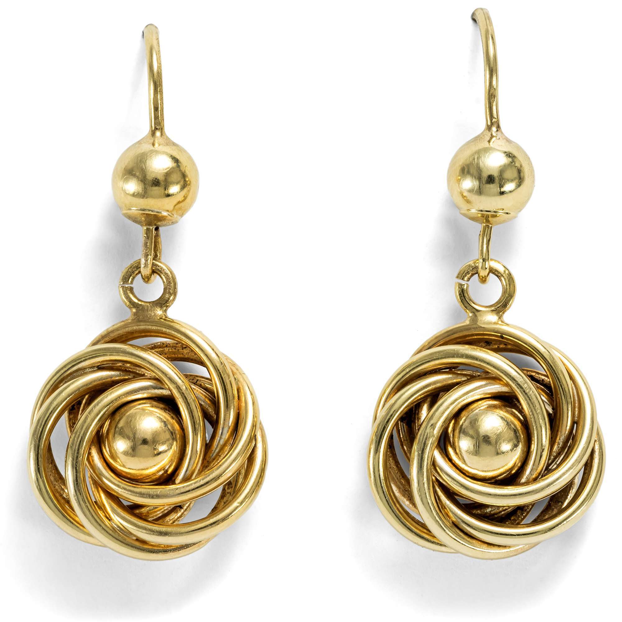 Das vorliegende Paar Ohrringe stammt aus dem viktorianischen England. Es zeigt sich in Form sogenannter Lover’s Knots oder Liebesknoten aus jeweils vier kunstvoll ineinander verschlungenen Goldbändern.