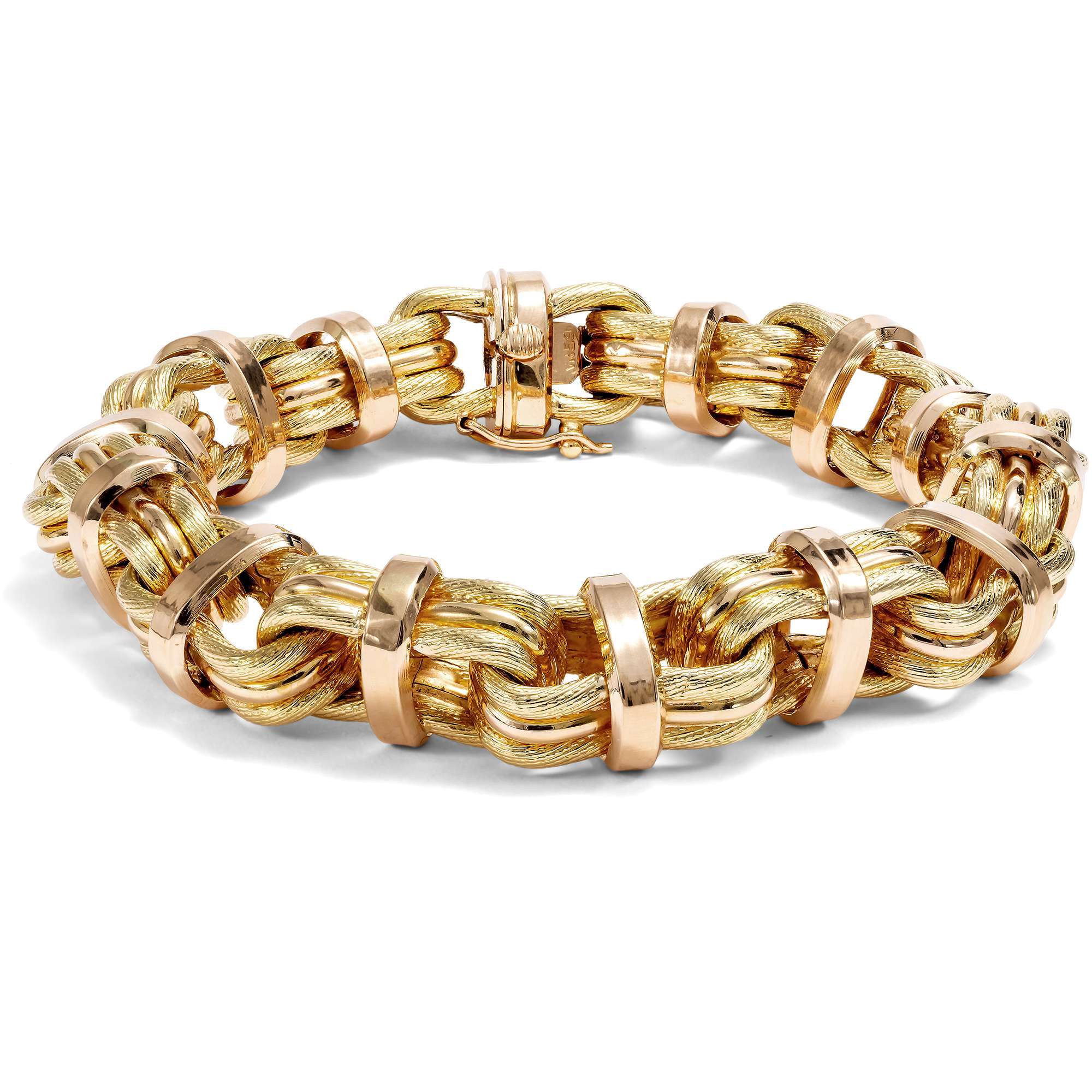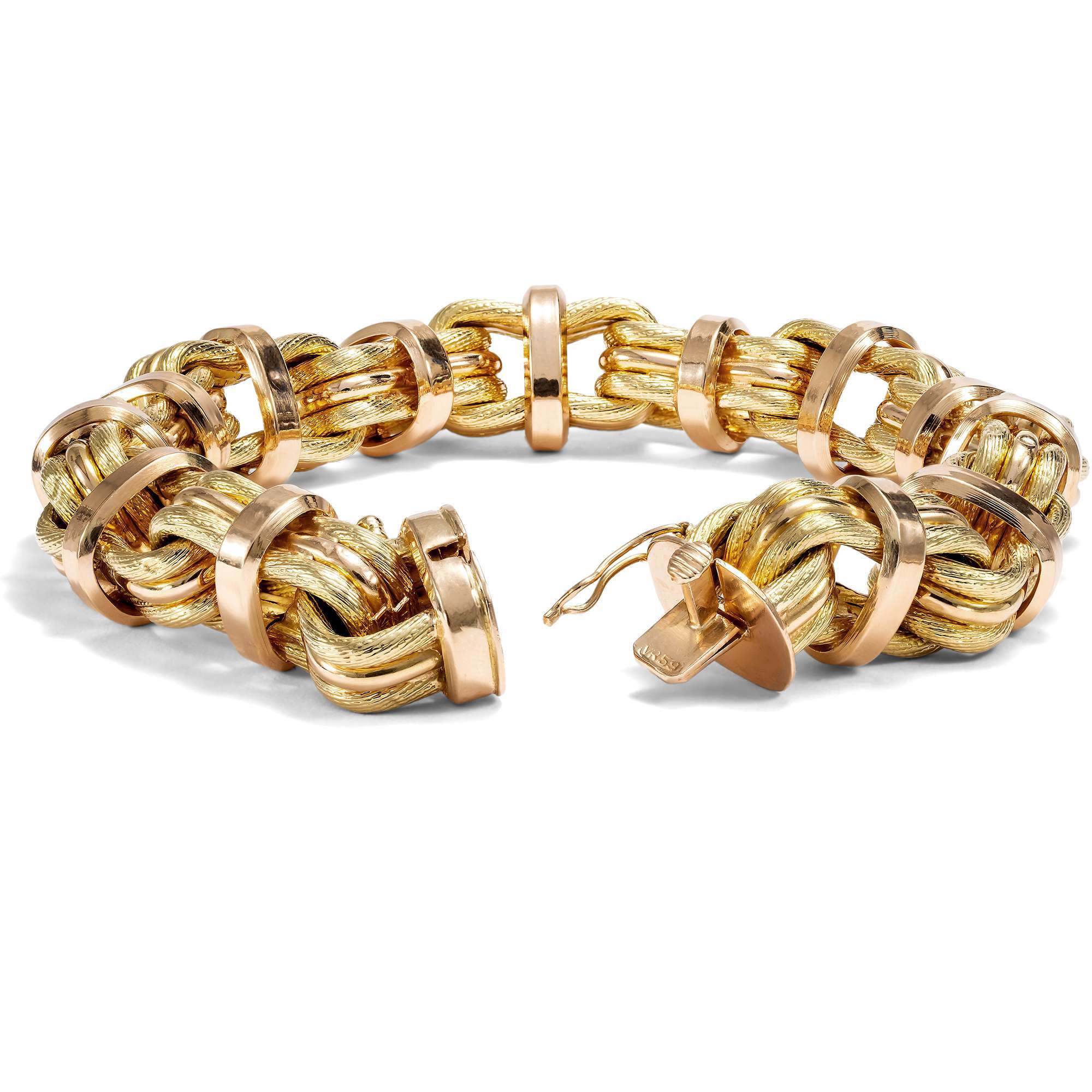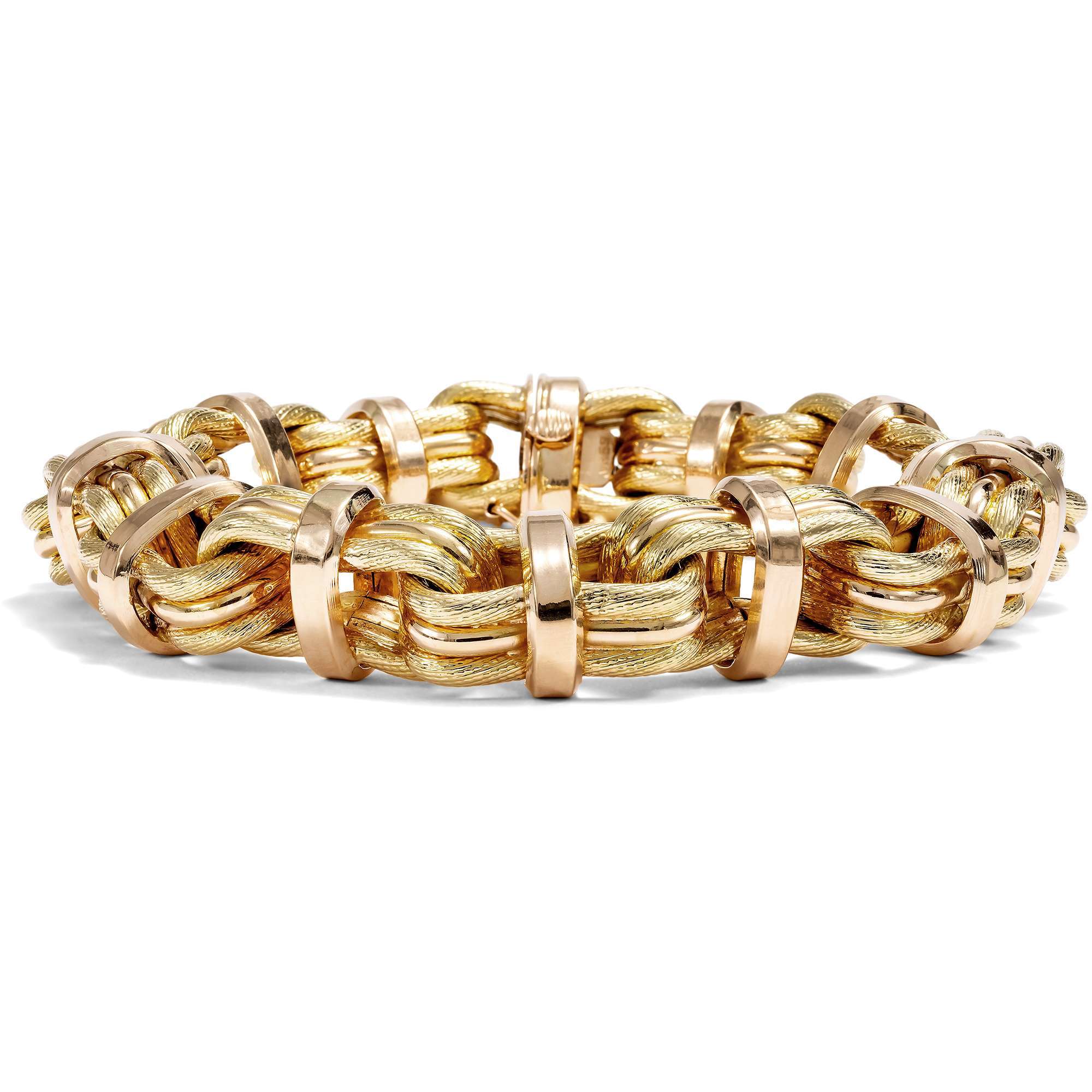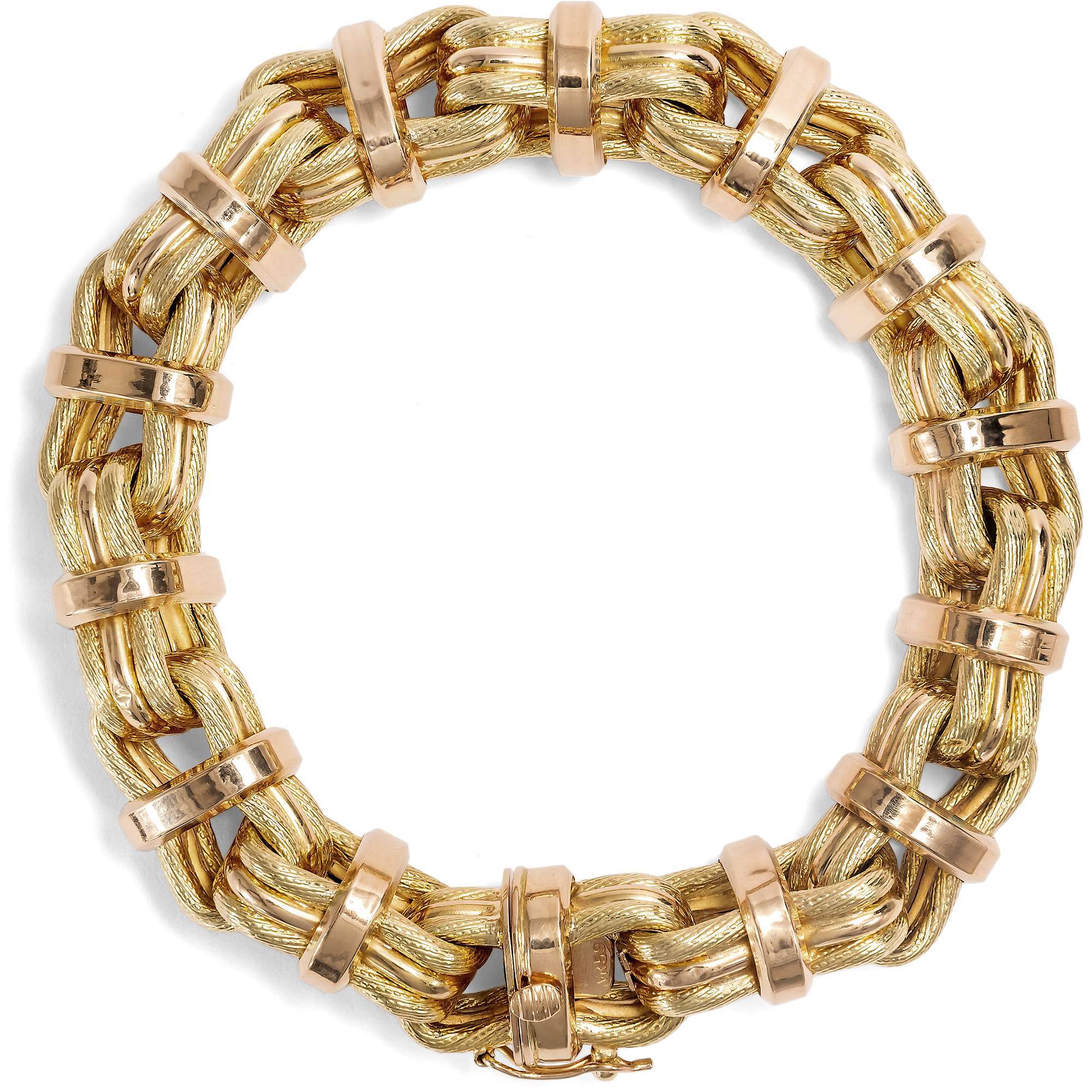 Das hier vorliegende Armband entstammt dieser Zeit und führt uns all diese in ganz Europa verbreiteten Stilmerkmale ganz wunderbar vor Augen. Das Armband aus warm leuchtendem Gelbgold und Roségold ist aus voluminösen, ineinandergreifenden Gliedern gebildet, die wie gebundene Taue wirken, sodass ganz ohne Zuhilfenahme kostbarer Edelsteine ein reicher Eindruck voller Lichteffekte entsteht.