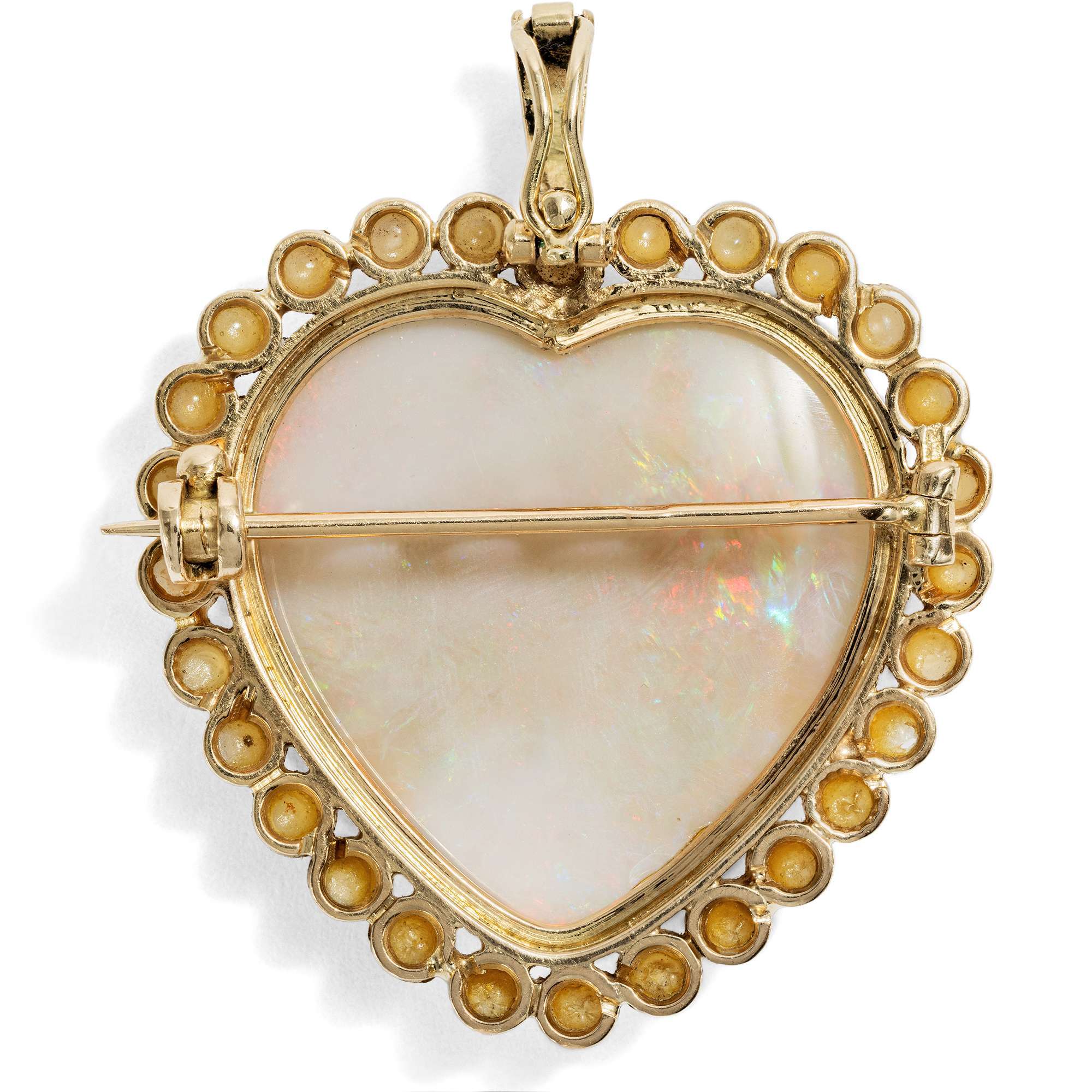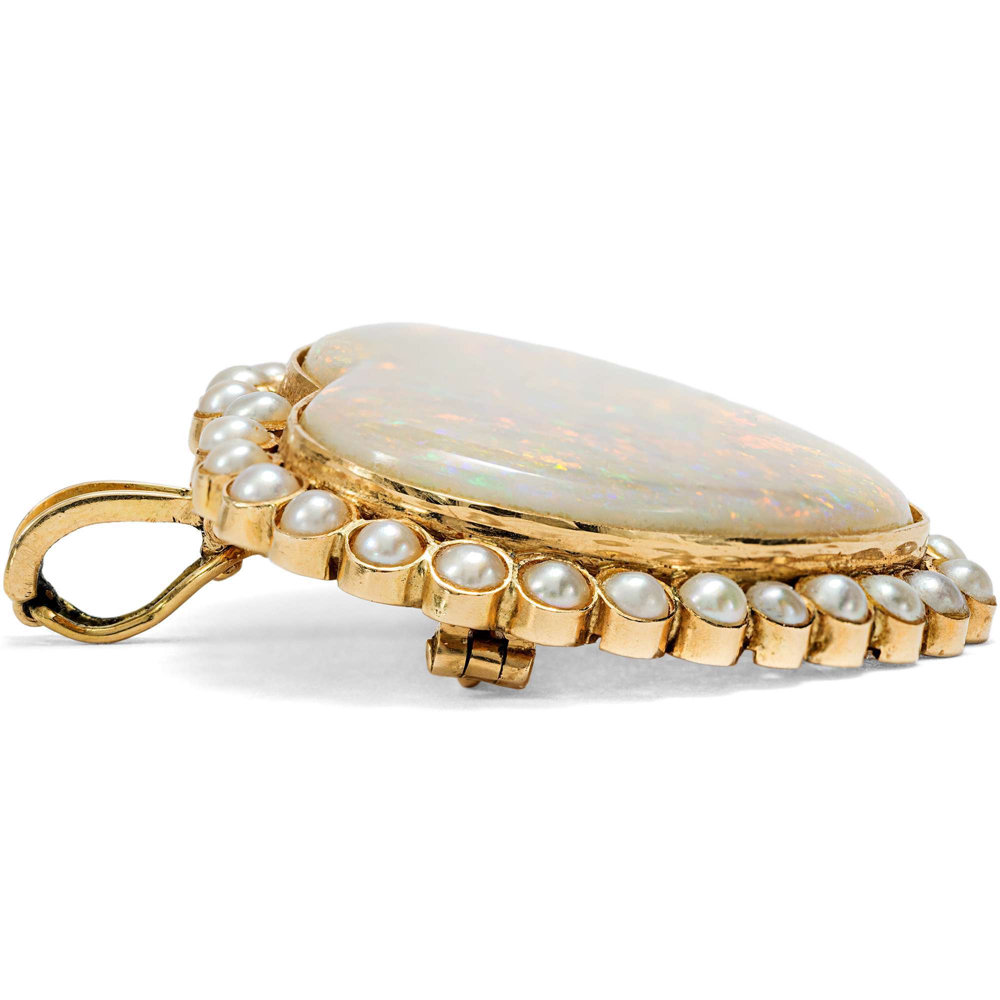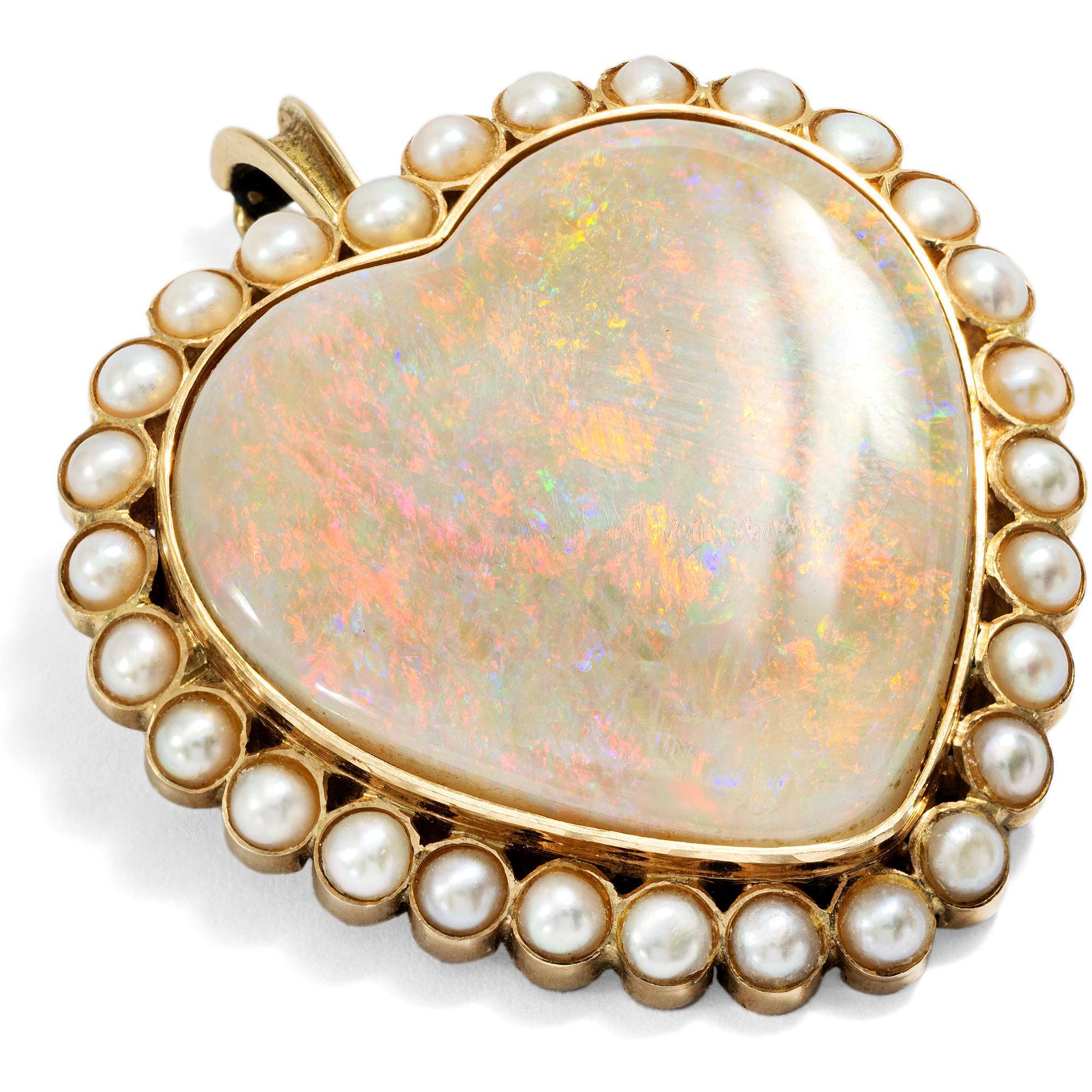 Kleine Zuchtperlen sind als Rahmung um das Herz gesetzt. Gehalten werden sie von einer Fassung aus Gold, die sich maximal zurücknimmt und dem zarten Farbspiel des großen Opals und der zarten Perlen den Vorrang lässt.