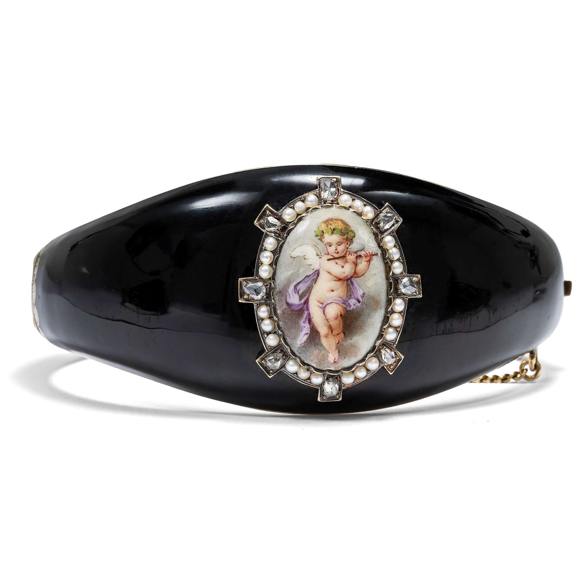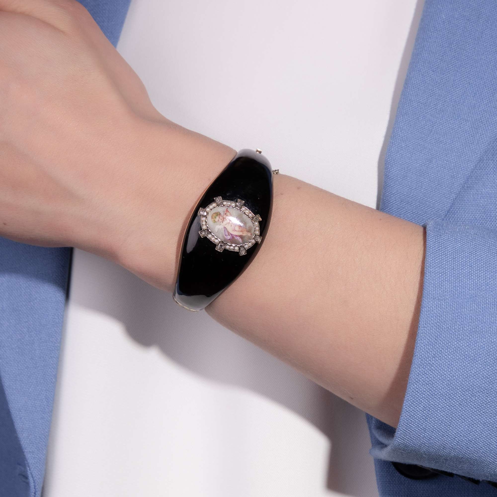 Gewölbte, sog. „bombierte“ Armreifen waren eine große Mode der 1860er Jahre, ebenso wie Schmuckstücke mit einem Überzug aus schwarzem Email. Seine glänzende Oberfläche ergibt einen eleganten, verfeinerten Eindruck, und ist die optimale Bühne für die hell leuchtende Malerei in ihrem funkelnden Rahmen.