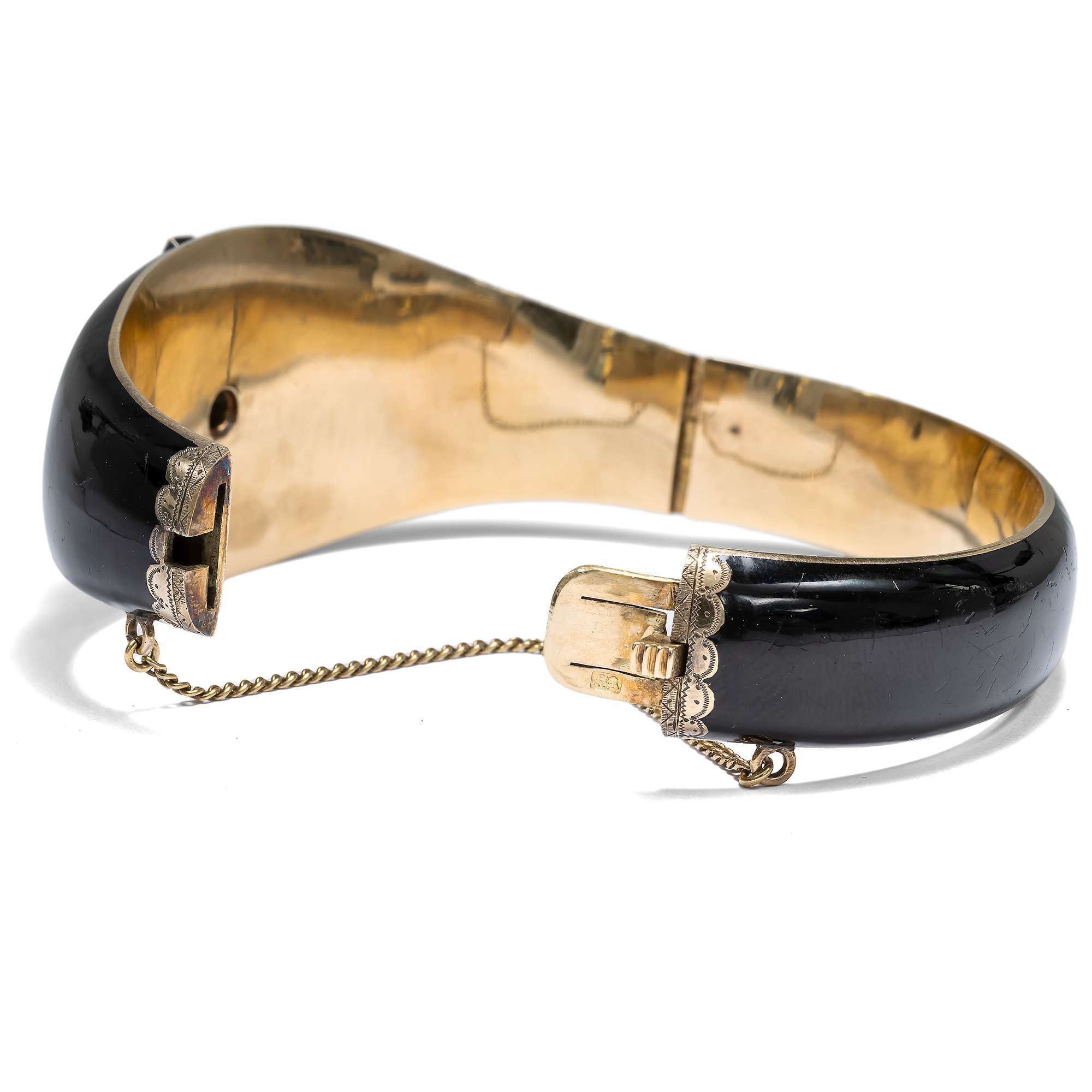 Dieser Armreif ist ein besonderes Stück: Denn nur selten haben ringsum emaillierte Schmuckstücke den Lauf der Zeiten so gut überdauert. Schauen Sie genau hin: Der breite, gewölbte Reif aus Gold ist beinahe vollständig mit schwarzem, glänzendem Emaille überzogen. Nur an den Gelenken und der Schließe ist Gold zu sehen, elegant graviert, sodass es wie Spitze wirkt.