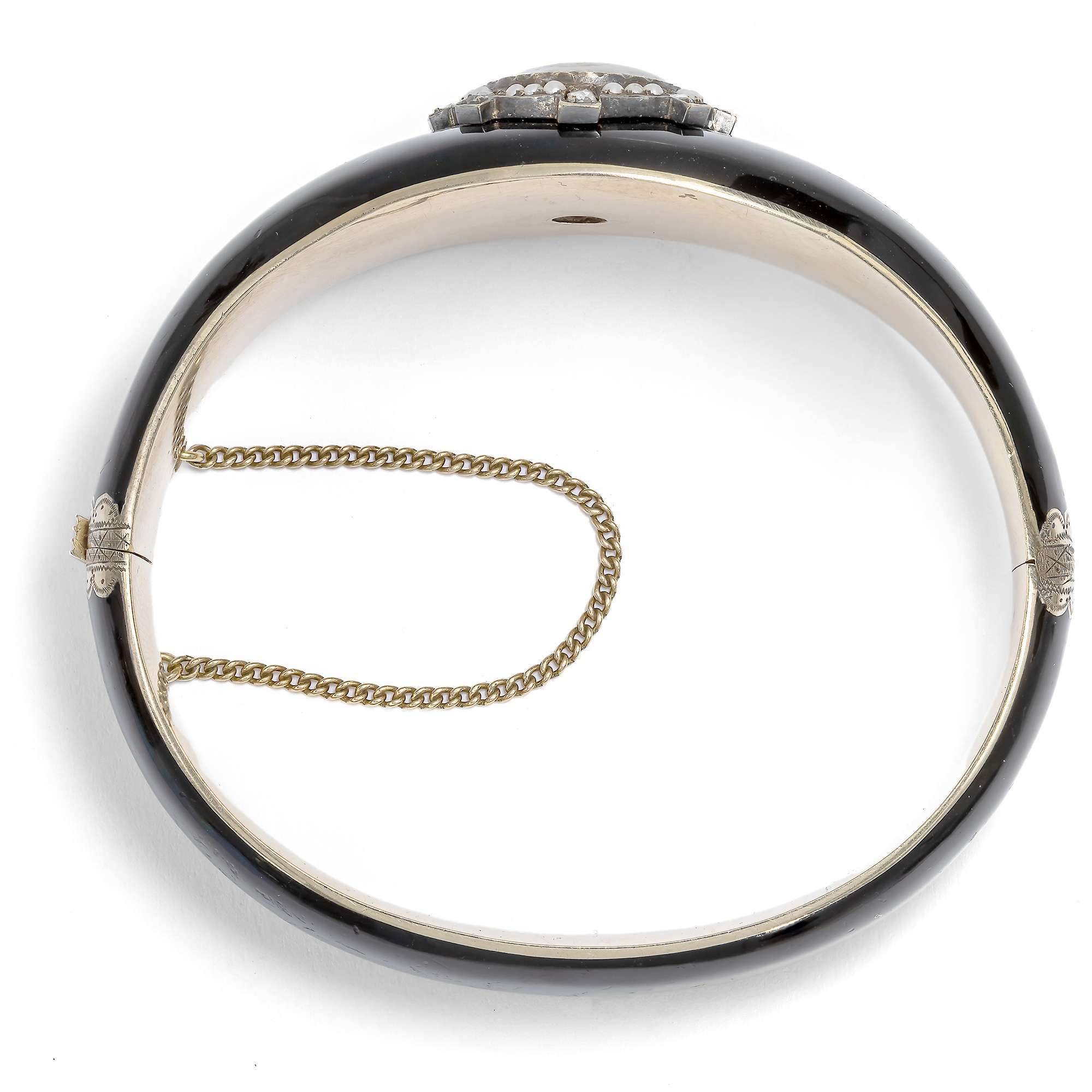 Seltener, schwarz emaillierter Armreif mit Emailmalerei, Perlen & Diamanten auf Gold, um 1865