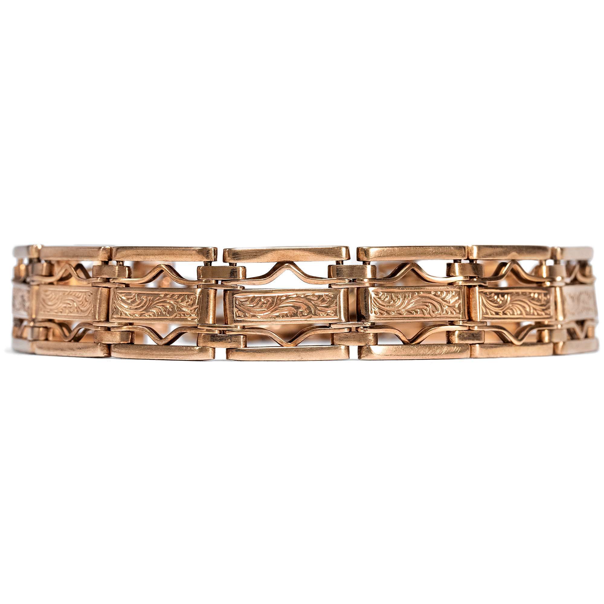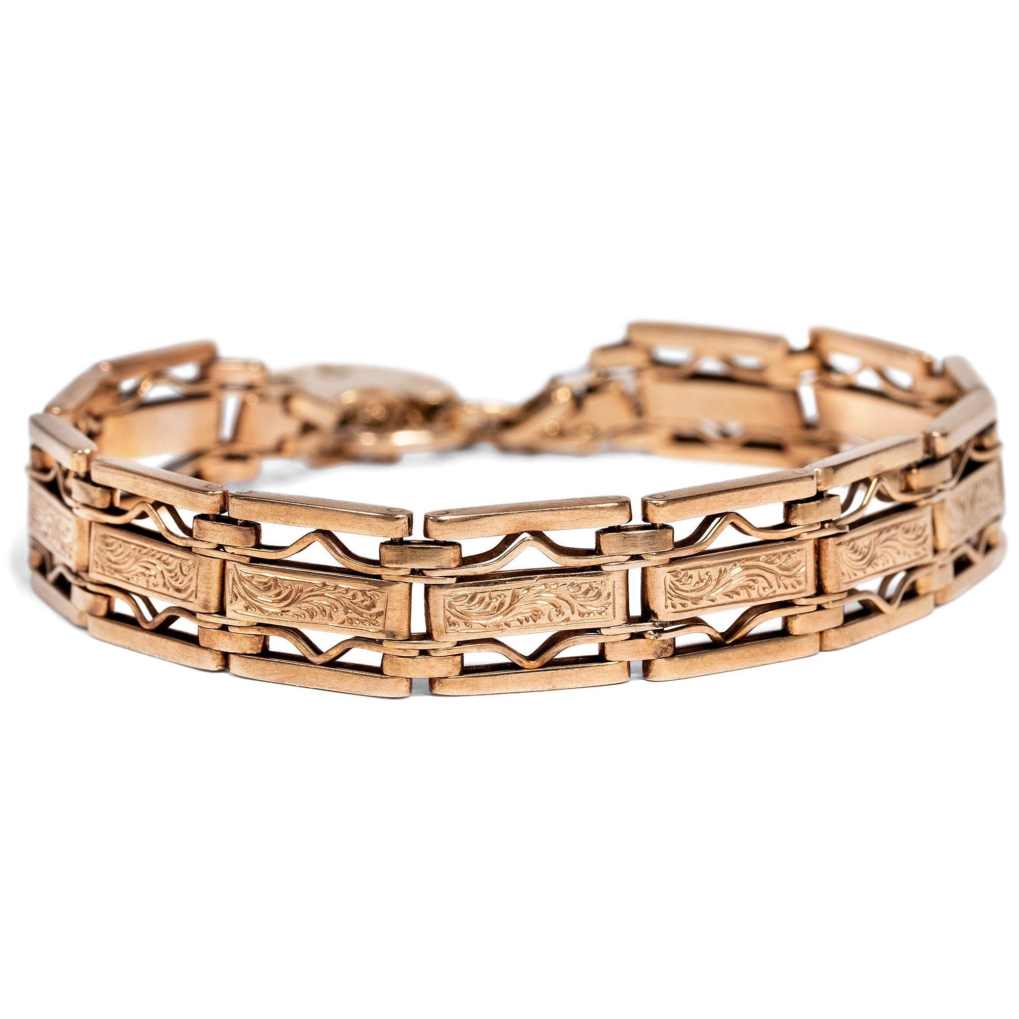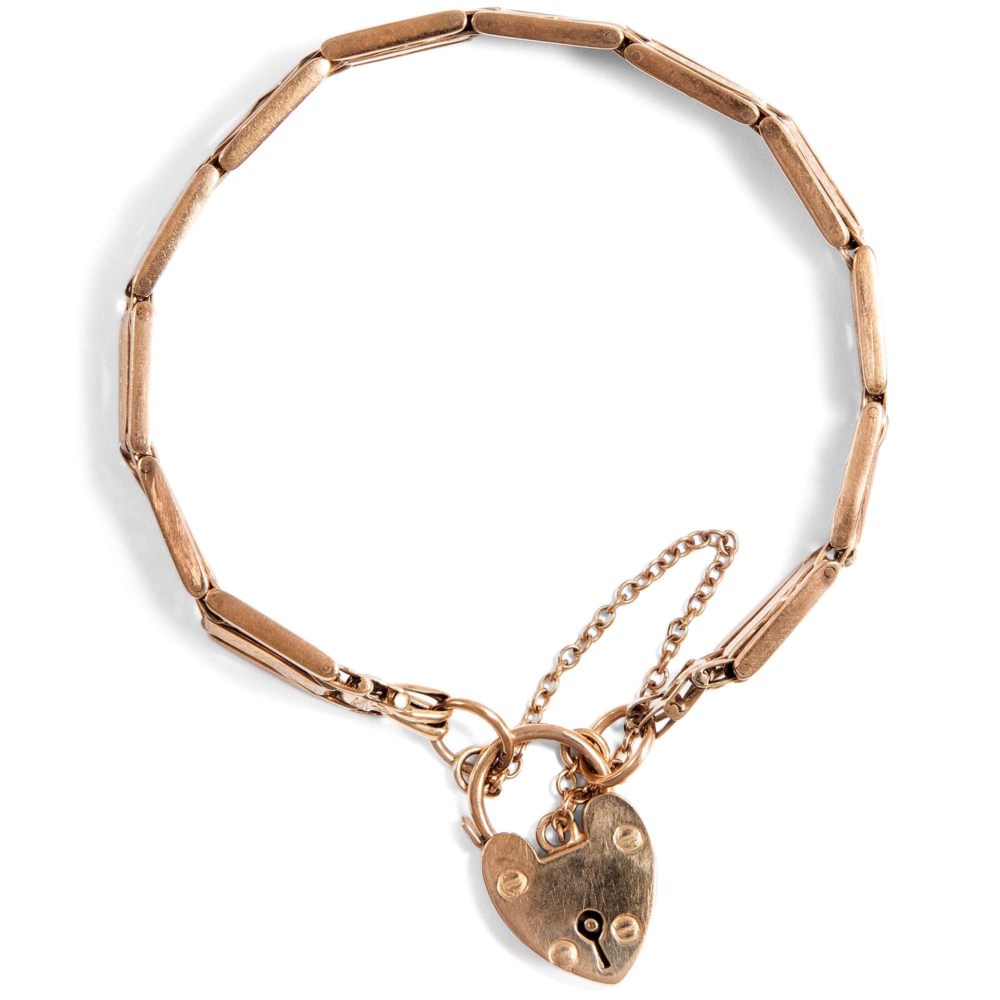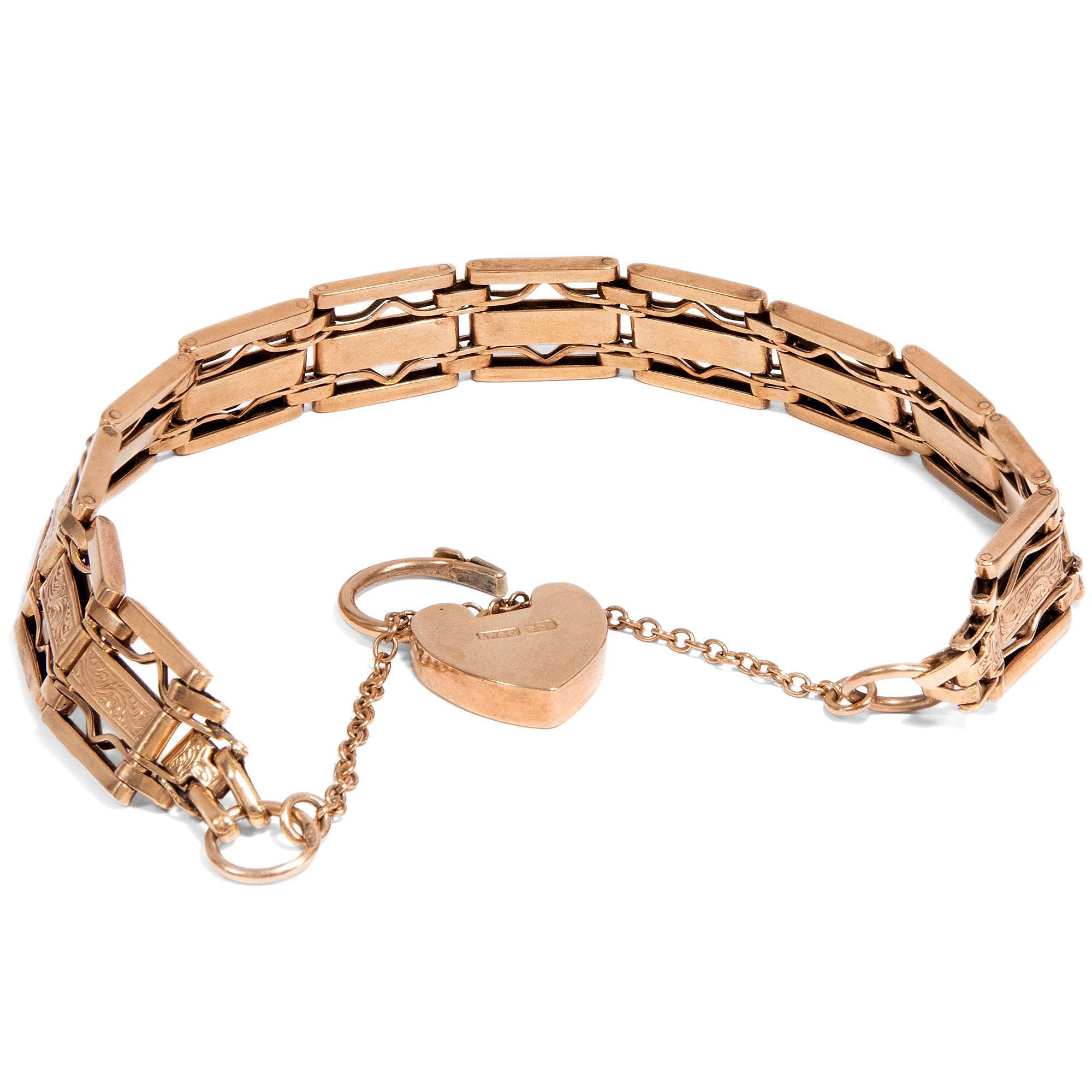 Besonders die im warmen Glanz des Rotgoldes leuchtenden Armbänder mit Herz sind bis heute beliebte Geschenke. Das hier vorliegende Gold-Armband zeigt sich als klassisches Steg-Armband oder „gate bracelet“, das aus beweglich montierten Stegen besteht.