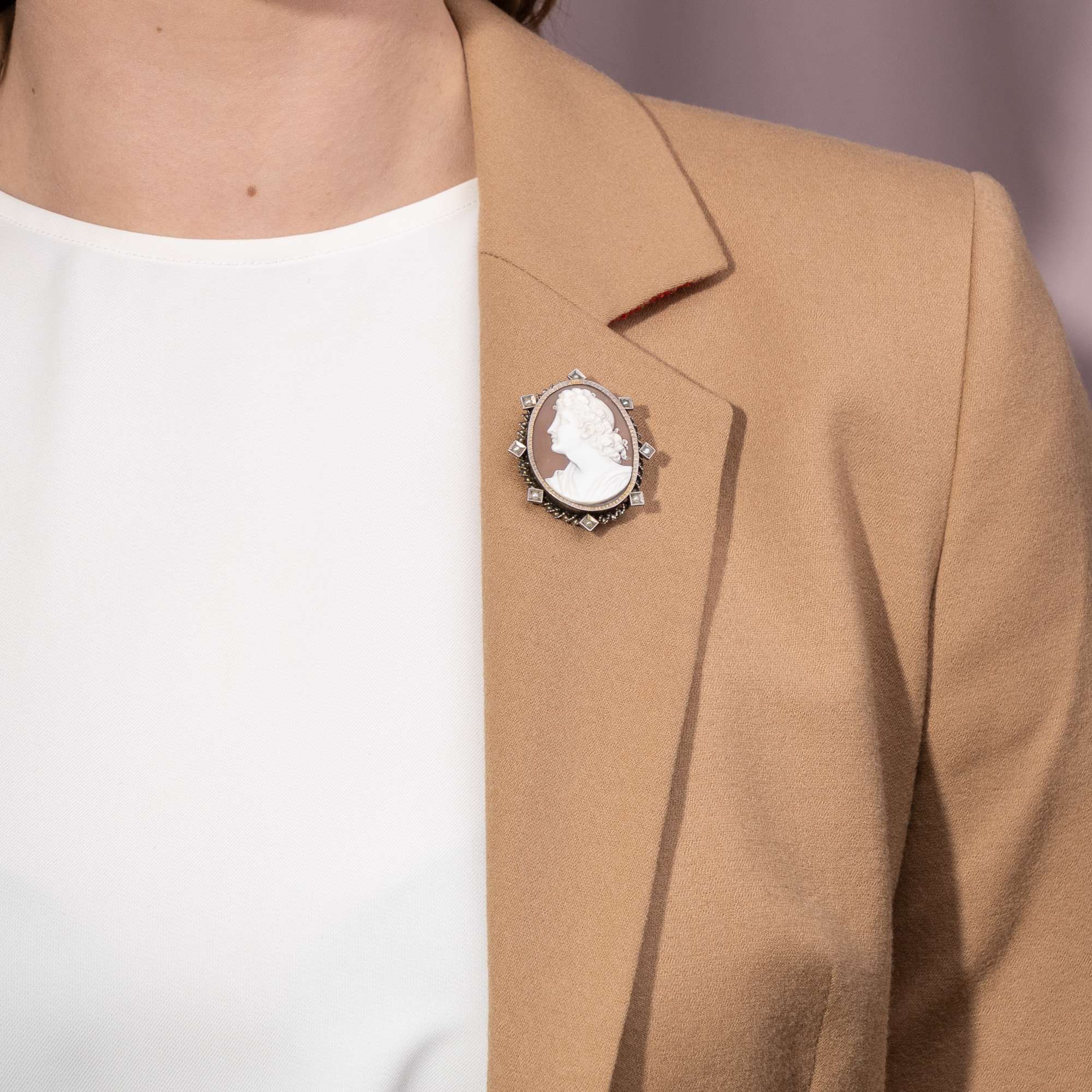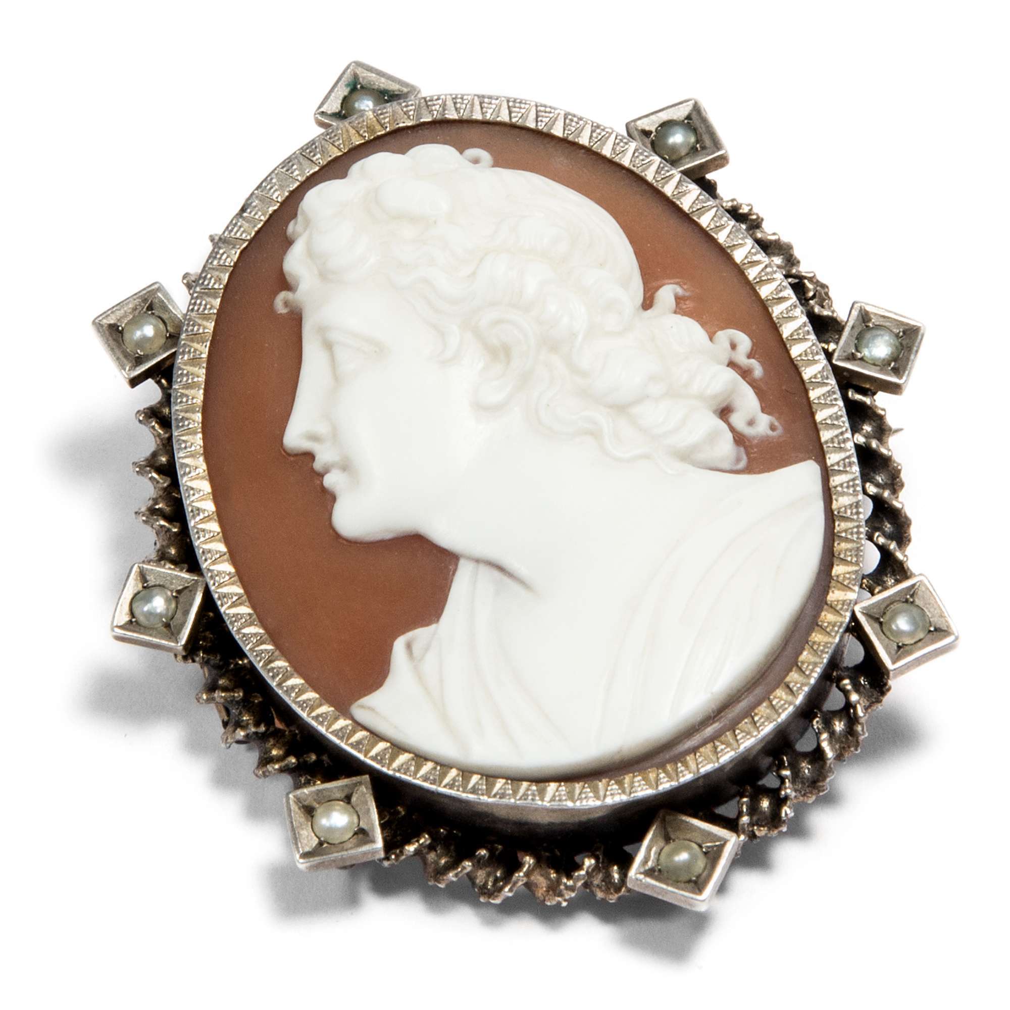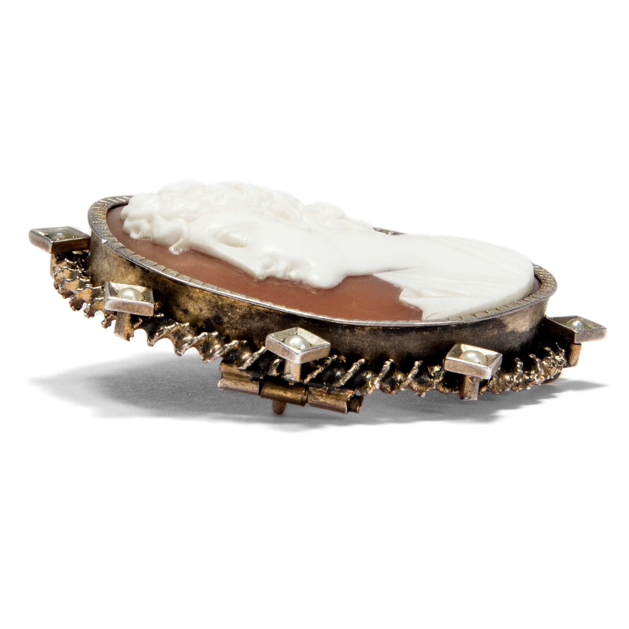 Die hier vorliegende, qualitätvolle Kamee wurde in den 1880er Jahren in der Region Neapel geschnitten. Sie wird von einer prachtvollen Fassung aus Silber im typischen, reichen Geschmack der Zeit gehalten und kann so als Brosche getragen werden.