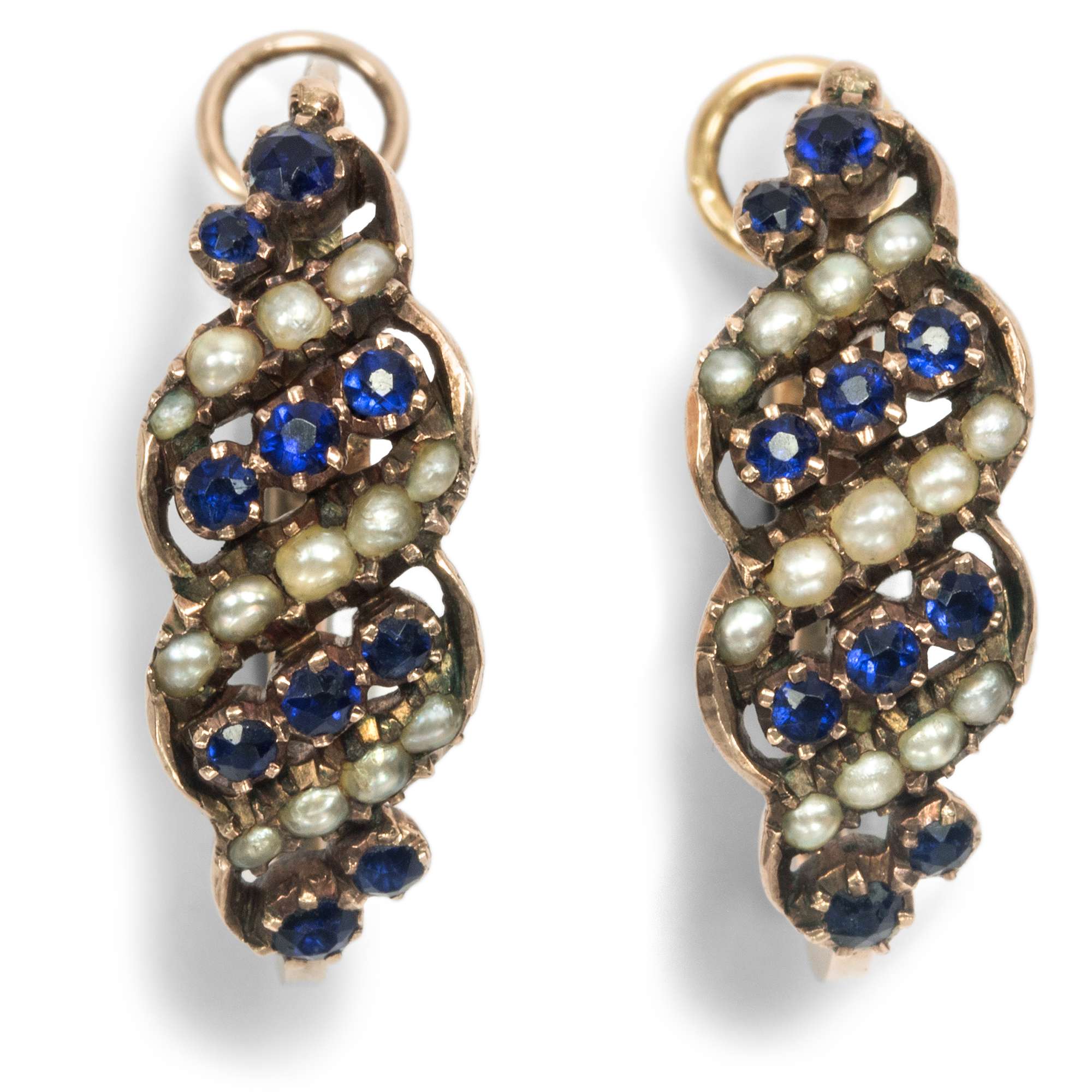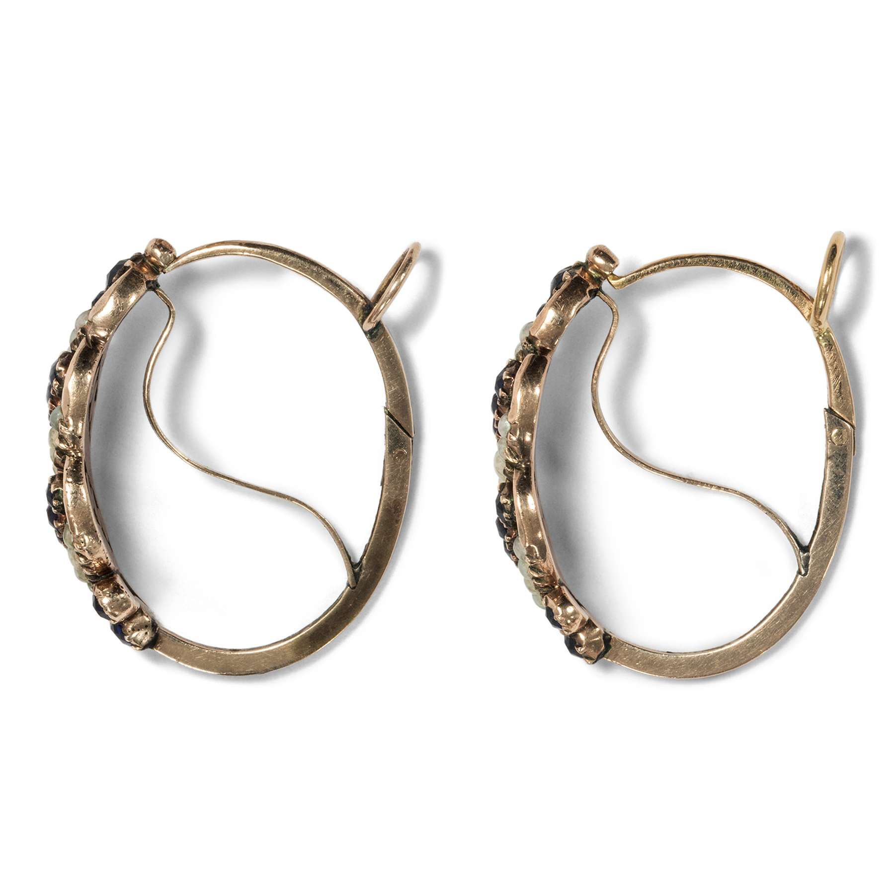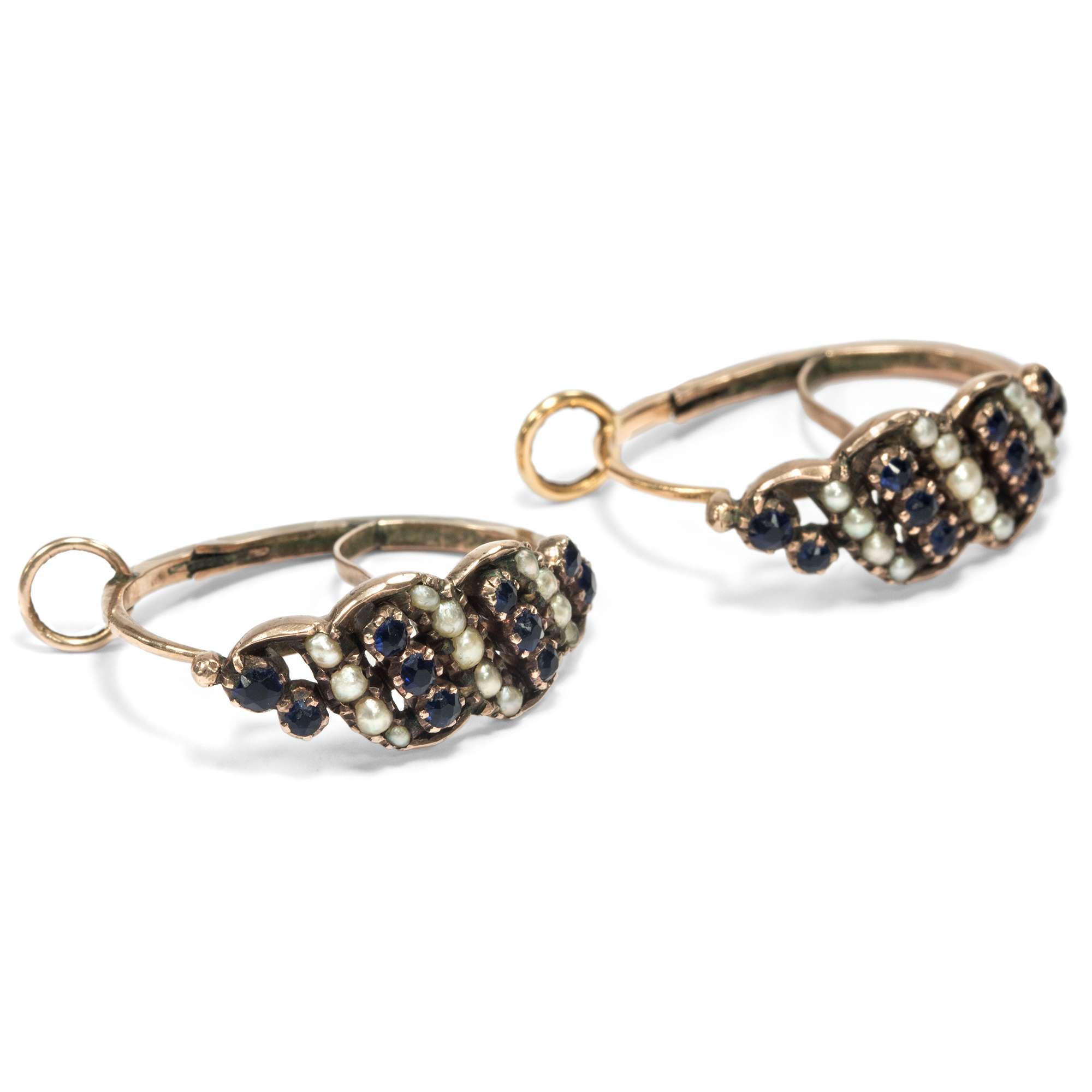 Die vorliegenden Ohrringe des Biedermeier zeigen sich in dieser klassischen Form. Der Ohrschmuck der Jahre um 1820 ist aus Roségold gefertigt. Die Vorderseite der Reife ist mit farbenfrohen Glaspasten in Königsblau sowie mit Naturperlen verziert, die in bewegten Reihen gestaffelt wurden.