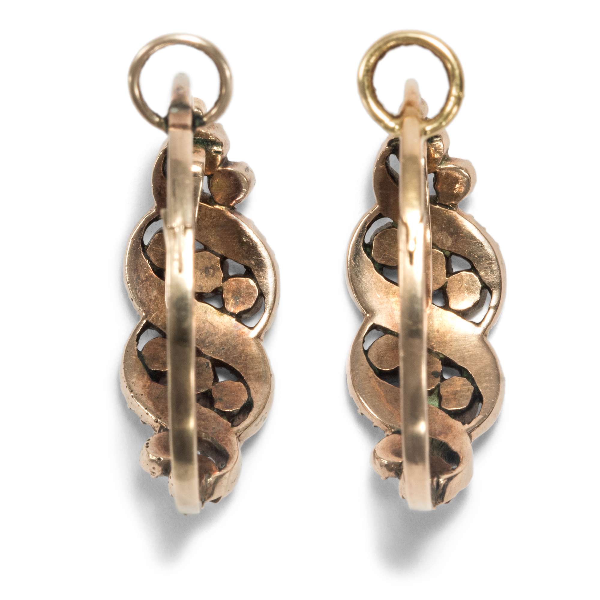 Die s-förmige Verbindung legt sich an das Ohrläppchen und hält so die verzierte Vorderseite in Position. Die Bügel lassen sich aufklappen, um die Ohrringe anzulegen; anschließend rasten sie sicher ein – sodass das Paar auch heute noch, rund 200 Jahre nach seiner Entstehung, sicher und mit Freude getragen werden kann.