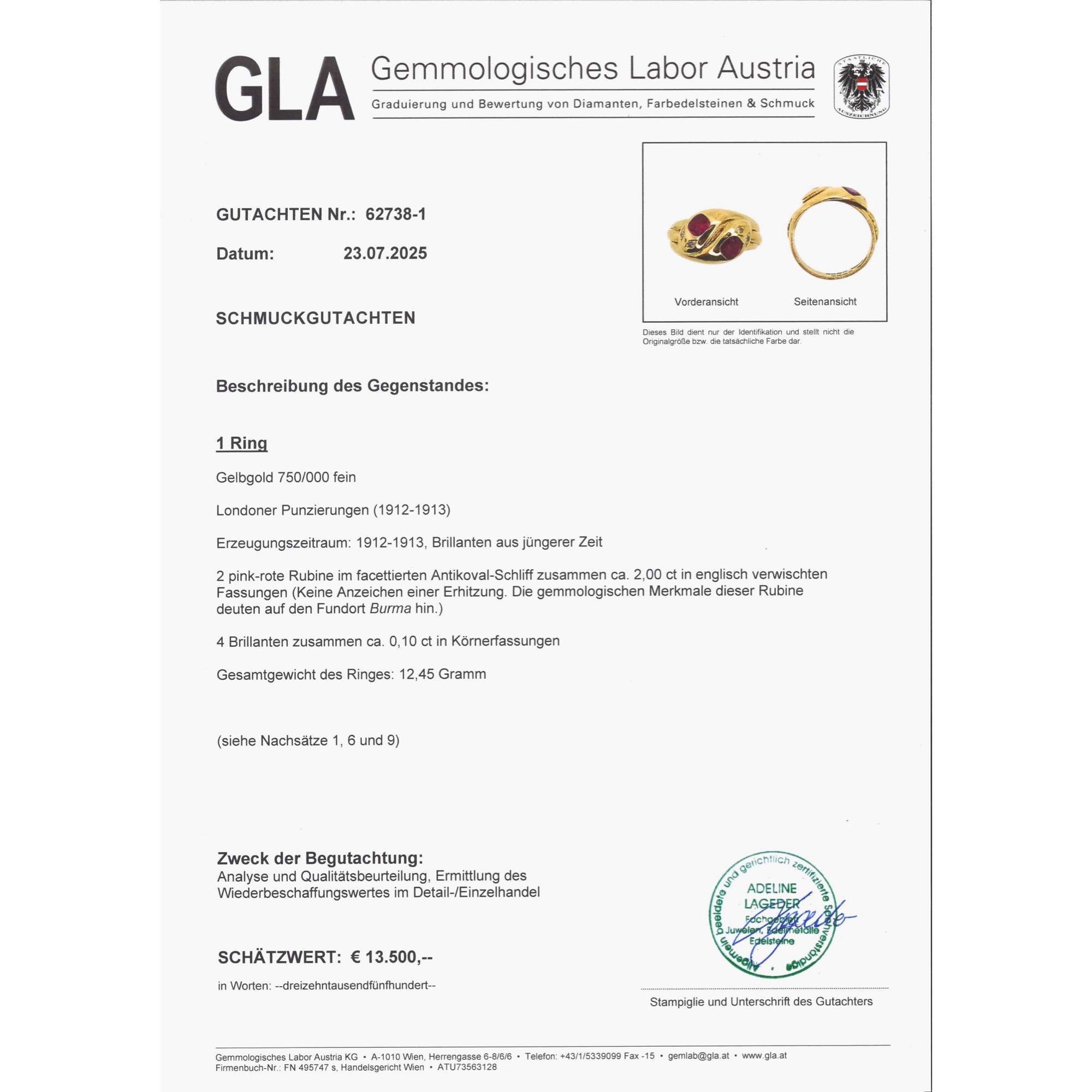 | Material: | Zwei natürliche, unbehandelte Rubine aus Burma (Mogok, no heat!), im Sternschliff, antikform, zus. ca. 2,00 ct, je etwa 5,2 x 5,5 mm Vier Diamanten im Brillantschliff, zus. ca. 0,10 ct, Feines Weiß (Top Wesselton, G) – Getöntes Weiß+ (Top Cape, K), si-pi Gold 750/000, entspricht 18 Karat |