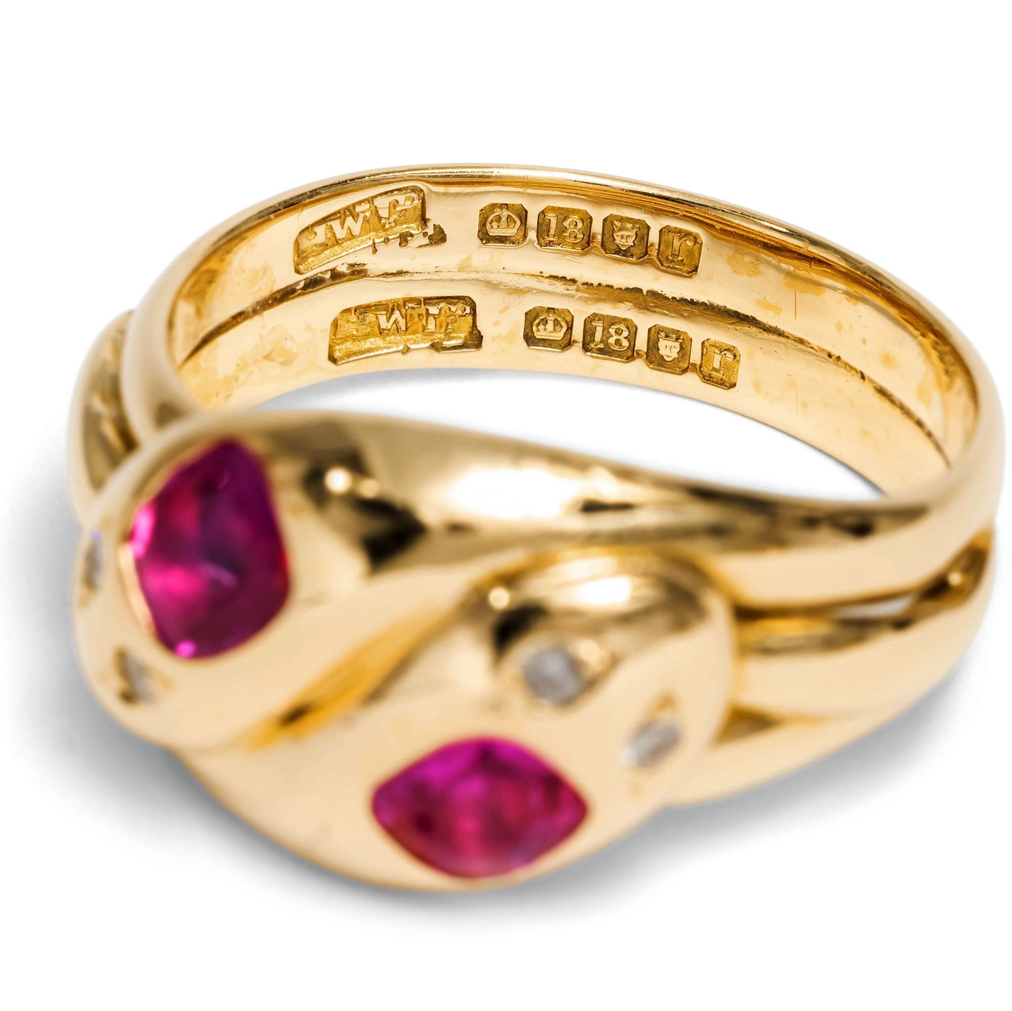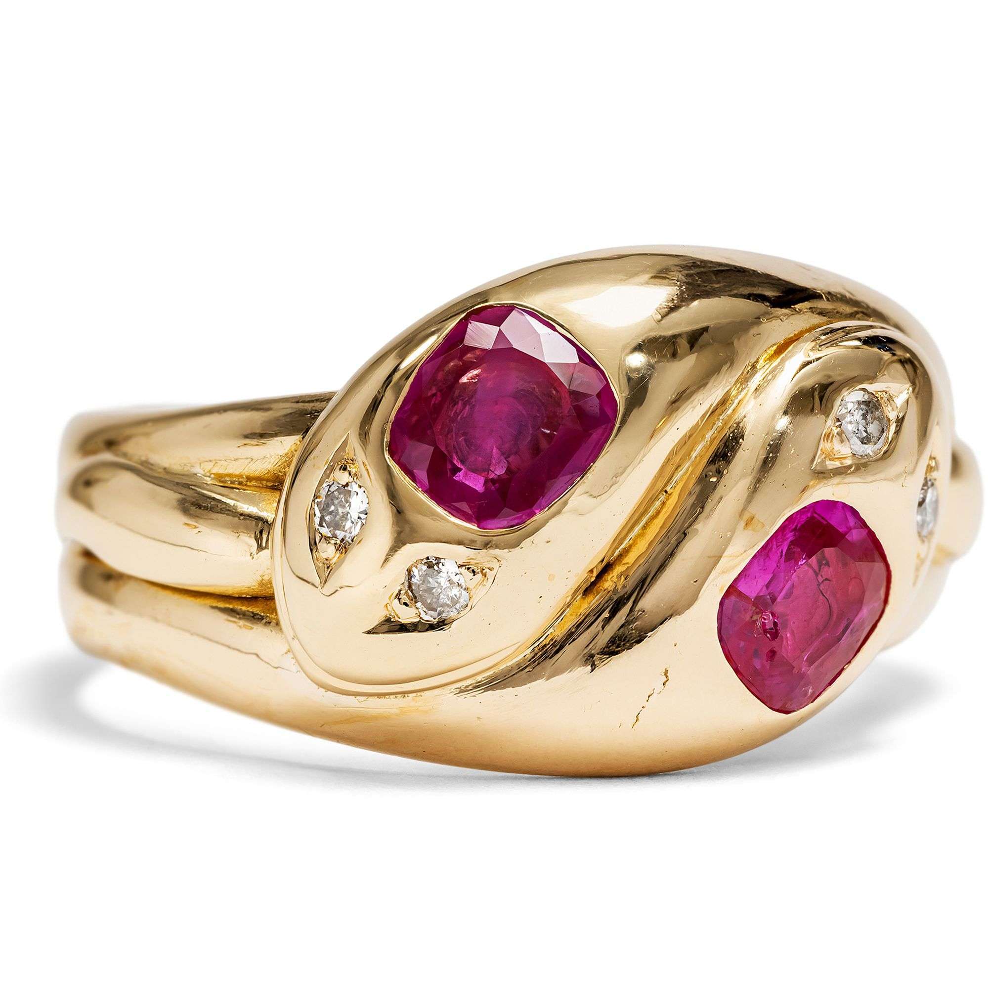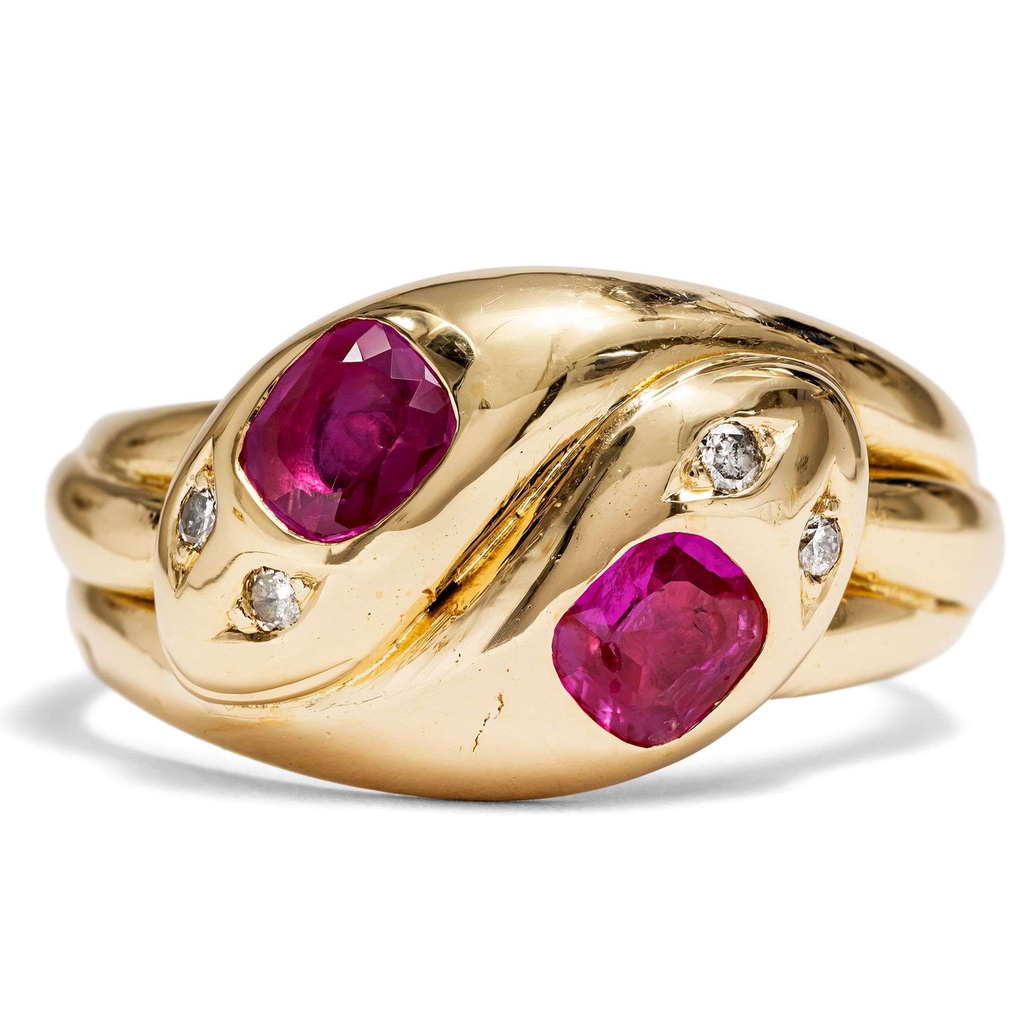 Dieser Ring zeigt in massiv verarbeitetem Gold die Körper zweier Schlangen, in enger Umwindung verschlungen. Die Köpfe der Tiere halten zwei kissenförmig geschliffene, unbehandelte Rubine aus Burma mit zusammen etwa zwei Karat Gewicht. Durch kleine Diamanen schauen die Schlangen neugierig in die Welt.