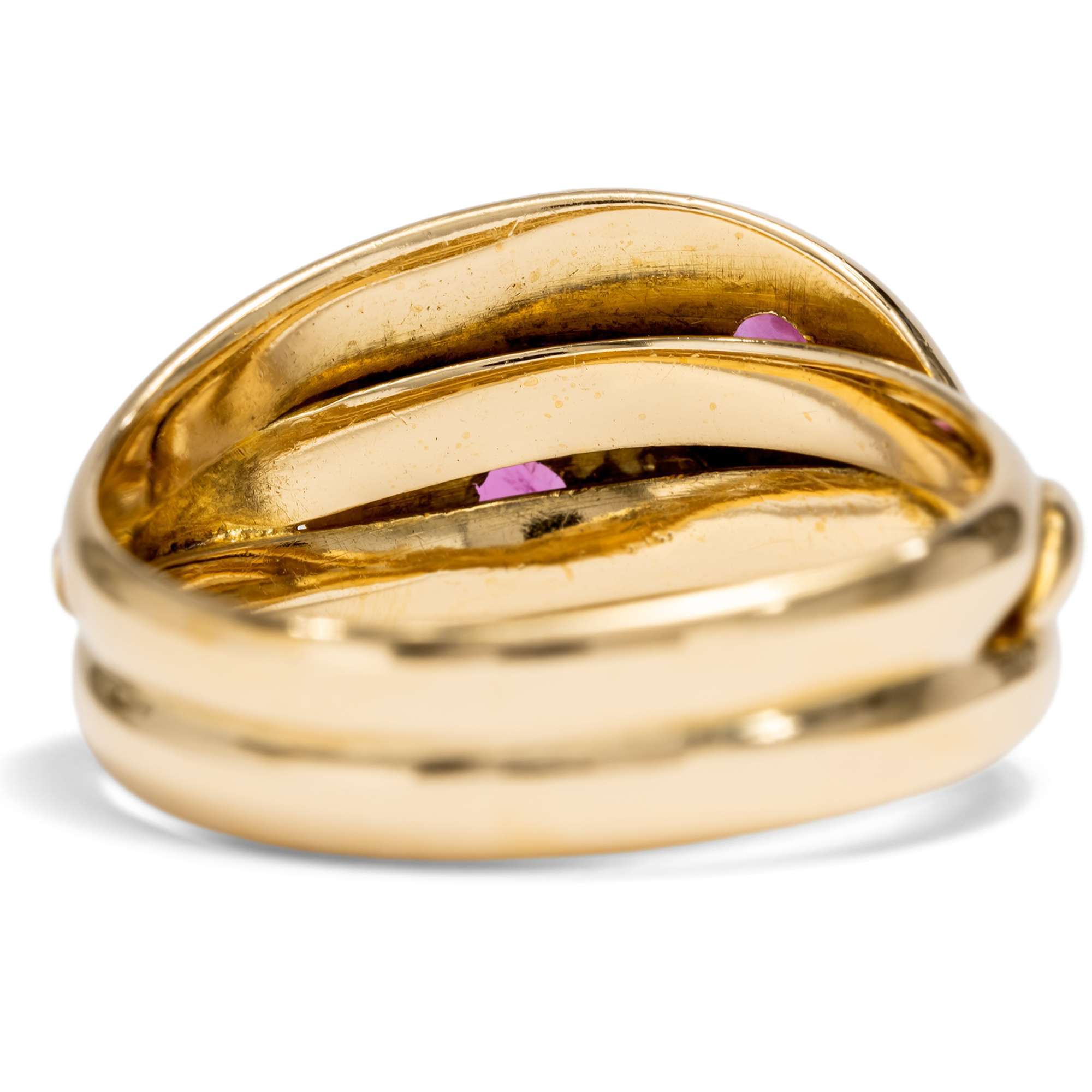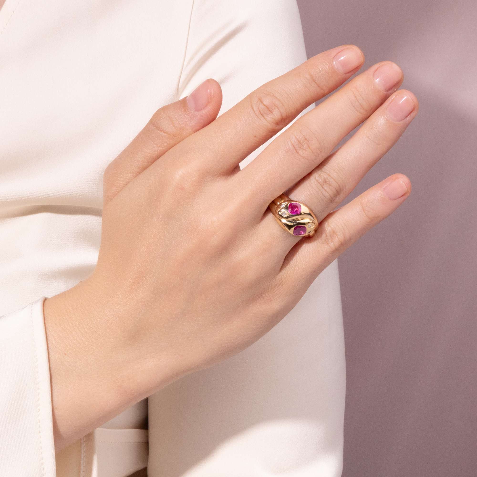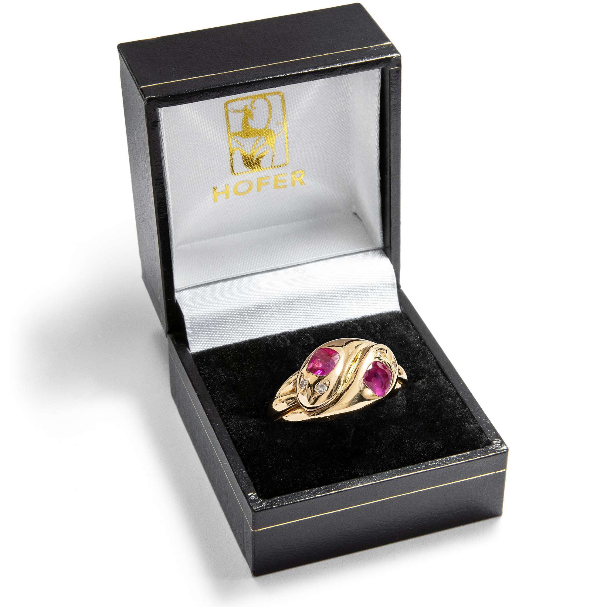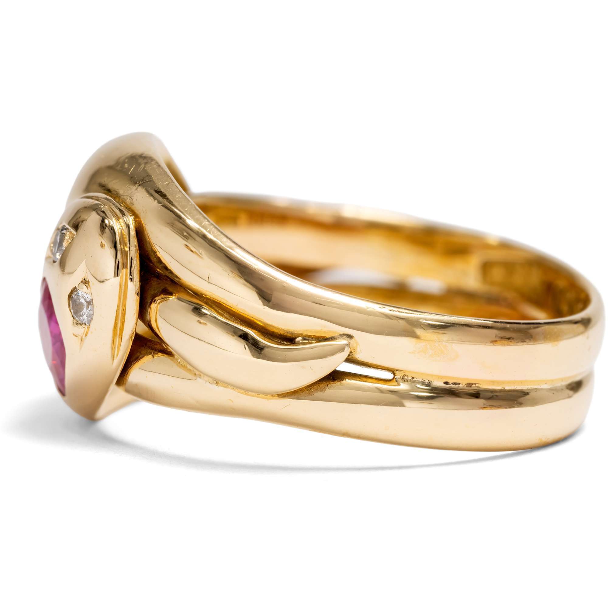Dieser Ring zeigt in massiv verarbeitetem Gold die Körper zweier Schlangen, in enger Umwindung verschlungen. Die Köpfe der Tiere halten zwei kissenförmig geschliffene, unbehandelte Rubine aus Burma mit zusammen etwa zwei Karat Gewicht. Durch kleine Diamanen schauen die Schlangen neugierig in die Welt.
