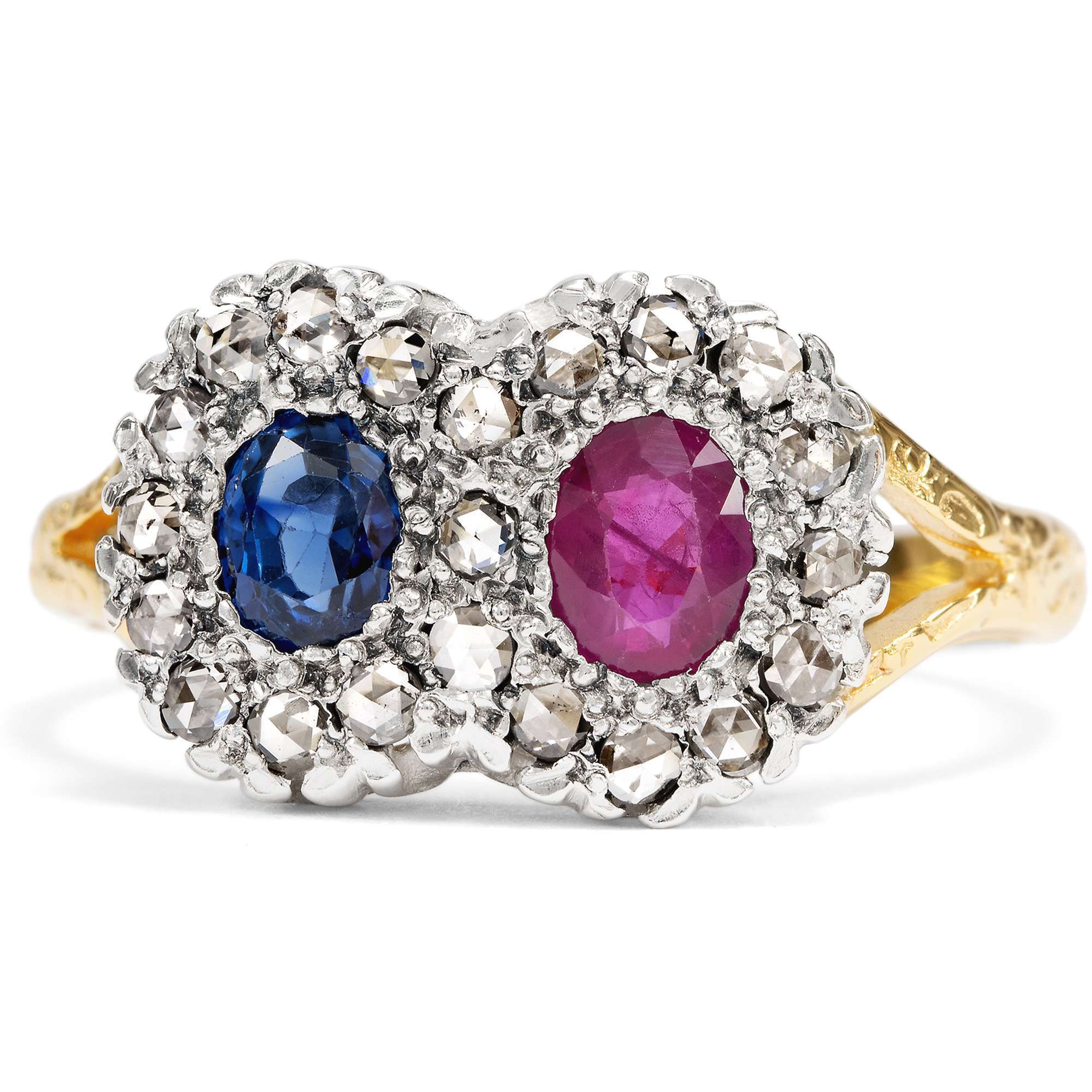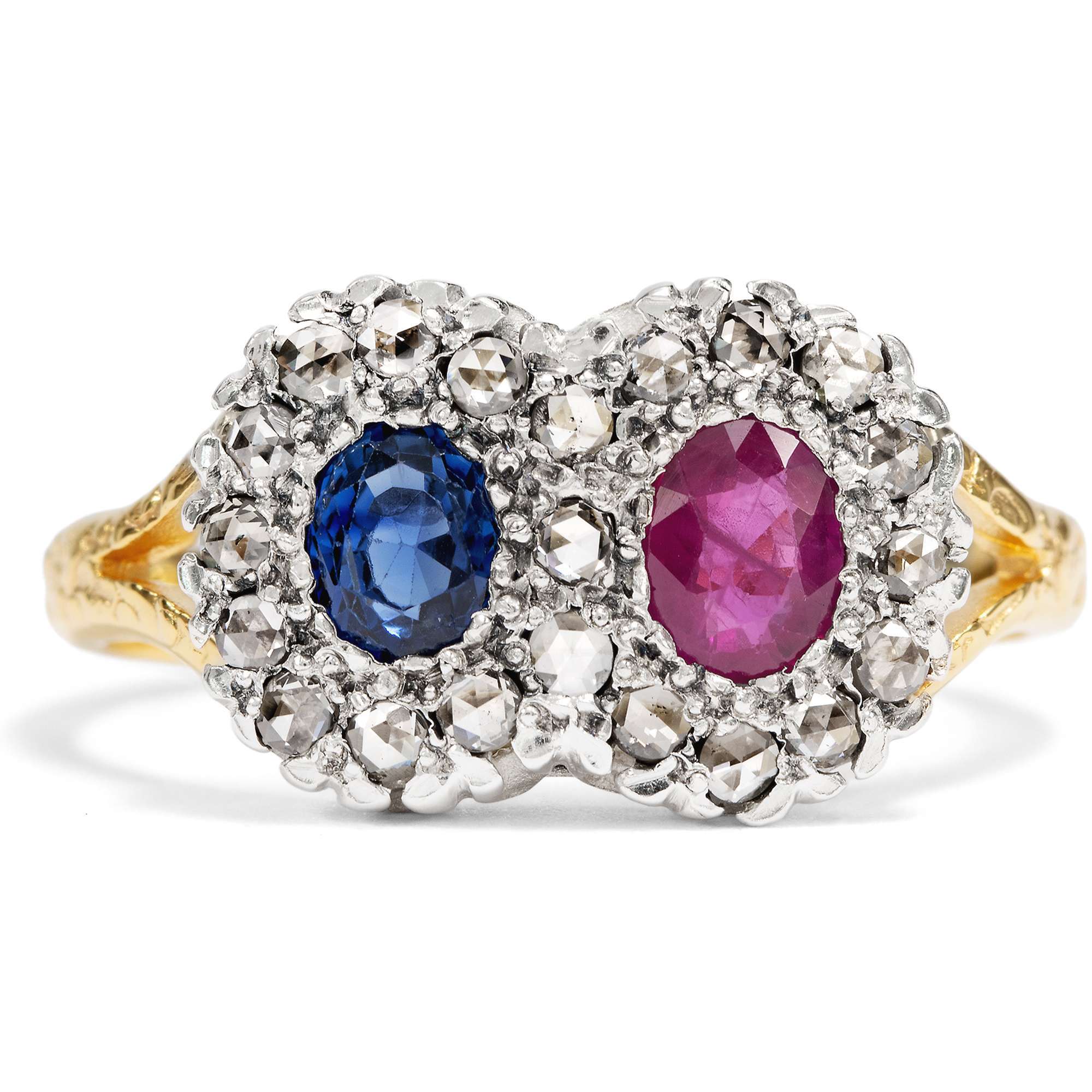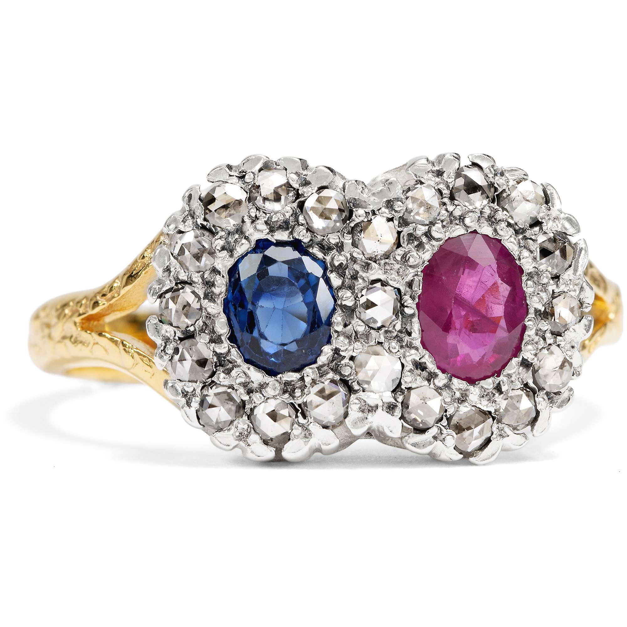 Entwürfe mit zwei gegenübergestellten Edelsteinen hatten um 1900 große Konjunktur. Man liebte das Spiel mit Symbolen. In der Vorstellung der Zeit stehen sich in den beiden kostbaren Edelsteinen zwei Liebende gegenüber. Beide sind als eigenständige Elemente erkennbar, jedoch fest verbunden durch ihr Gefühl und symbolhaft vereint in einem Schmuckstück. In diesem Ring sind ein natürlicher Rubin und ein mittelblauer Saphir zwischen insgesamt 21 Diamanten im Rosenschliff eingefasst. Bei genauem Hinsehen erkennt man, dass die Diamanten eine liegende Acht bilden, also das Symbol der Unendlichkeit.