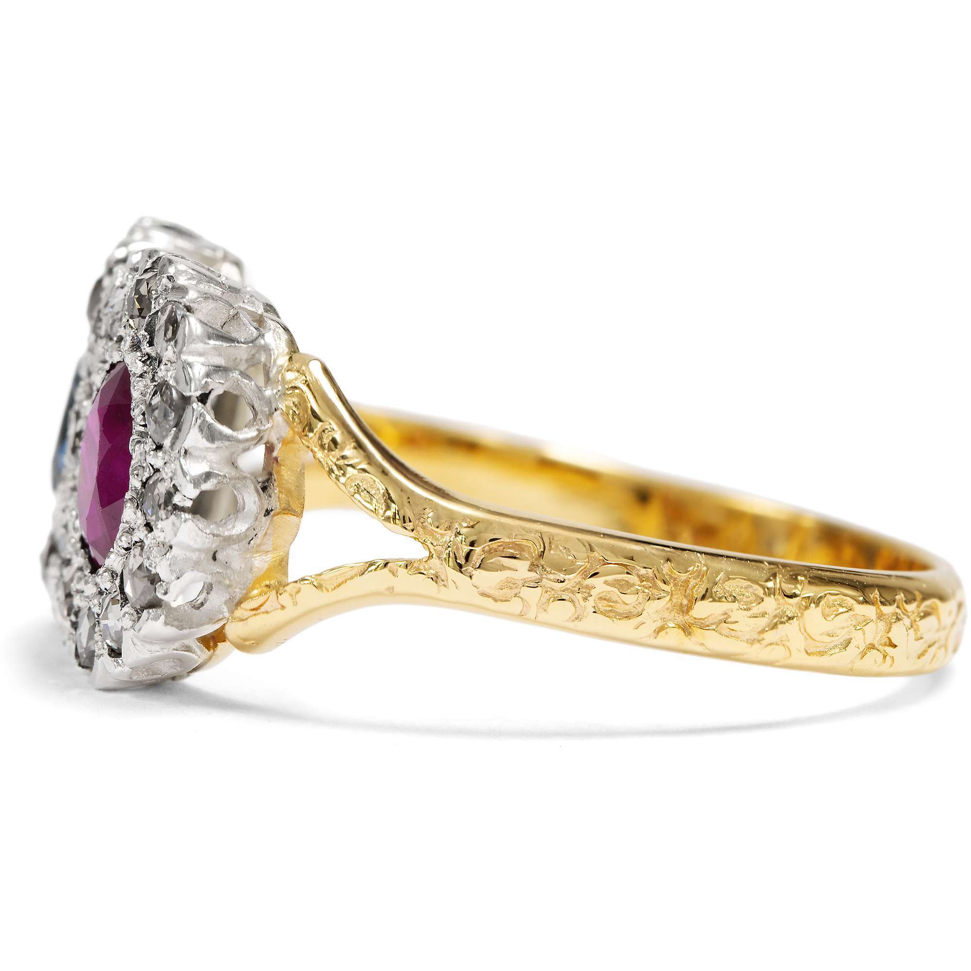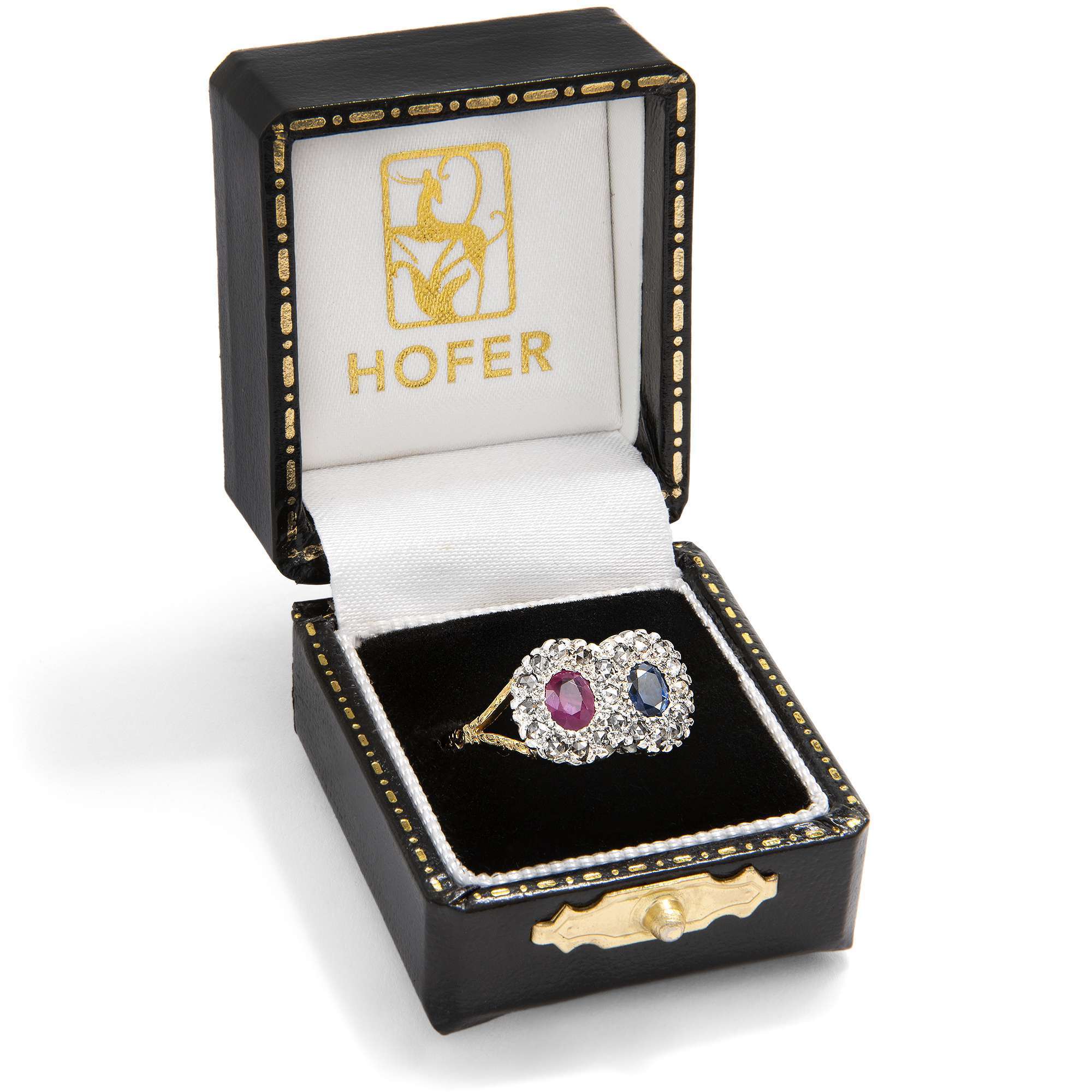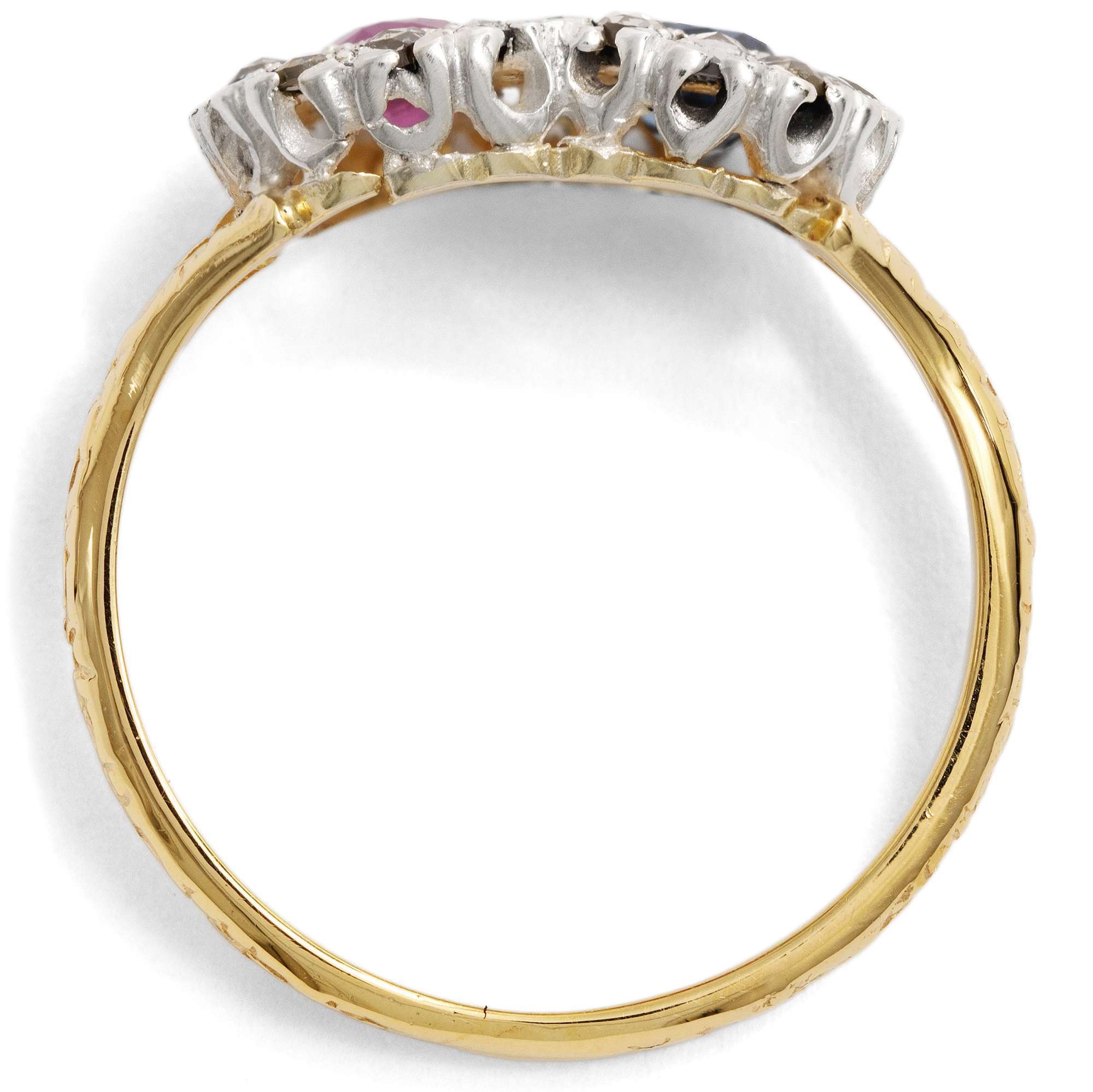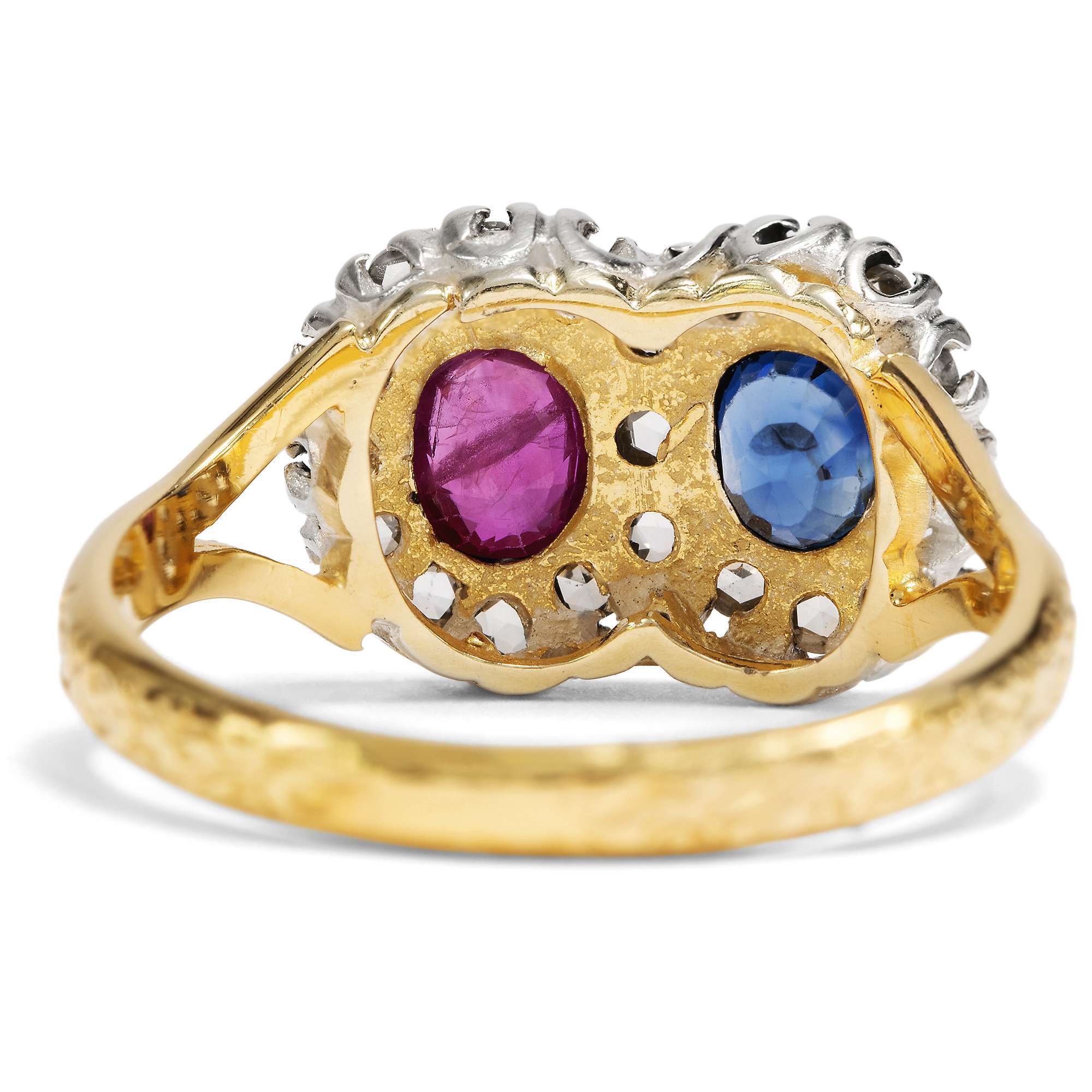Entwürfe mit zwei gegenübergestellten Edelsteinen hatten um 1900 große Konjunktur. Man liebte das Spiel mit Symbolen. In der Vorstellung der Zeit stehen sich in den beiden kostbaren Edelsteinen zwei Liebende gegenüber. Beide sind als eigenständige Elemente erkennbar, jedoch fest verbunden durch ihr Gefühl und symbolhaft vereint in einem Schmuckstück. In diesem Ring sind ein natürlicher Rubin und ein mittelblauer Saphir zwischen insgesamt 21 Diamanten im Rosenschliff eingefasst. Bei genauem Hinsehen erkennt man, dass die Diamanten eine liegende Acht bilden, also das Symbol der Unendlichkeit.