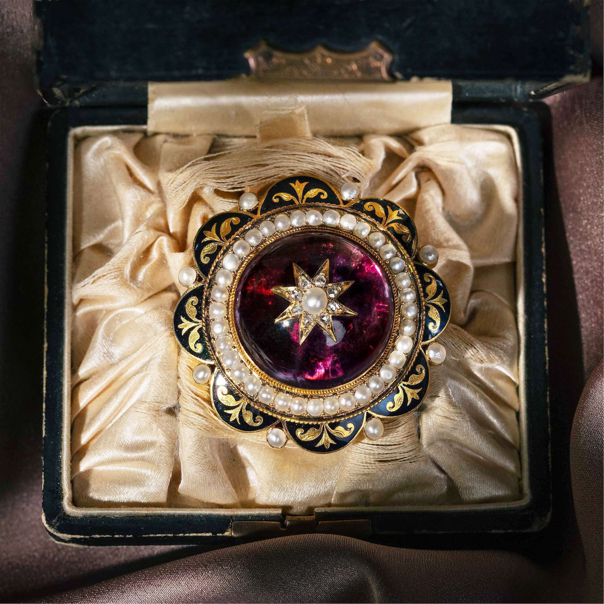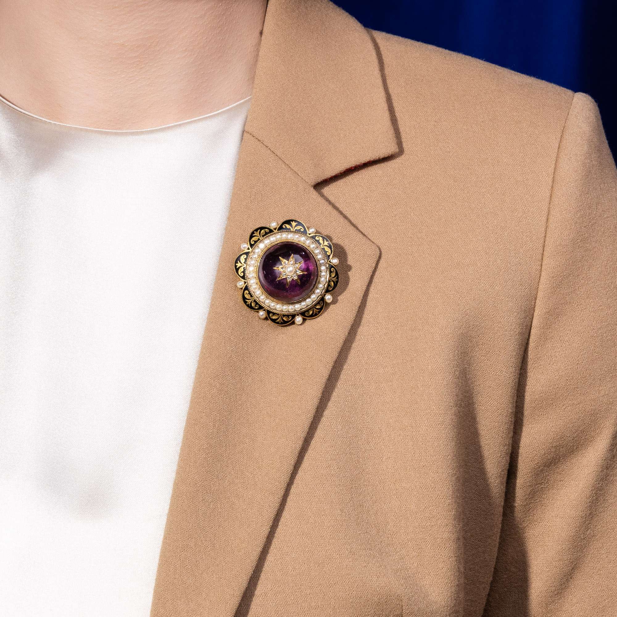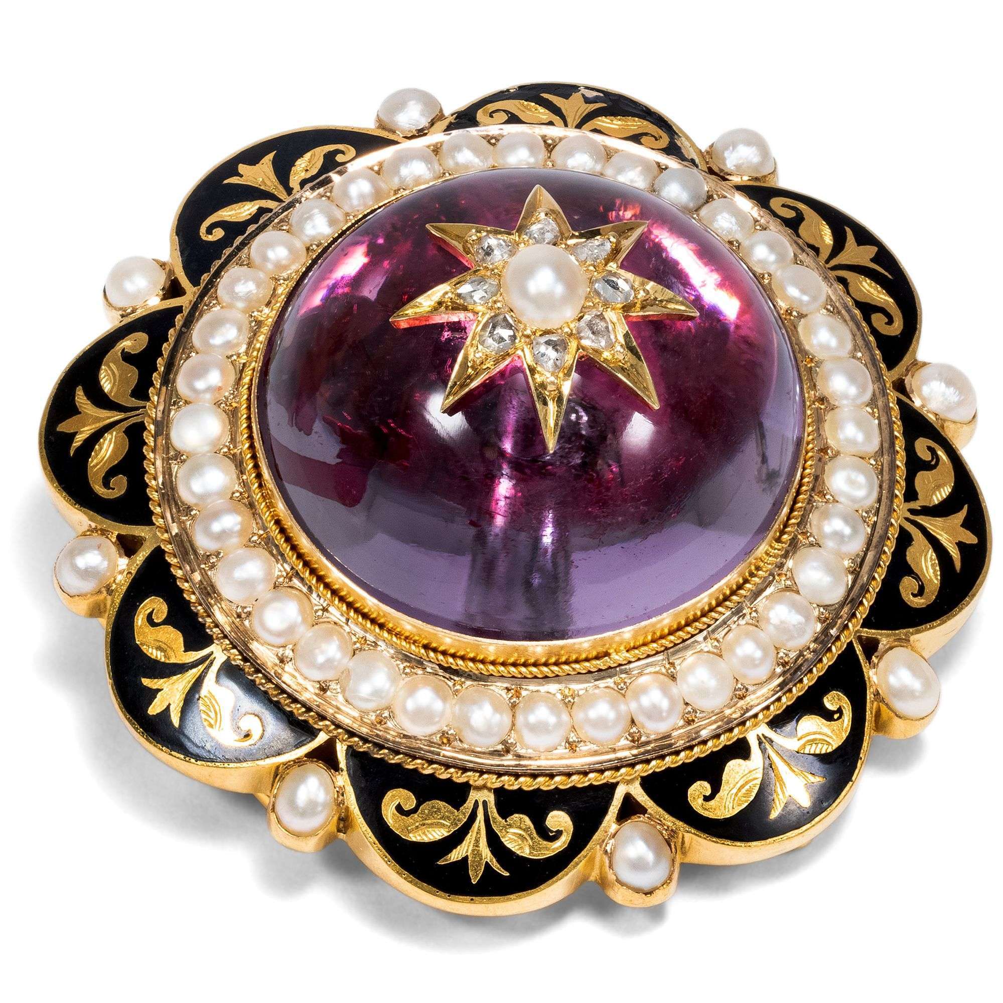 Wie prachtvoll ein solch ornamentales Schmuckstück der viktorianischen Zeit wirken kann, führt uns die vorliegende Brosche vor Augen. Ihr Herzstück ist ein großer Amethyst im Cabochonschliff, der über einer Folie gefasst wurde und so einen wunderbar tiefen, mystischen Glanz mit schimmernden Lichteffekten erhält. Obenauf ist ein Sternmotiv aus Diamantrosen und einer Naturperle eingelassen. Ringsum entfaltet sich ein Rahmen aus weiteren natürlichen Perlen und Gold; gravierte florale Ornamente sind hier als Aussparungen des schwarz emaillierten Rahmens eingelassen.
