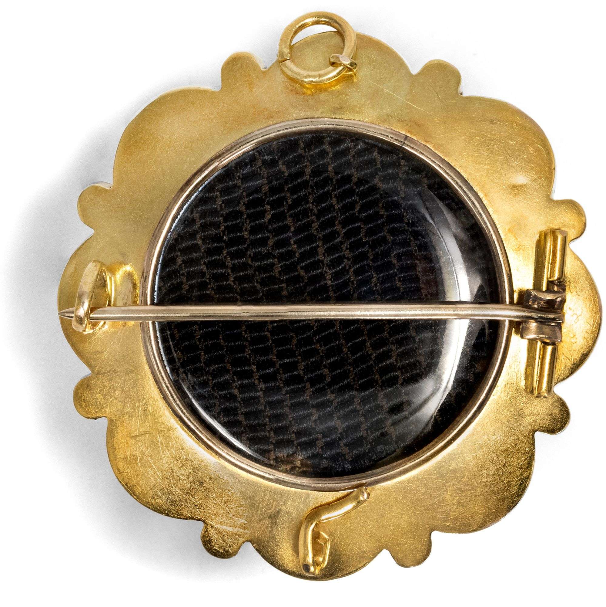 Dass die damalige Liebe zur geradezu opulenten Schönheit gar nicht oberflächlich war, dies zeigt uns die Rückseite. Hier ist ein verglastes Medaillonfach eingelassen, das sich öffnen lässt, um ein persönliches Andenken bei sich zu tragen; etwa eine Haarlocke oder ein Foto. Rückseitig befinden sich außerdem ein Haken zum Einfädeln eines Bandes oder einer schmalen Kette, sodass das Stück auch als Anhänger getragen werden kann. Eine weitere Schlaufe wurde ursprünglich für ein separates Sicherungskettchen konzipiert, doch lässt sie sich auch als Aufnahme für eine zarte Halskette verwenden.