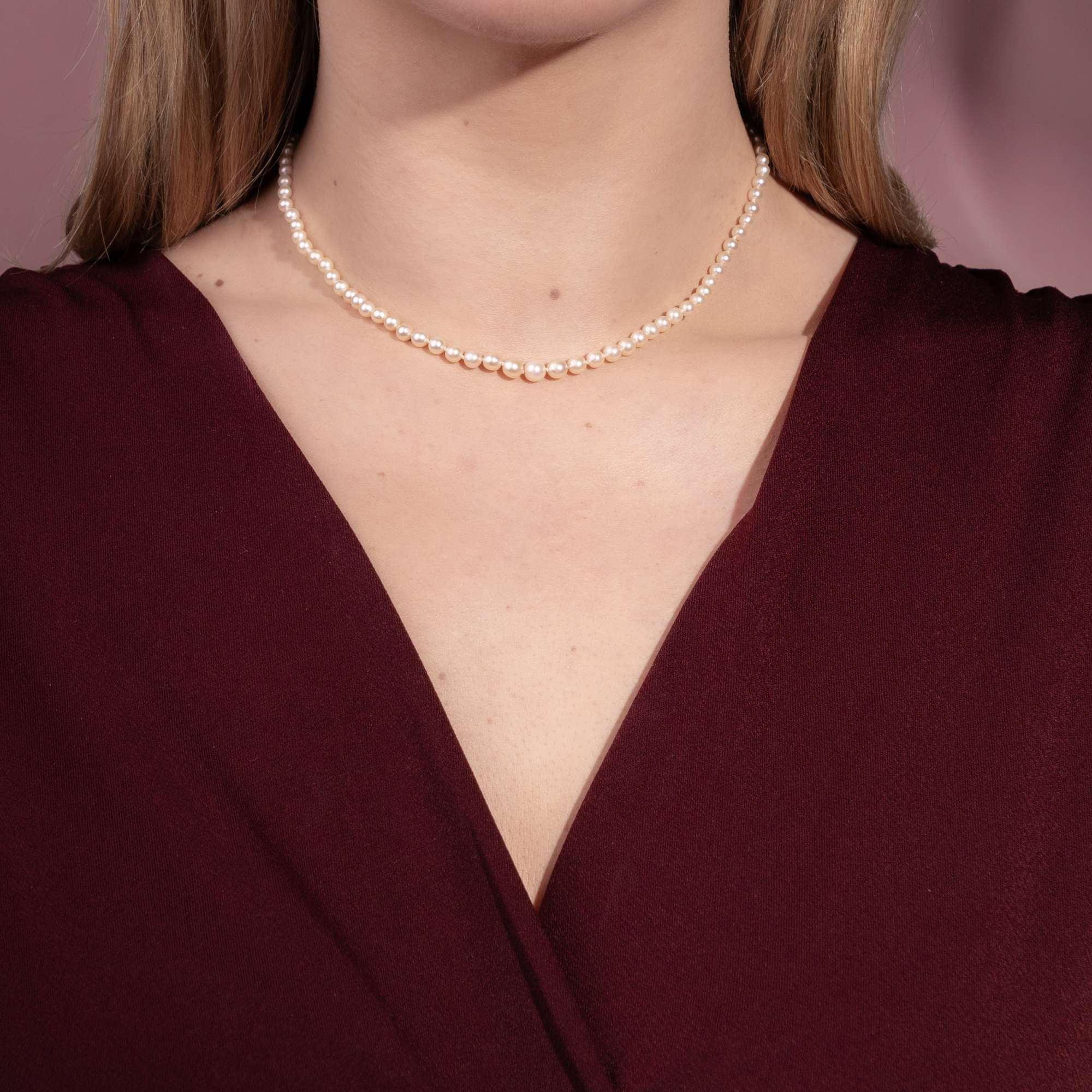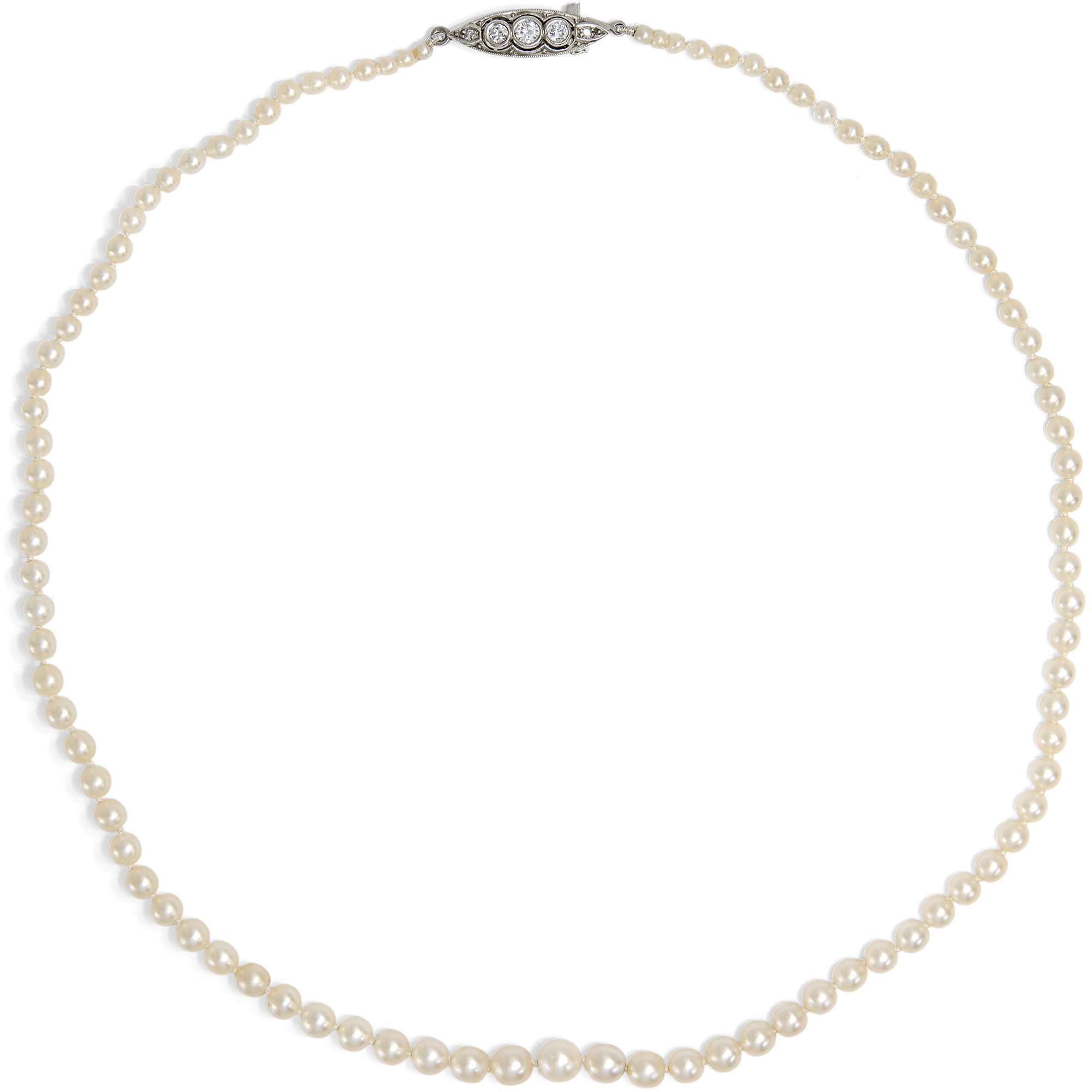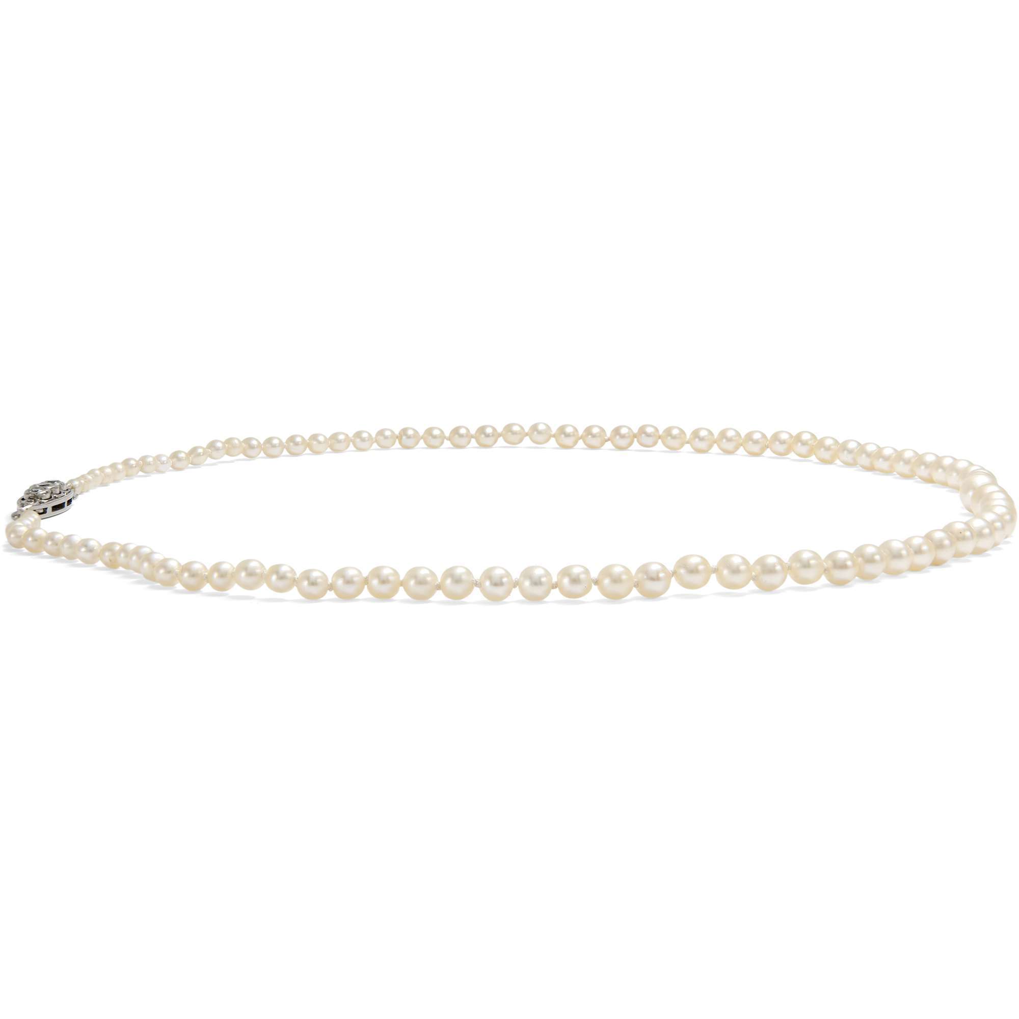 Das hier vorliegende Collier besteht aus echten Naturperlen. Die über 170 Orientperlen sind wunderbar „gematcht“, d. h., sie passen in Farbe und Größe perfekt zueinander. Die Perlen sind im Verlauf gereiht und perfekt rund bis leicht gelängt. Ihre Farbe ist ein einheitliches Cremeweiß mit rosa Überfang, und ihr Lüster ist gut bis sehr gut. Die Oberfläche zeigt nur sehr sehr wenige Wachstumsmerkmale. Mit einer Länge von 40,5 cm liegt das Collier halsnah an und kann so auch tagsüber z.B. zu einem weichen Kaschmirpullover getragen werden.