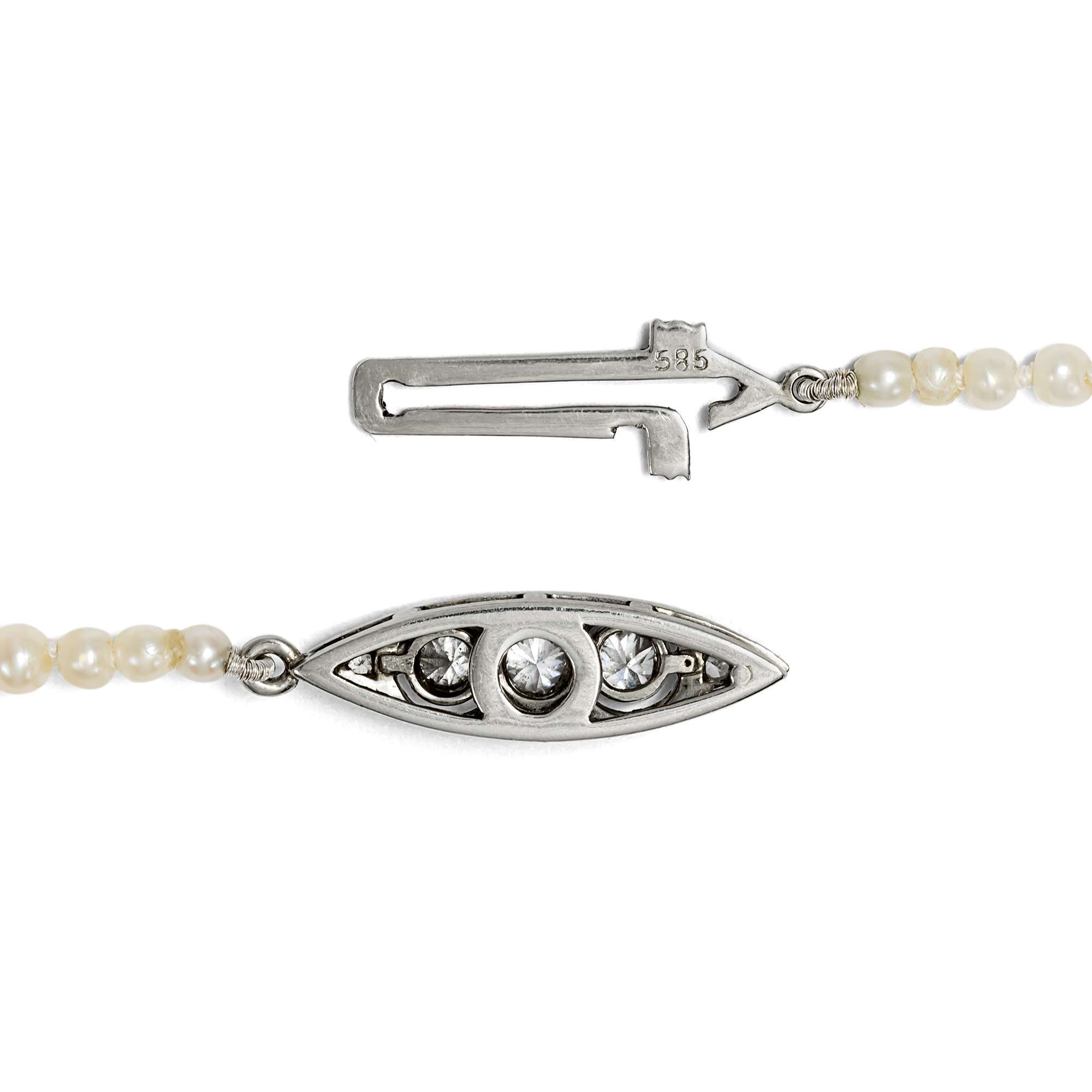 Die Schließe ist mit Diamanten im modernen Brillantschliff besetzt und aus Weißgold gefertigt; ihre Form ist zugleich noch am Art Déco der Vorkriegszeit orientiert. Wir denken daher, dass das Collier in den 1950er Jahren entstanden ist. Der Stempel der Schließe weist auf eine Entstehung in Deutschland hin..