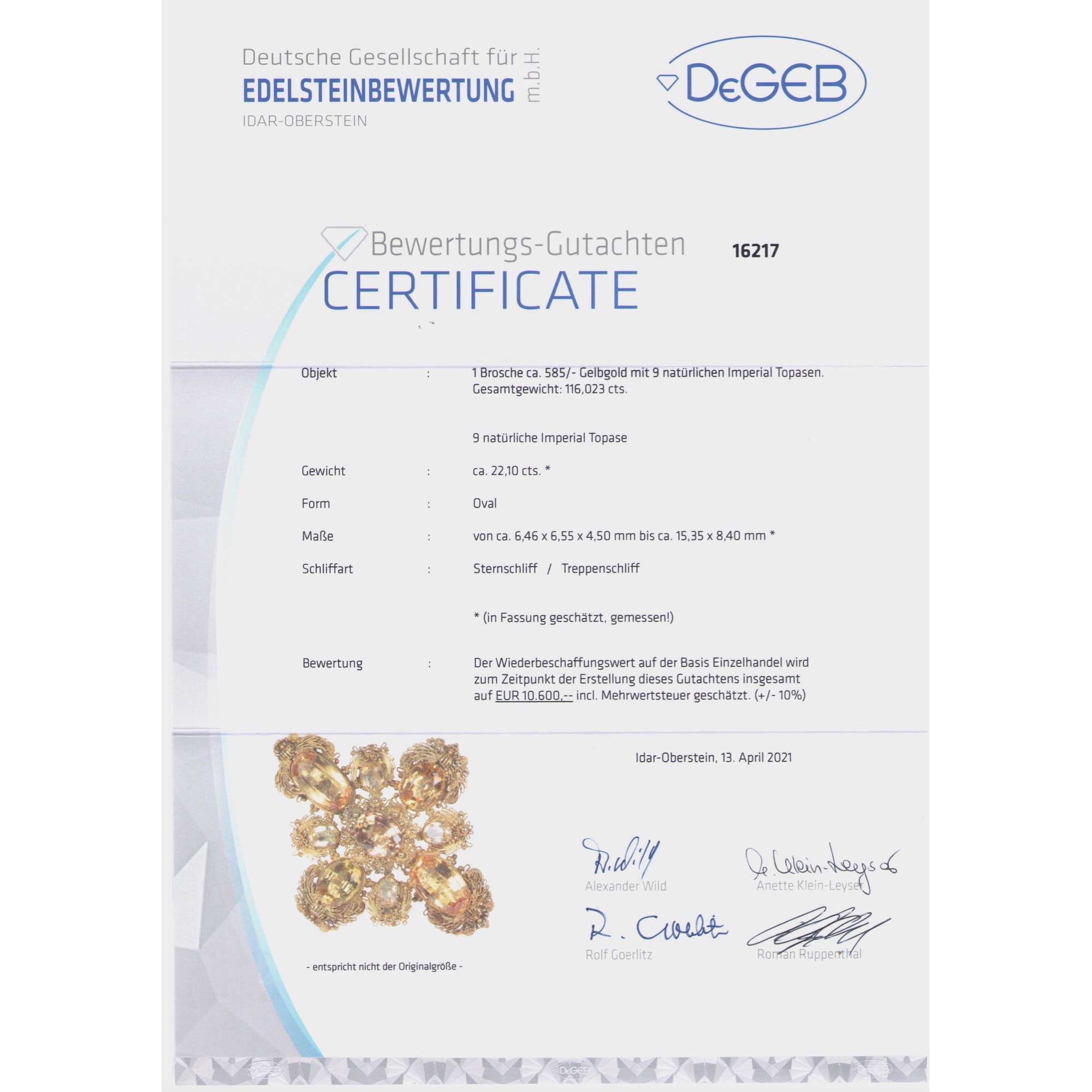 | Material: | Neun natürliche Imperialtopase aus Brasilien, Scherenschliff, oval, zus. etwa 22,10 ct, 6,5 x 6,6 bis max. 8,4 x 15,3 mm Gold etwa 585/000, entspricht 14 Karat Glas, Haar |
