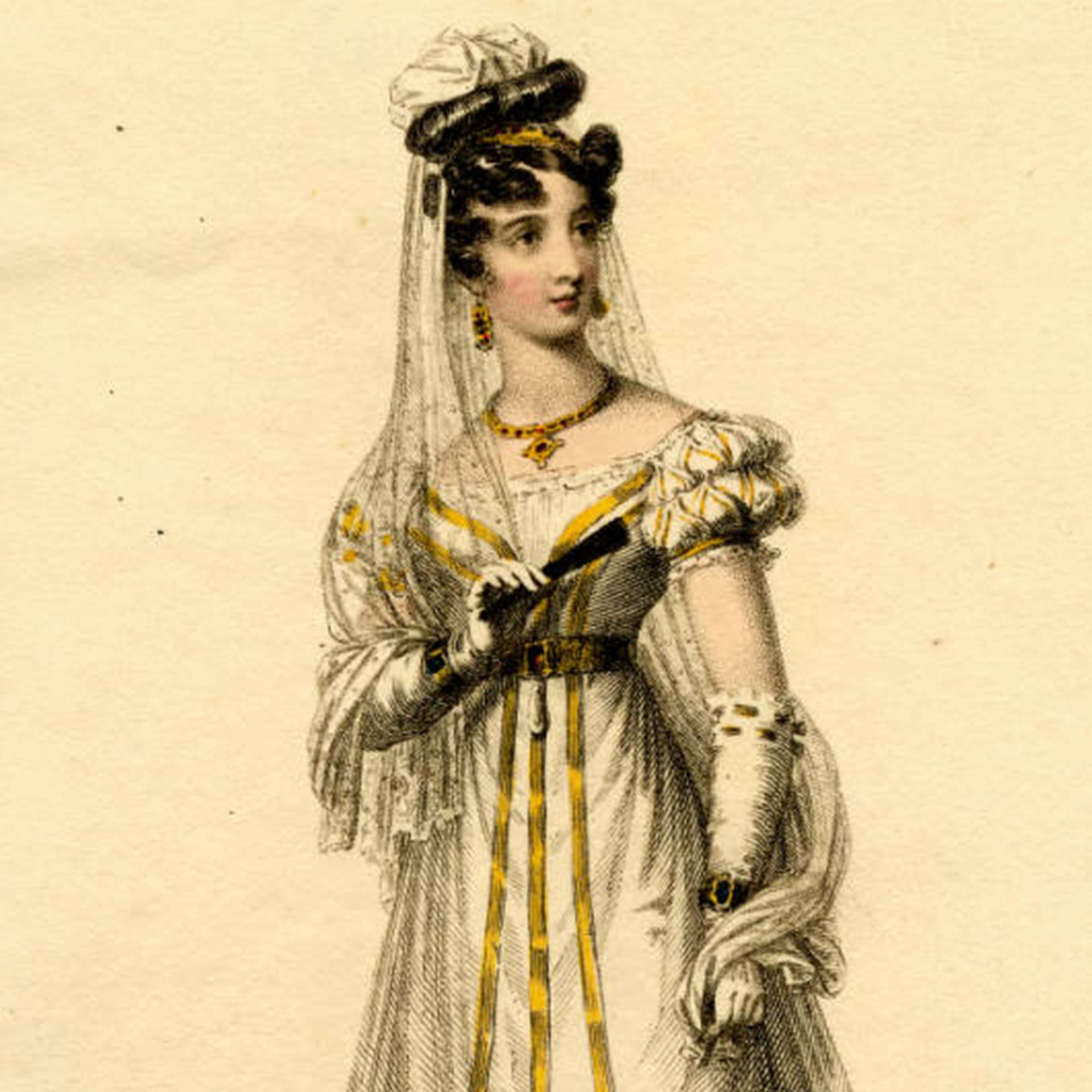 Die Broschierung ist dabei womöglich eine etwas spätere Ergänzung ebenfalls des 19. Jahrhunderts – vermutlich wurde das Juwel einst als Schaustück in ein Collier eingehängt (vgl. hierzu die letzte Abb., ein Modekupfer des Jahres 1827), und auch heute noch erlauben kleine Ösen das Auffädeln auf eine schmale Kette oder ein Band. Einst war das Schmuckstück als festlicher Abendschmuck gedacht, ein Umstand, dem die kostbaren Materialien und die aufwändige Verarbeitung Rechnung tragen.