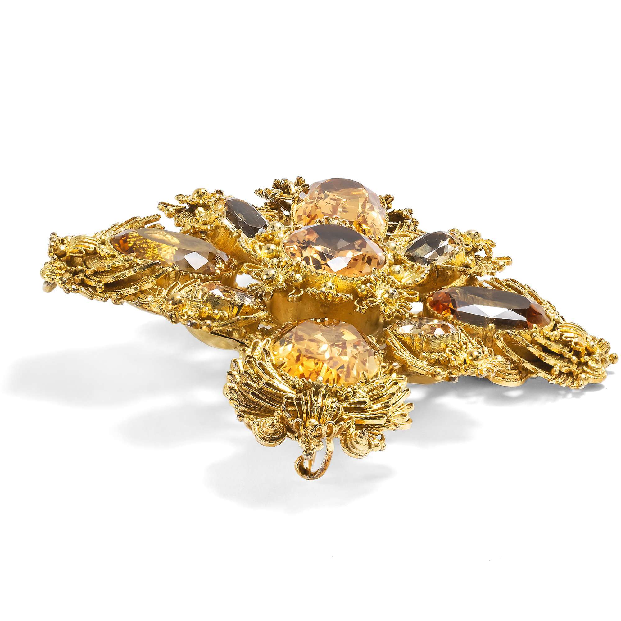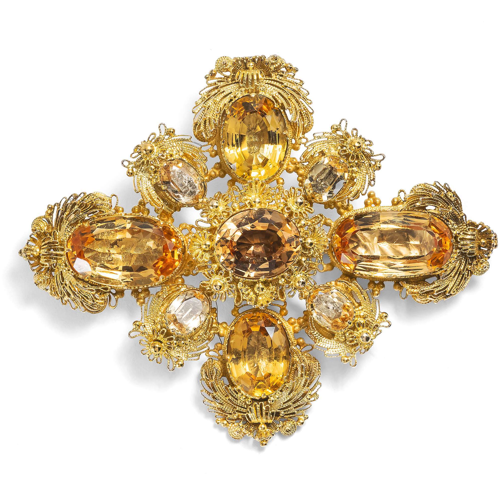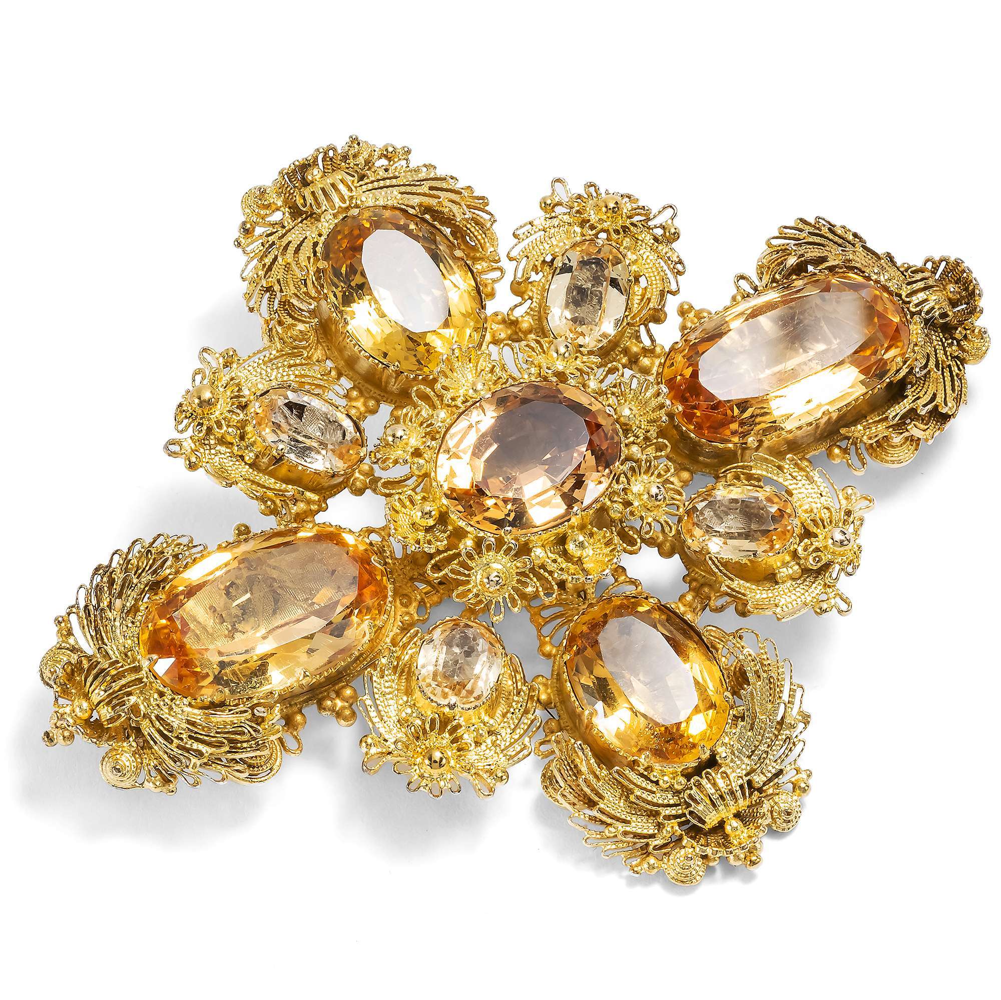 Zum Zeitpunkt der Entstehung der hier vorliegenden Brosche waren Imperialtopase also erst seit wenigen Dekaden bekannt. Umso größer müssen wir die Pracht einschätzen, welche die Brosche entfaltet. Gleich neun dieser Steine sind hier in Gold gefasst, zeittypisch in geschlossenen Fassungen über Folien, welche den Edelsteinen einen besonders intensiven Glanz verleihen. Ihr Farbspektrum reicht von zarten bis hin zu kräftigeren Sherrytönen und der Mittelstein weist eine Pfirsichschattierung auf. Dabei sind sie gut aufeinander abgestimmt worden, denn die Topase in ähnlichen Farben sind einander jeweils im gleichen Schliff gegenübergestellt worden. Insgesamt etwa 22,10 ct wiegen die damals wie heute kostbaren Edelsteine.