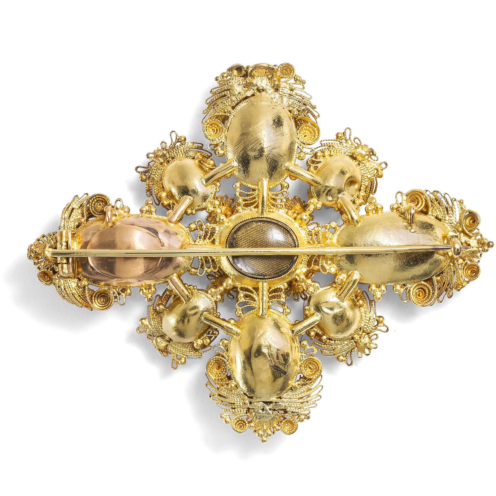 Die Rahmung aus feinsten Golddrähten, sog. Cannetille, war eine Mode der 1820er Jahre. Kleinteilig und detailliert, war die Herstellung dieses Filigrans zeit- und arbeitsintensiv. In jener Zeit jedoch war Handarbeit günstiger als das kostbare Edelmetall Gold, sodass in vielen Arbeitsstunden mit nur relativ wenig Material große, prunkvolle Entwürfe gefertigt wurden.